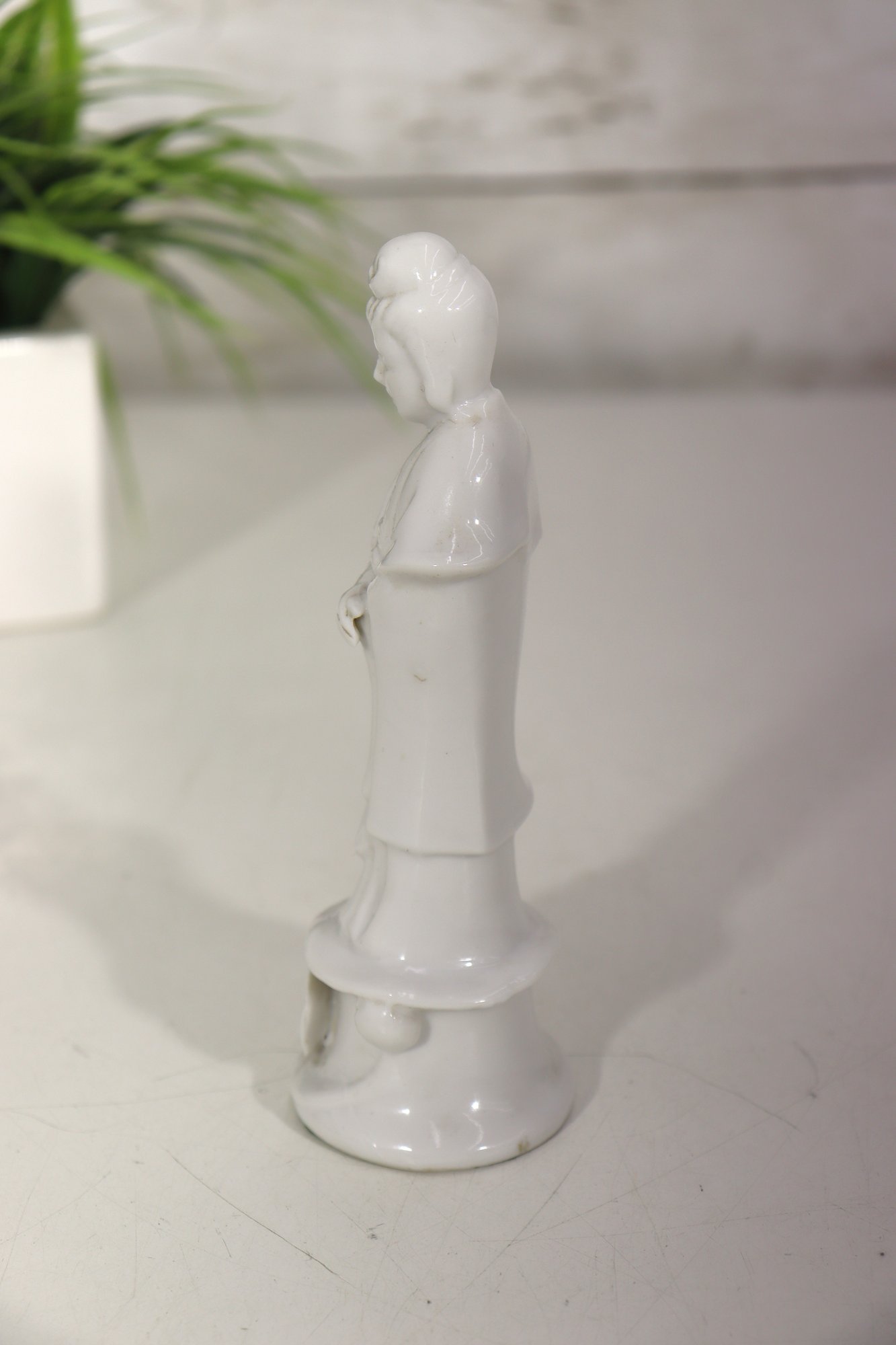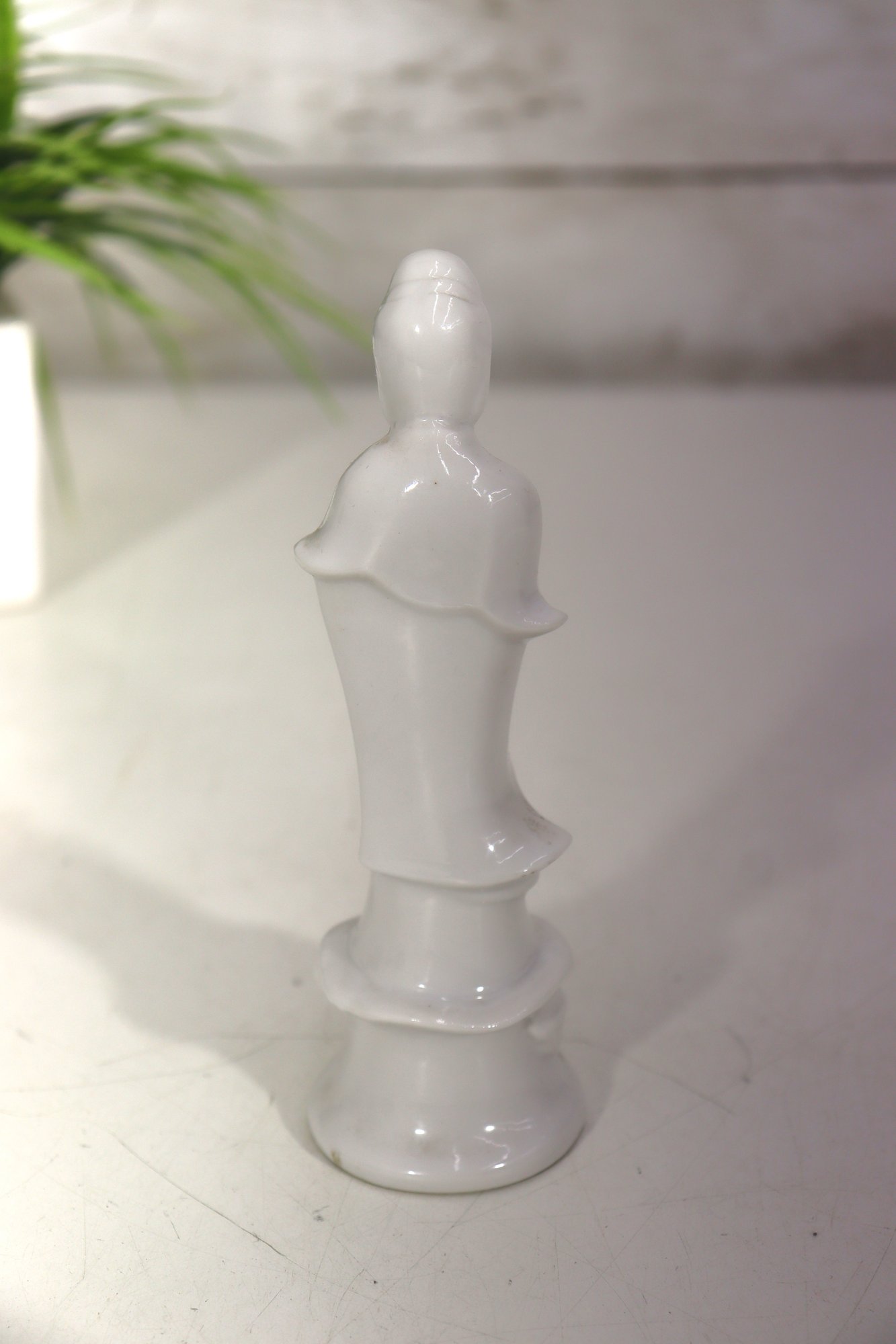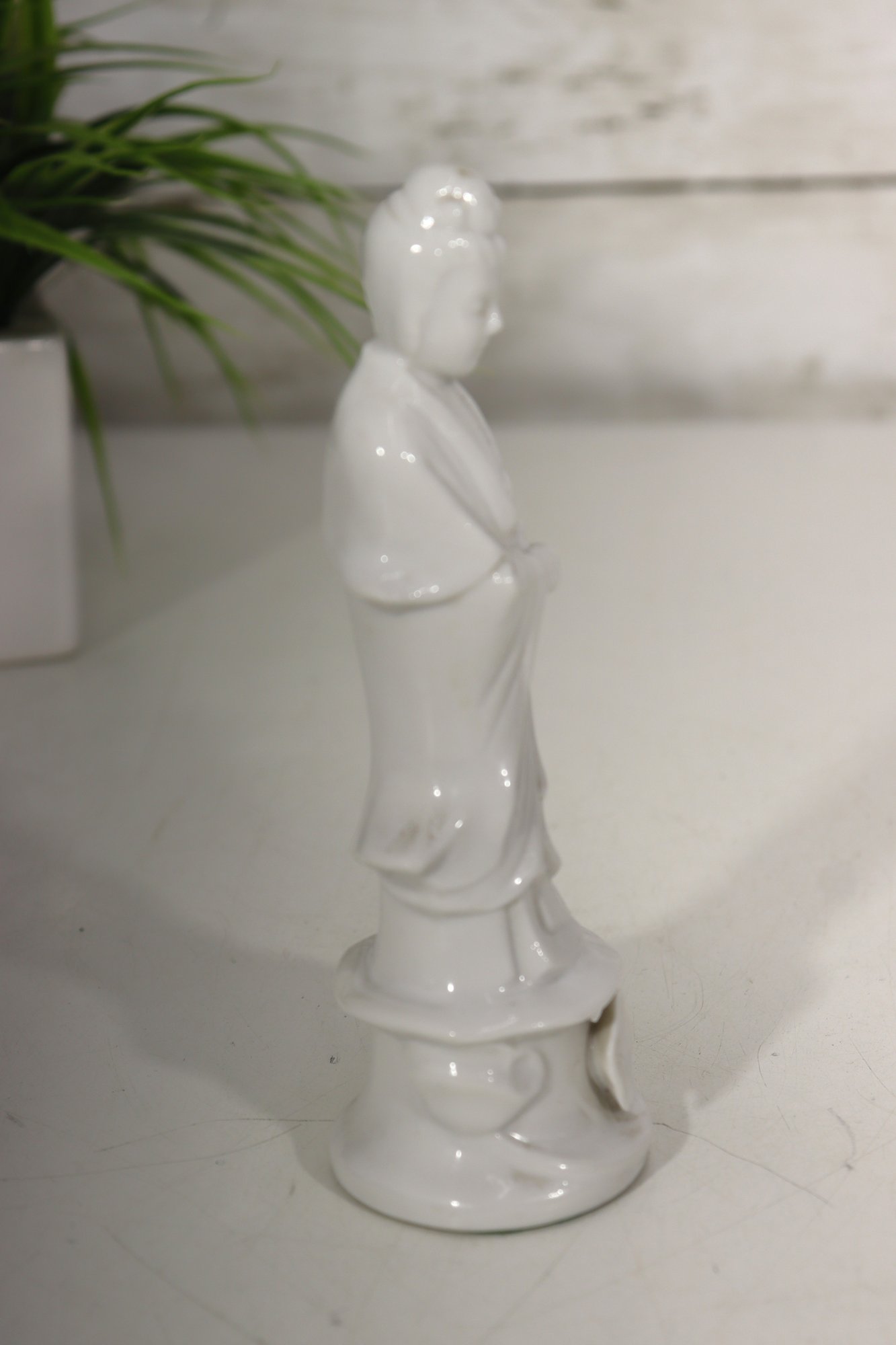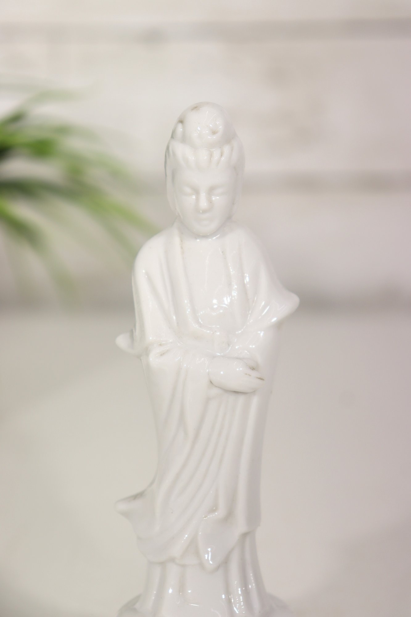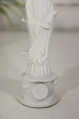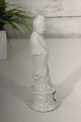Beautiful vintage white glazed porcelain Asian goddess / Guanyin style figurine. Elegant flowing robe detail, peaceful facial expression, and serene stance. Gloss finish with subtle sculptural styling.