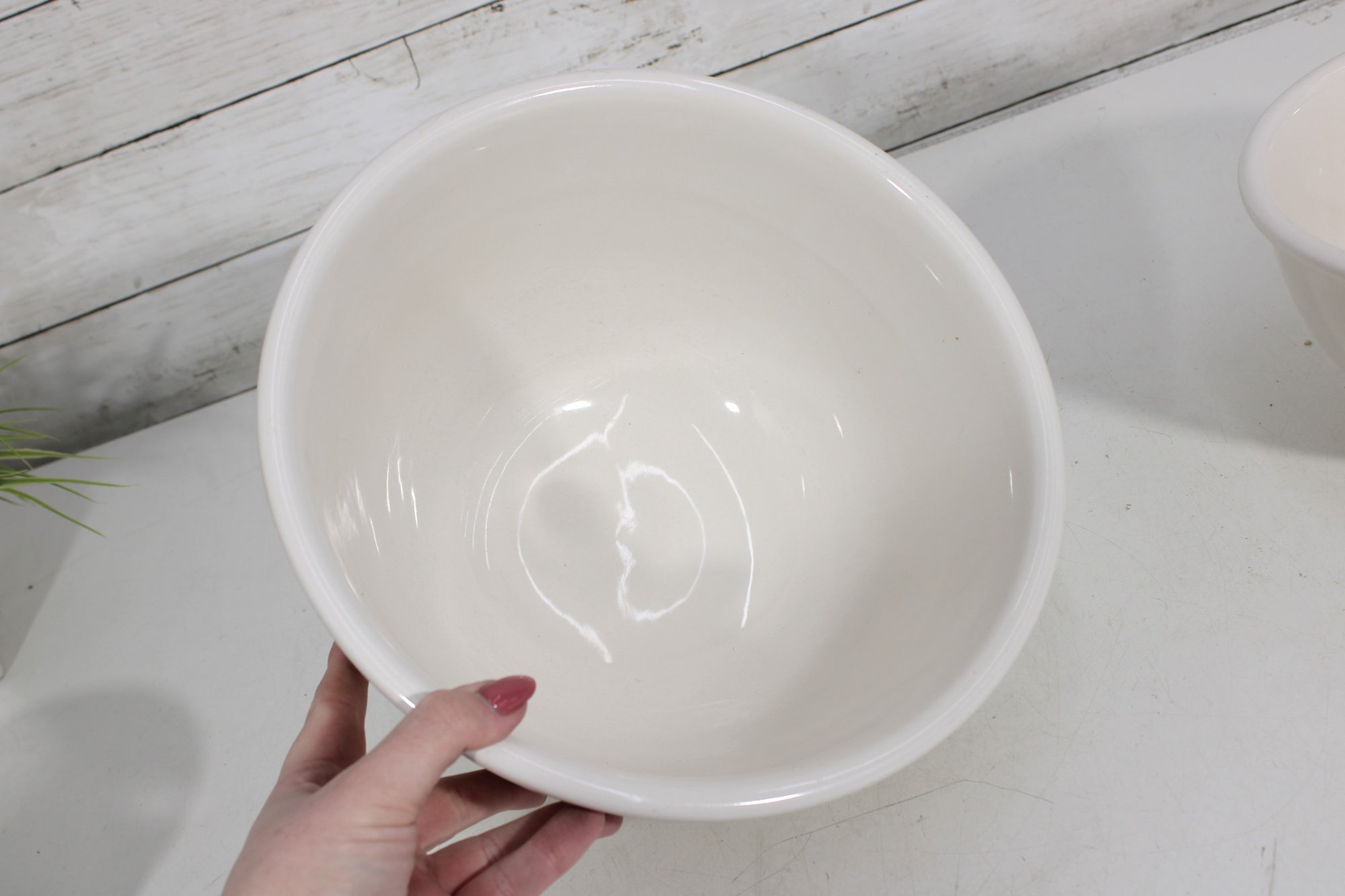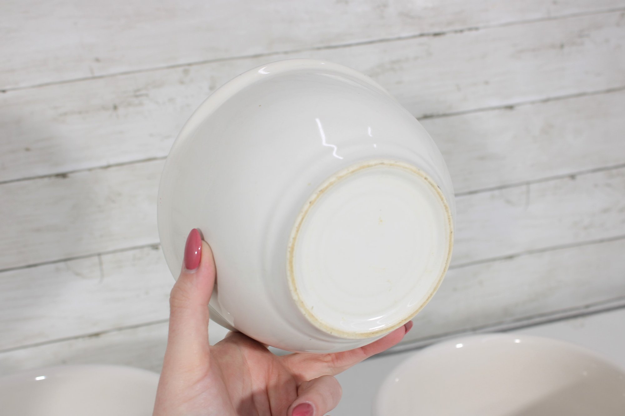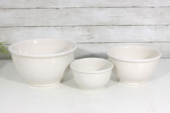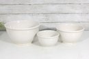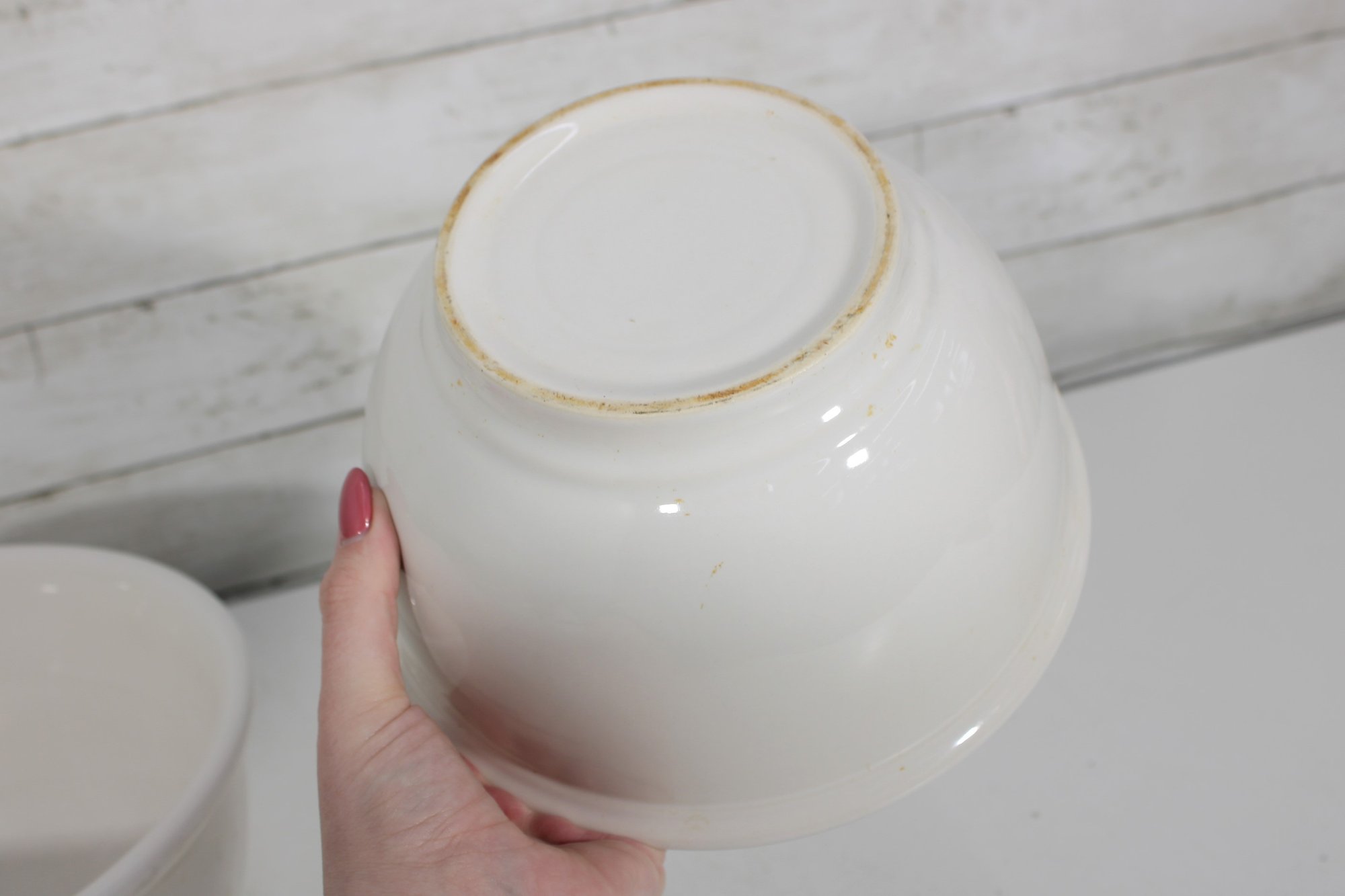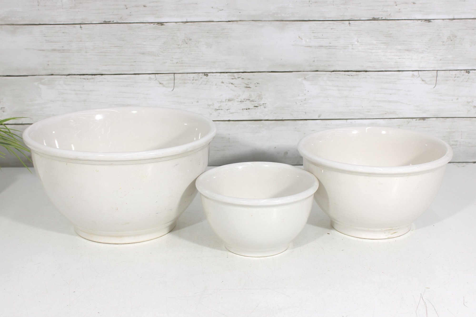 Classic set of three vintage white stoneware mixing bowls in graduated sizes. These bowls feature a simple, timeless design with a smooth glazed finish, making them perfect for both everyday kitchen use and farmhouse-style décor.