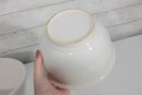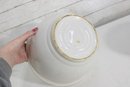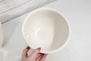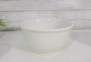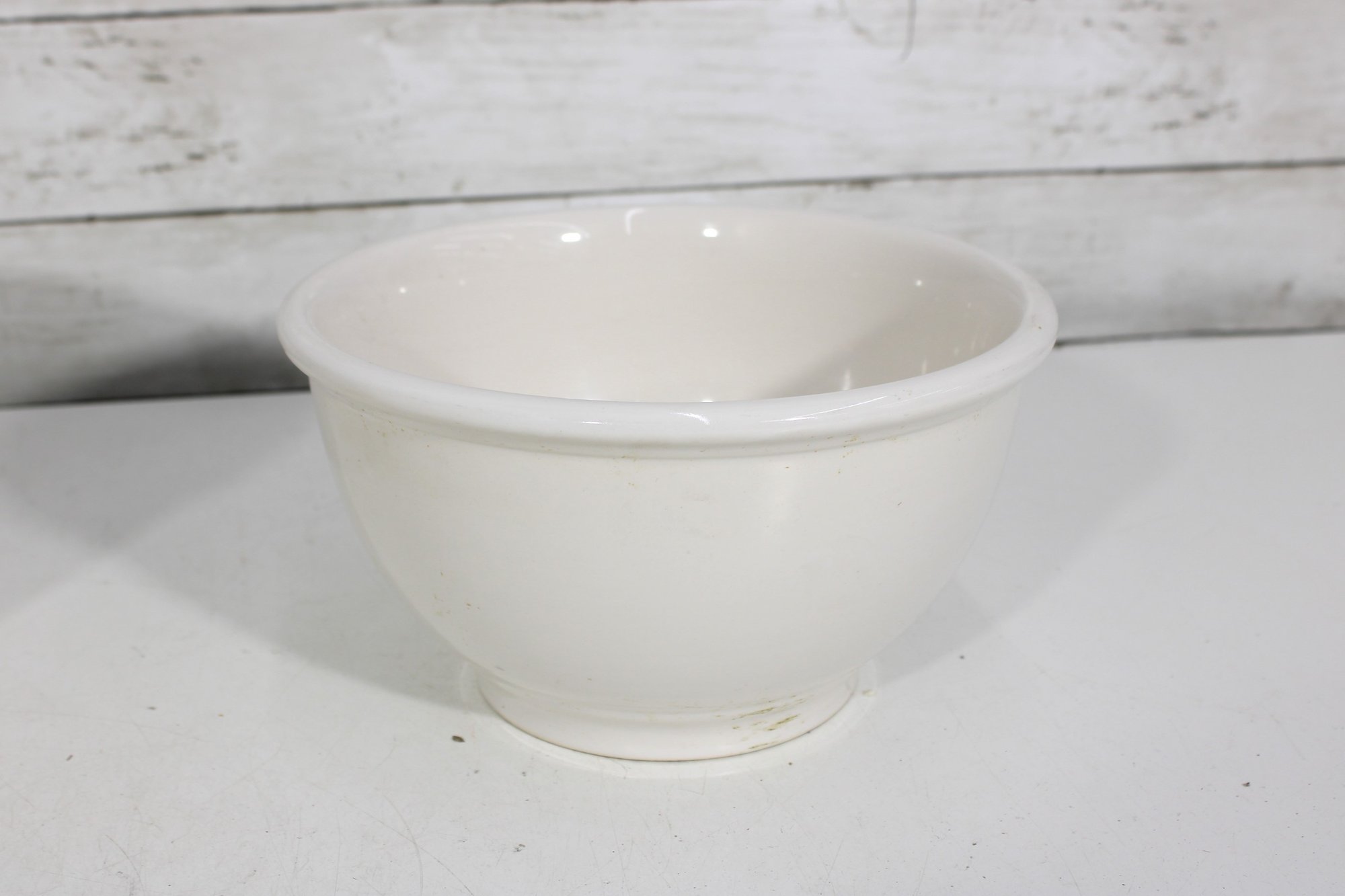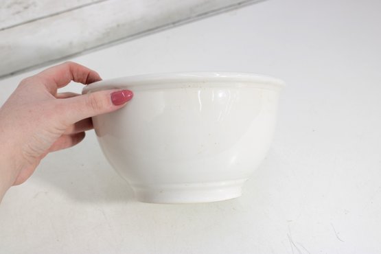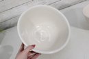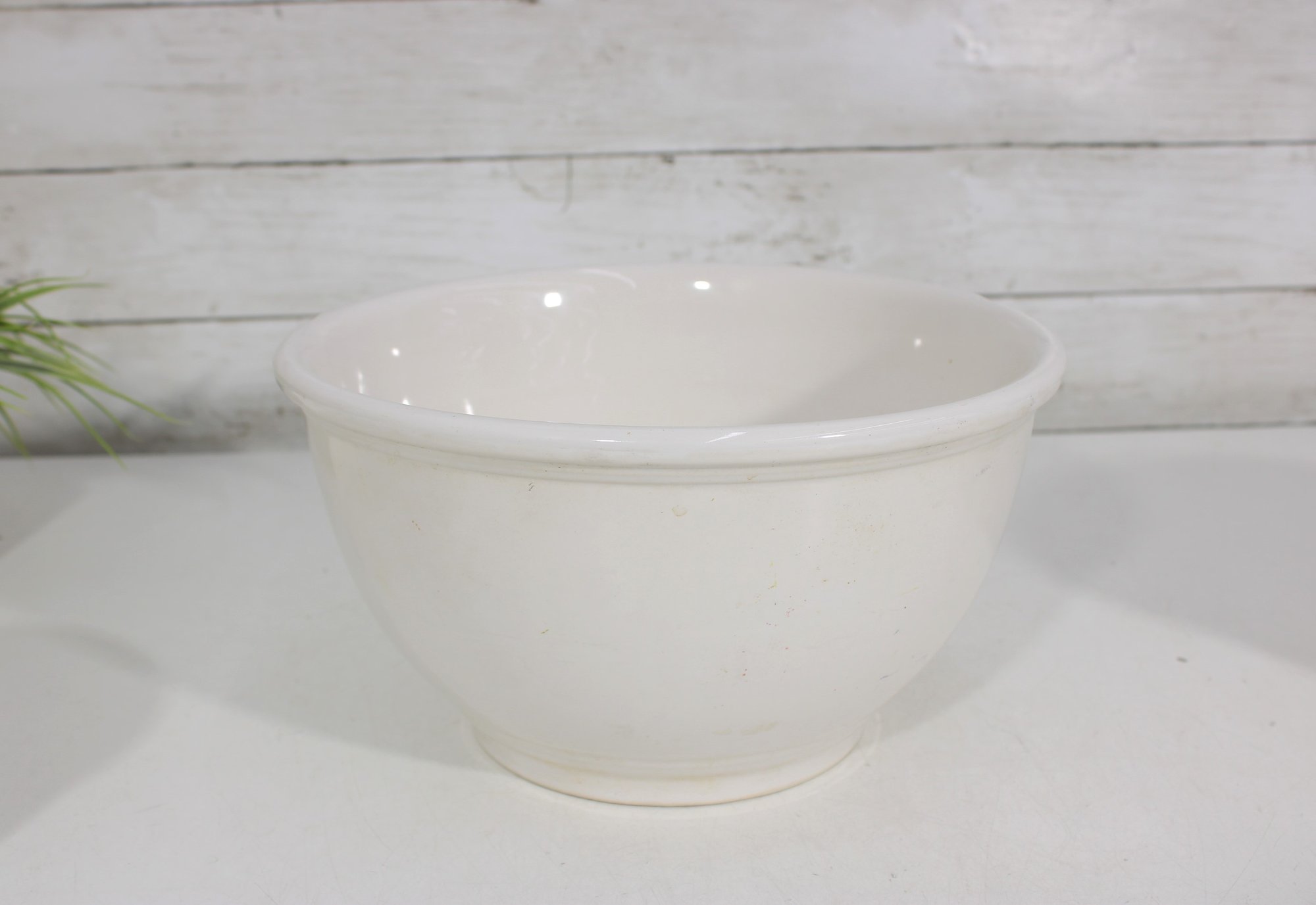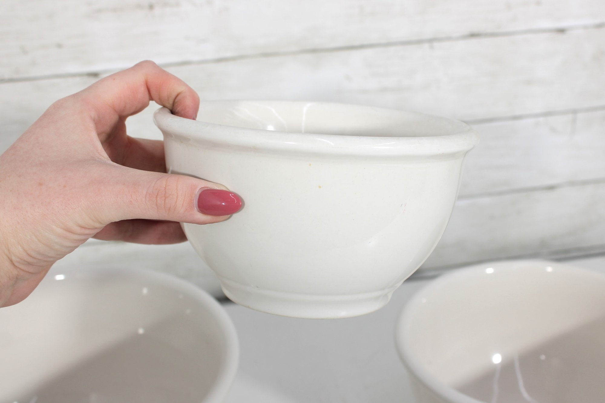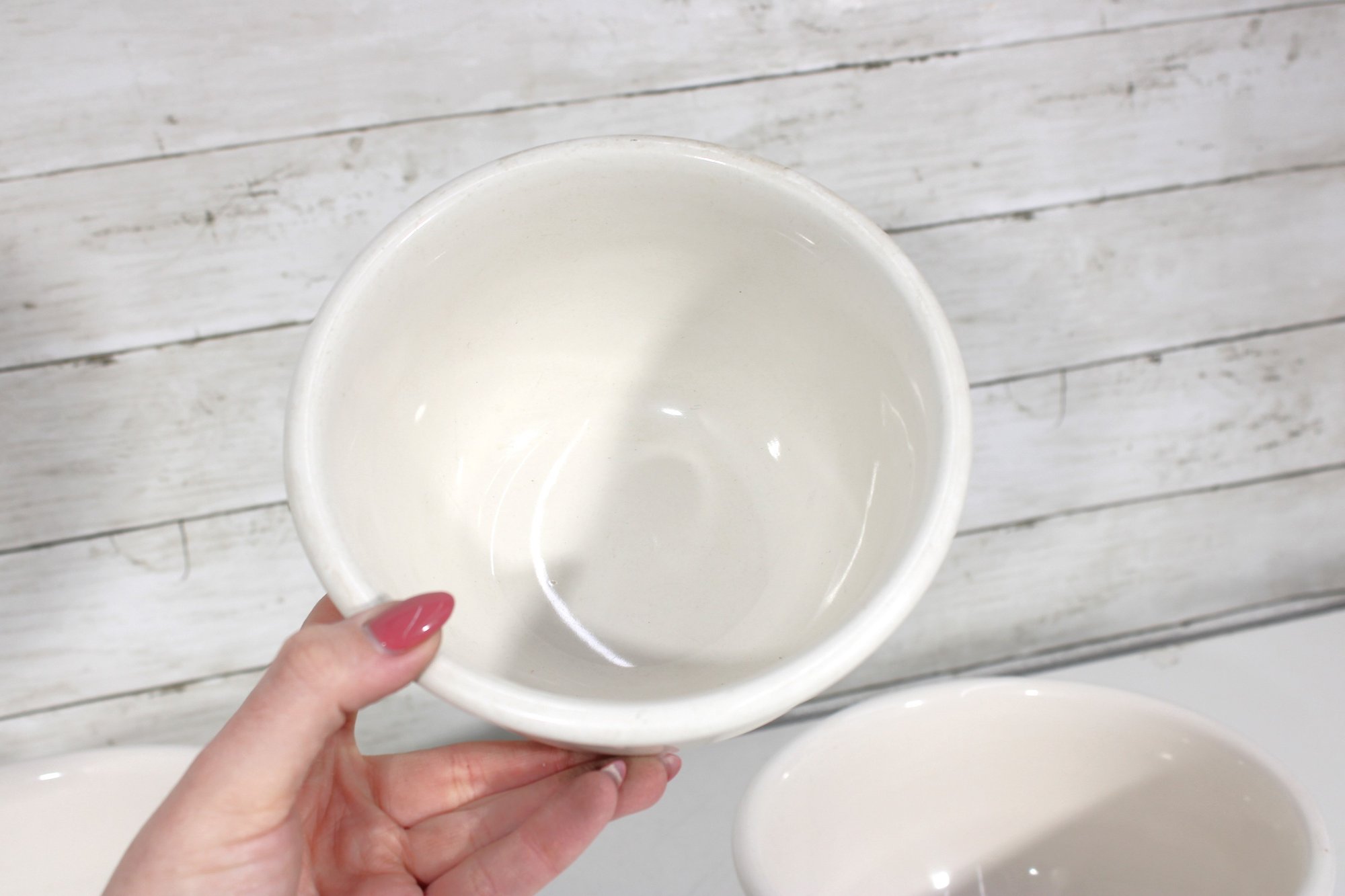 Classic set of three vintage white stoneware mixing bowls in graduated sizes. These bowls feature a simple, timeless design with a smooth glazed finish, making them perfect for both everyday kitchen use and farmhouse-style décor.