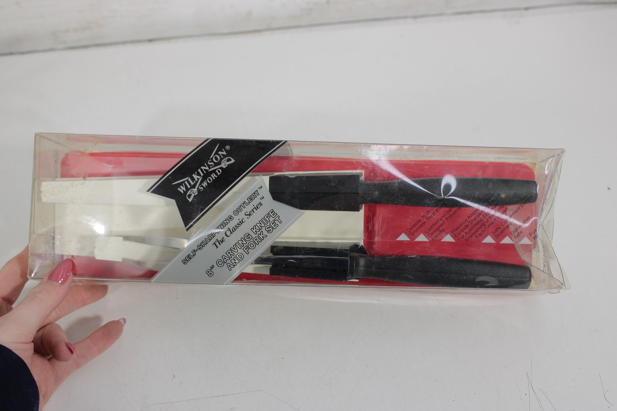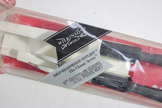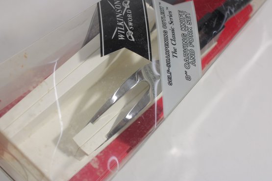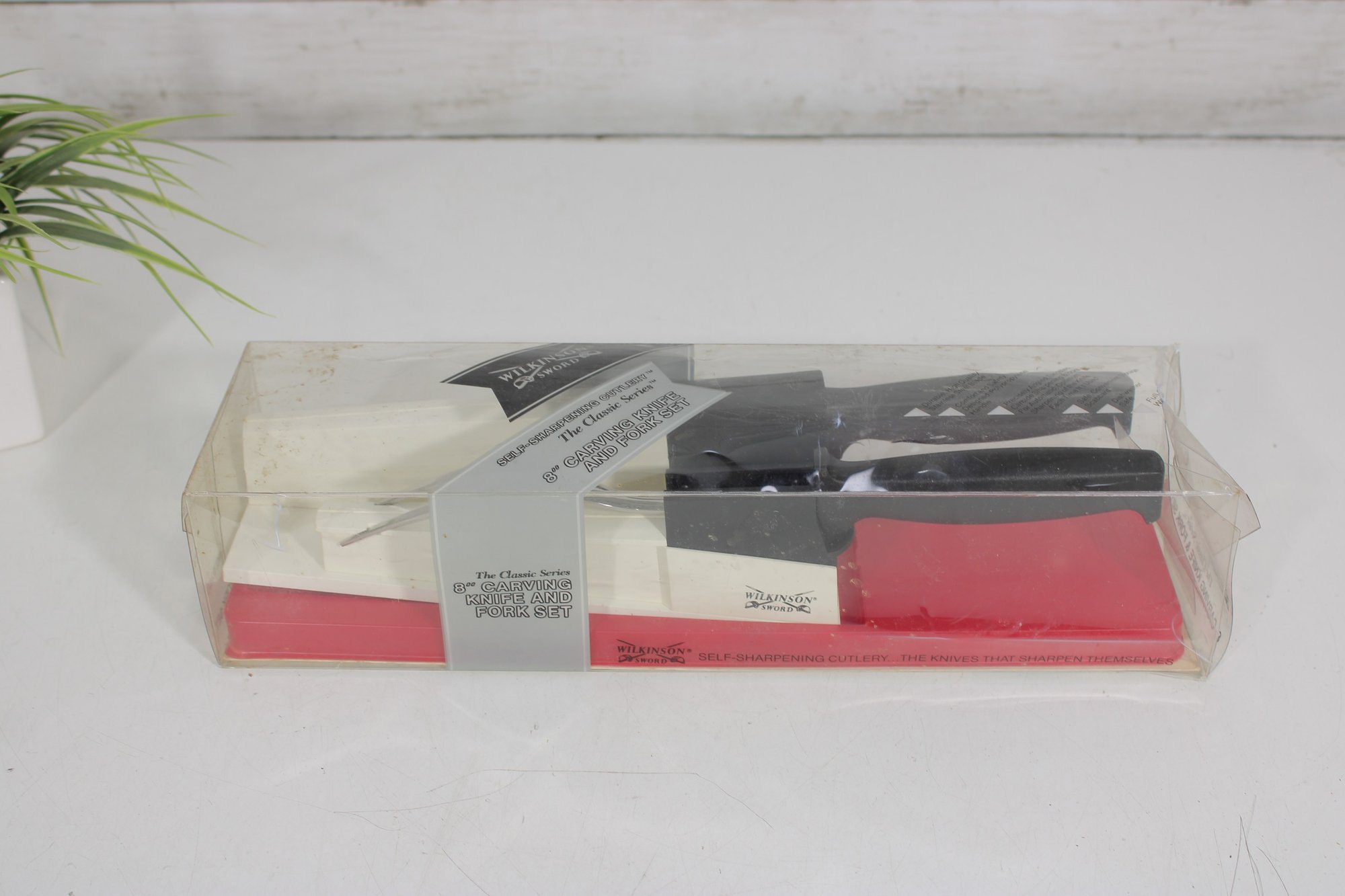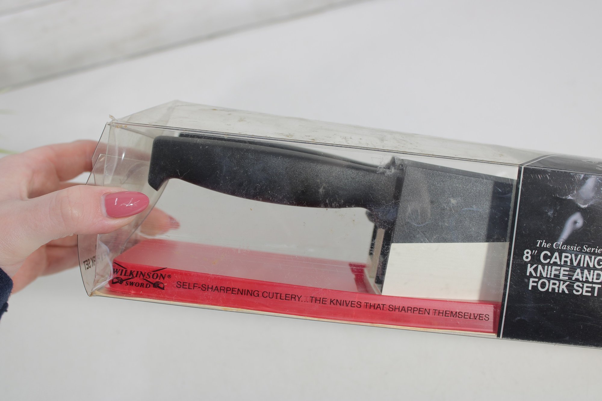 Classic vintage Wilkinson Sword carving knife and fork set, presented in the original packaging. This quality set includes an 8-inch carving knife and matching fork, designed for precision slicing and serving.