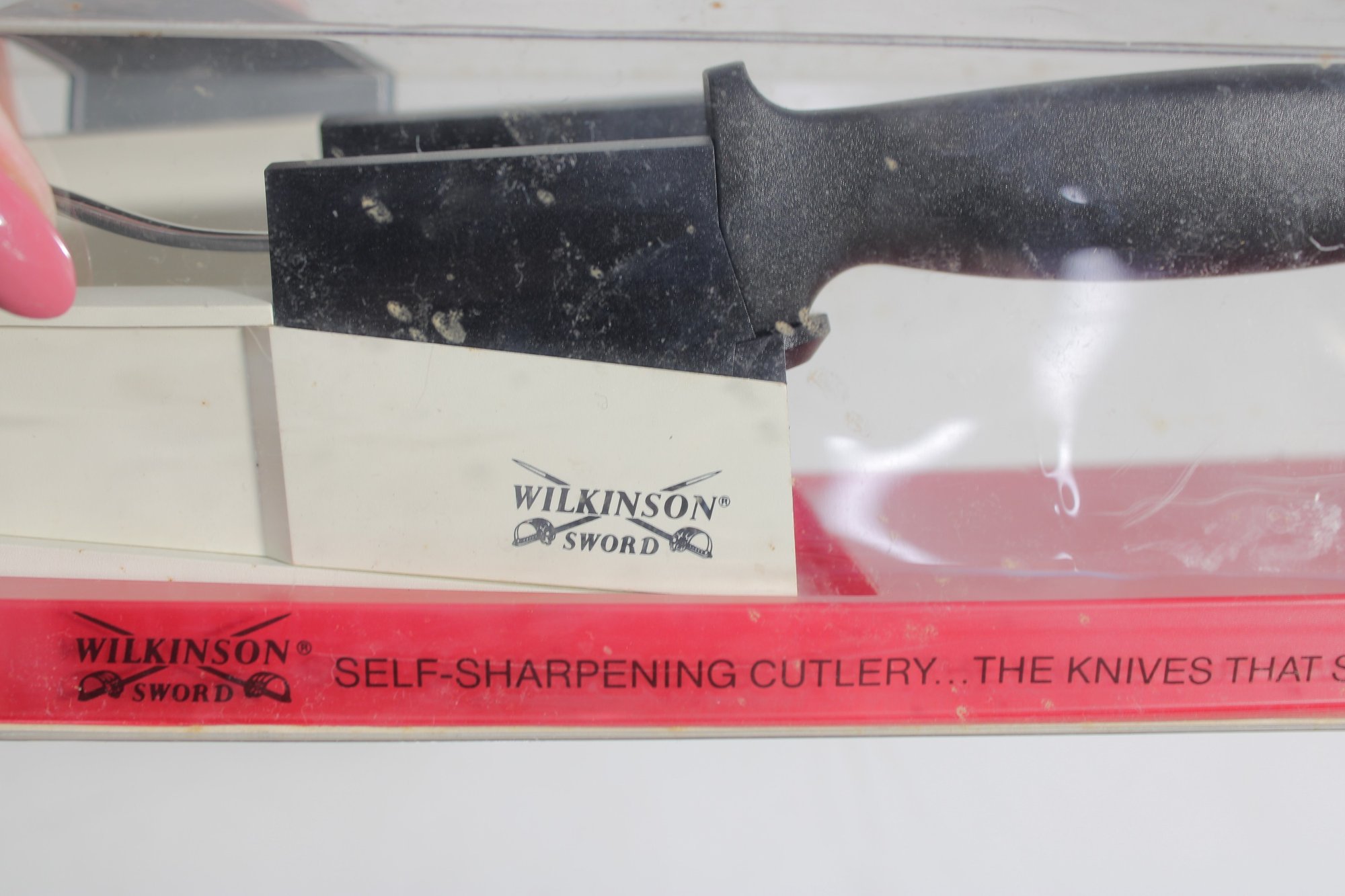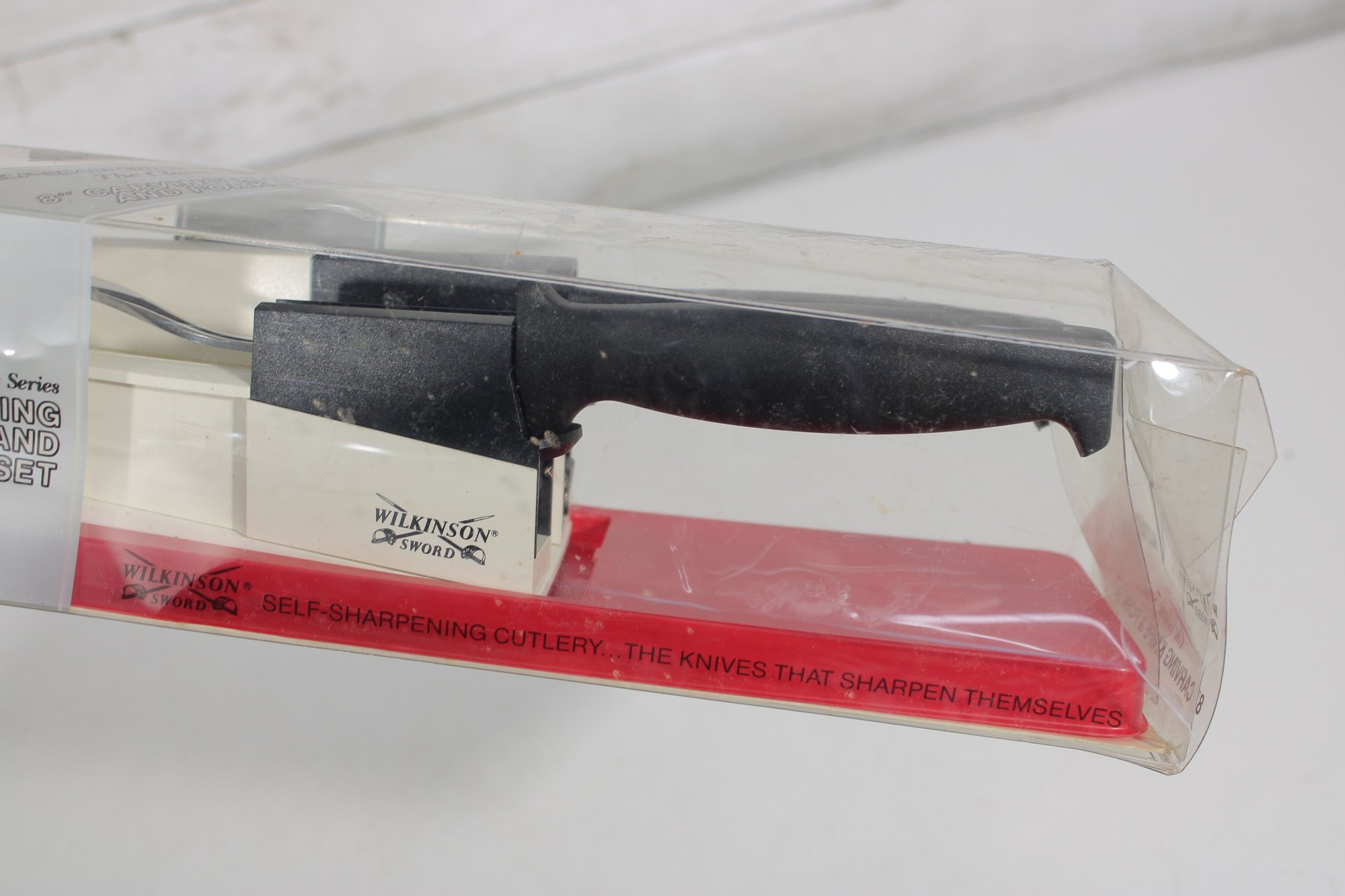Known for their craftsmanship, Wilkinson Sword cutlery features durable stainless steel blades and ergonomic handles. The packaging highlights the self-sharpening cutlery concept, making this both a functional kitchen tool and a collectible piece.