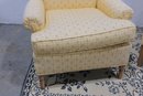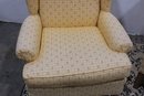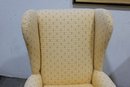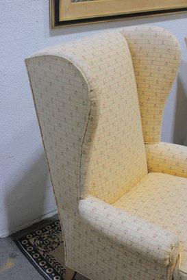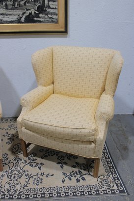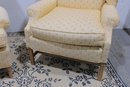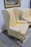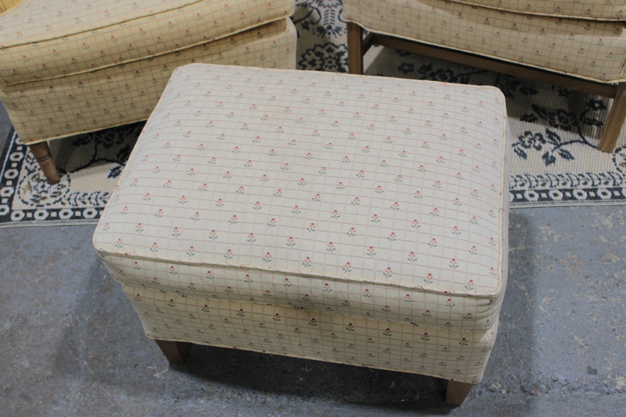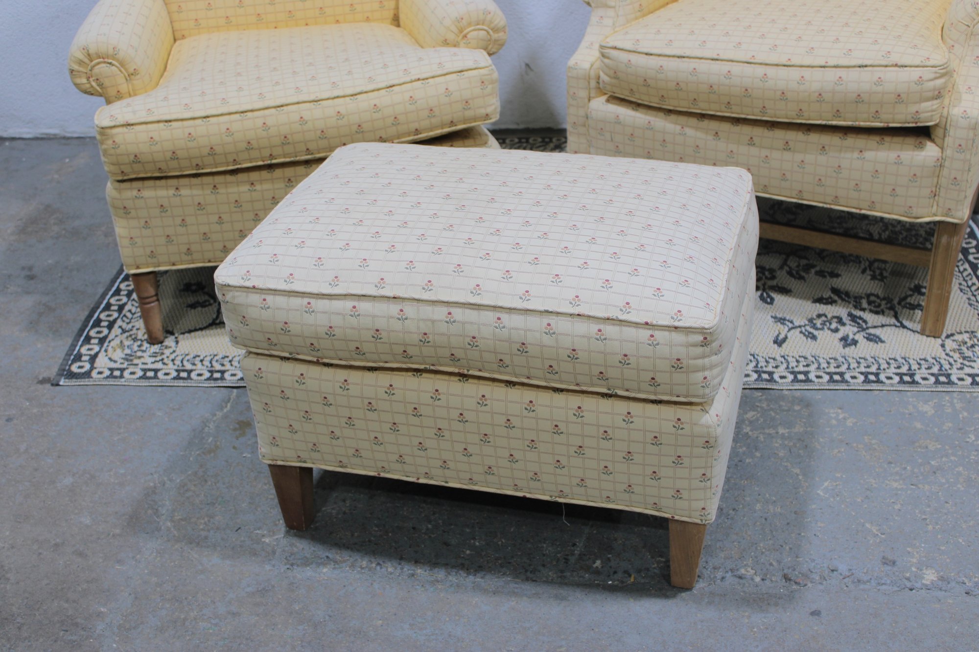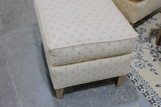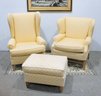 Charming vintage seating set consisting of a classic wingback armchair, coordinating lounge chair, and matching upholstered ottoman. The set features a soft cream upholstery with a subtle repeating pattern that gives the pieces a warm, traditional look suitable for a variety of interiors.