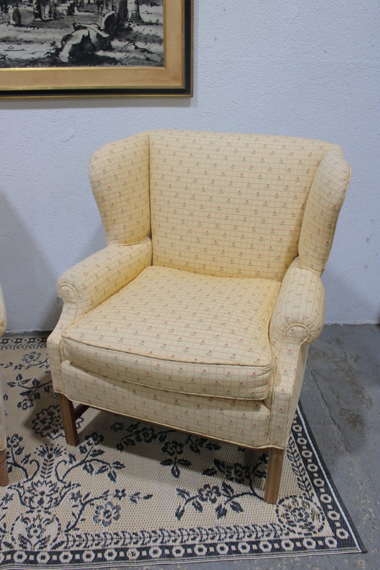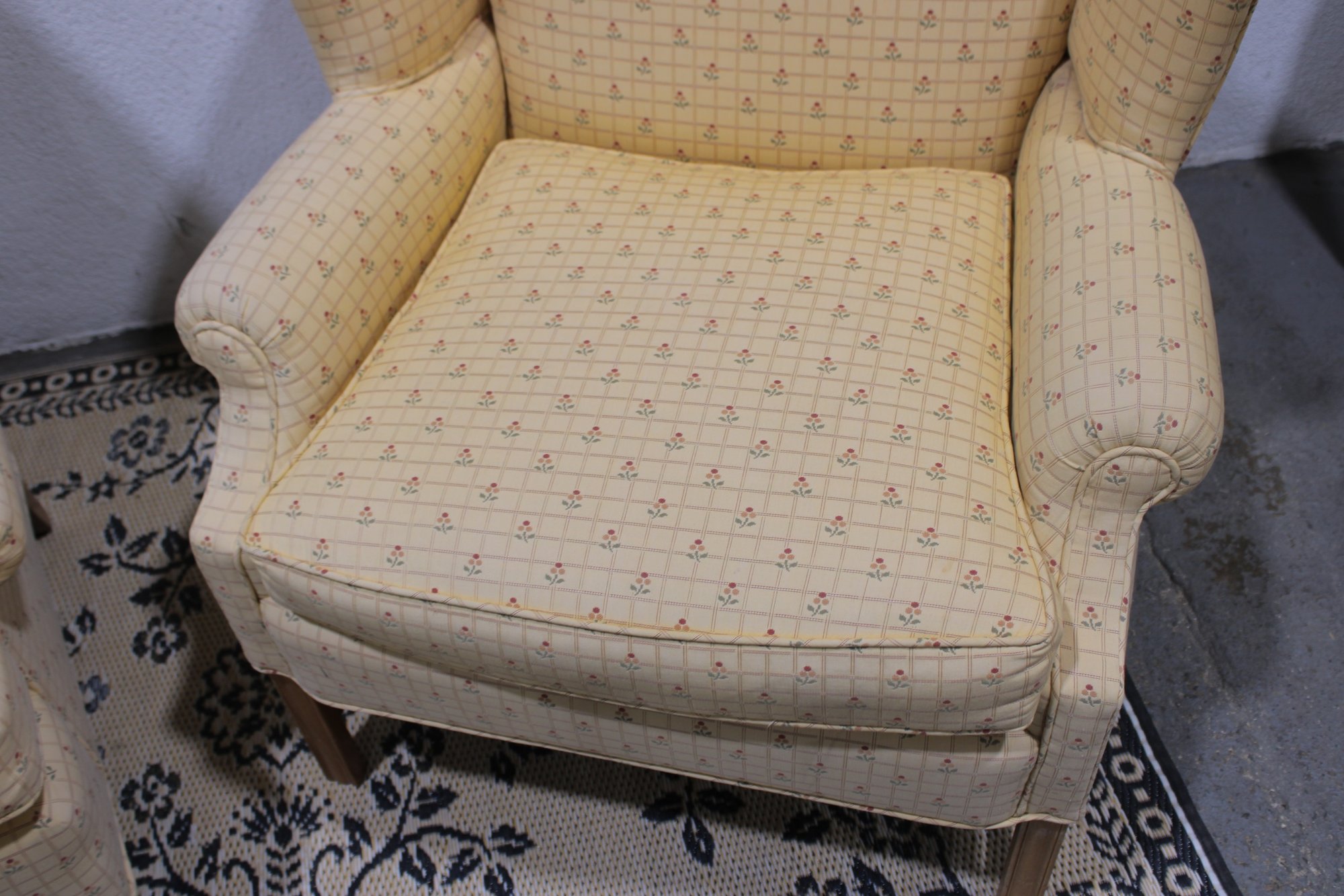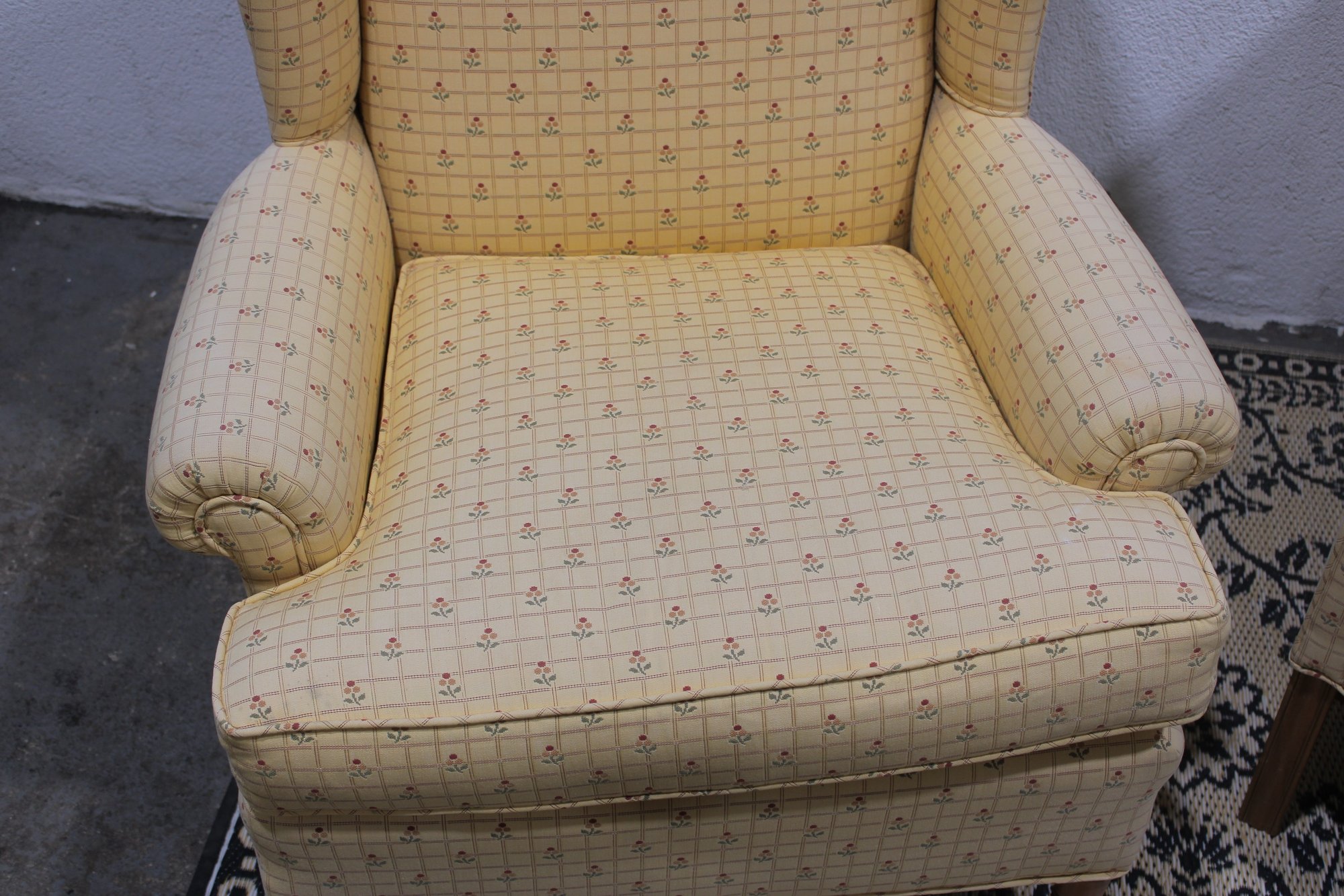 All three pieces feature sturdy wooden legs and well-padded seats. The upholstery shows light wear consistent with age and use, but remains attractive and usable.
