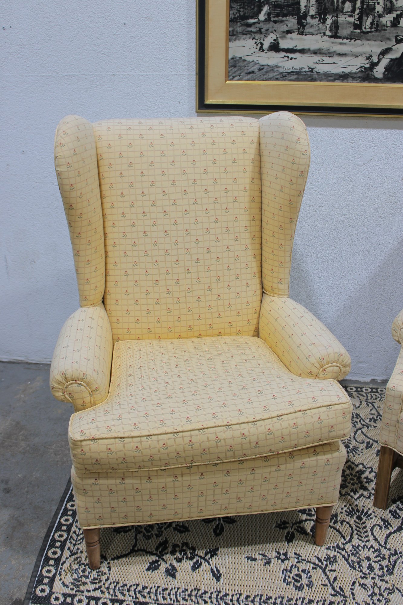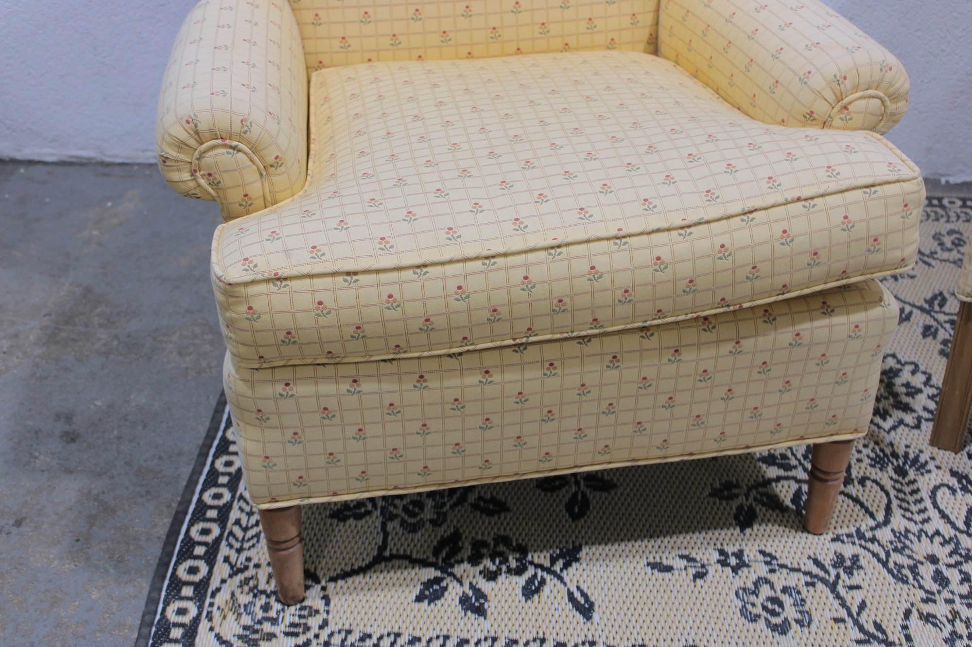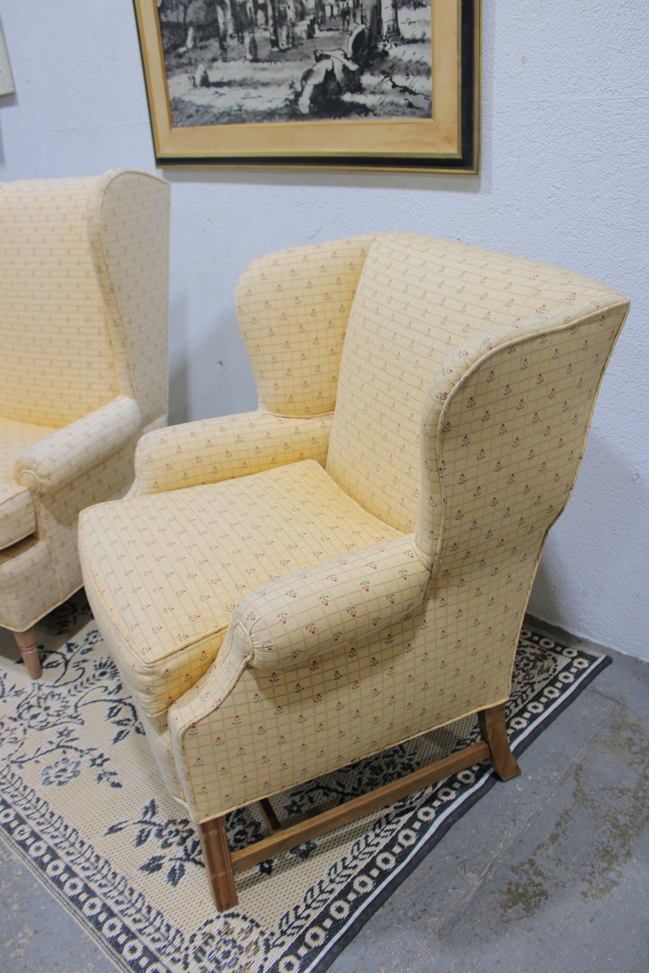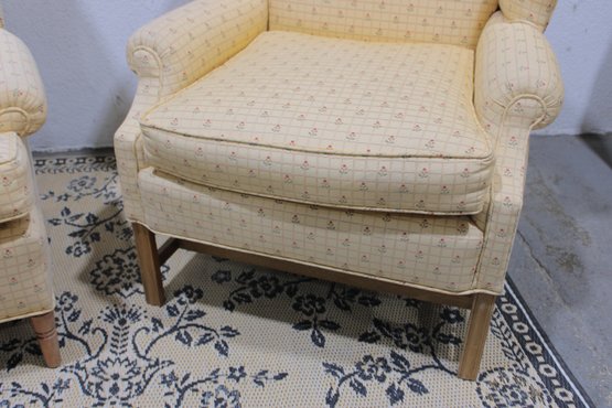 All three pieces feature sturdy wooden legs and well-padded seats. The upholstery shows light wear consistent with age and use, but remains attractive and usable.