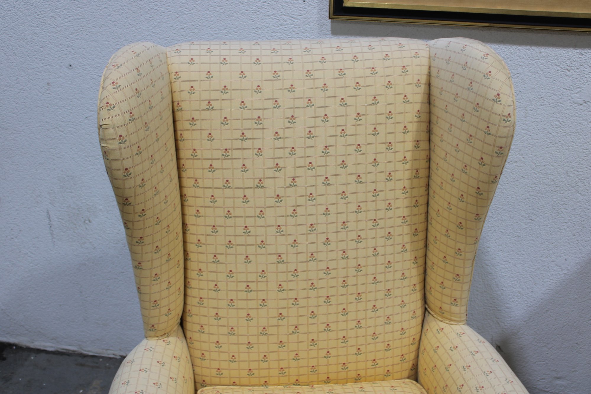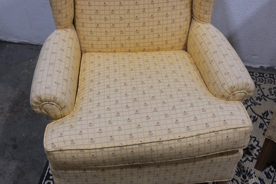 The wingback chair showcases the timeless high-back design with gently curved wings and rolled arms, offering both comfort and classic style. The accompanying lounge chair features a lower, wider profile with the same upholstery, making it an excellent companion piece for relaxing or reading. Completing the set is a matching ottoman with a removable cushion top and tapered wood legs.