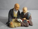 Crafted with an eye for detail, the statue depicts an aged man and woman in traditional Japanese attire, immersed in a shared activity. The man, with a flowing beard and kind expression, seems to impart knowledge from a scroll, while the woman, her demeanor attentive, follows along
