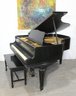 A classic baby grand piano with a glossy black finish and intricate details.