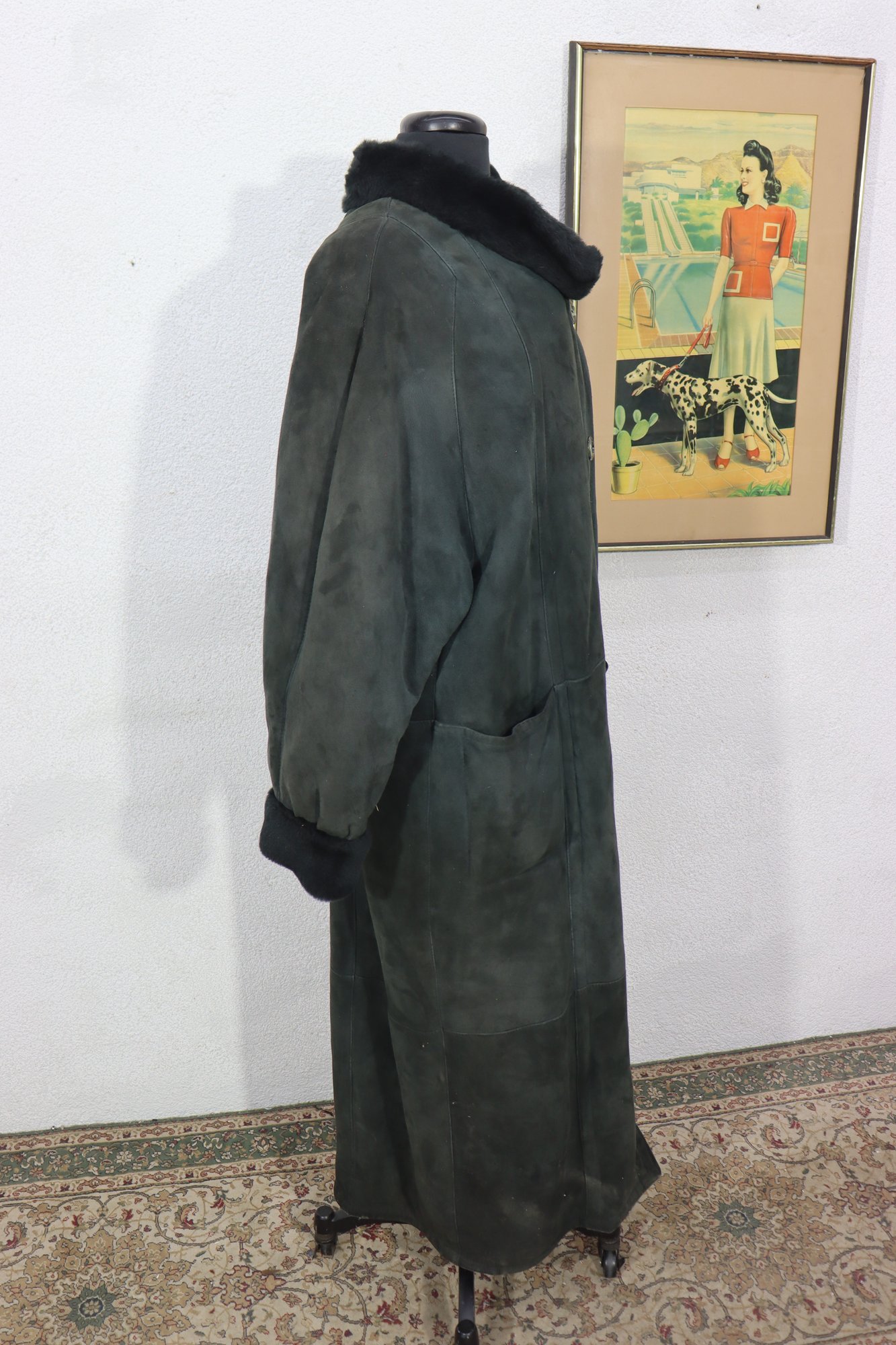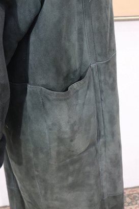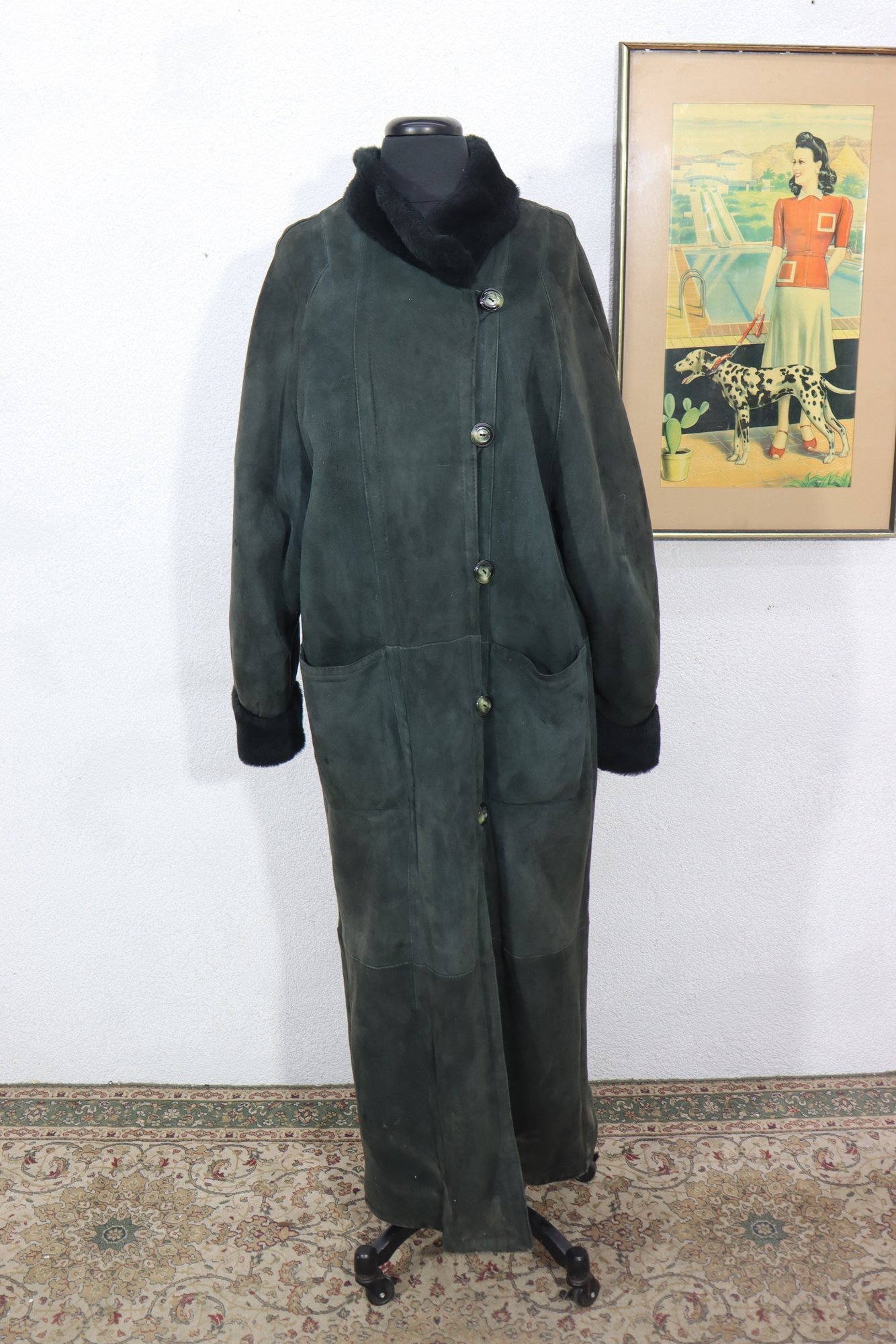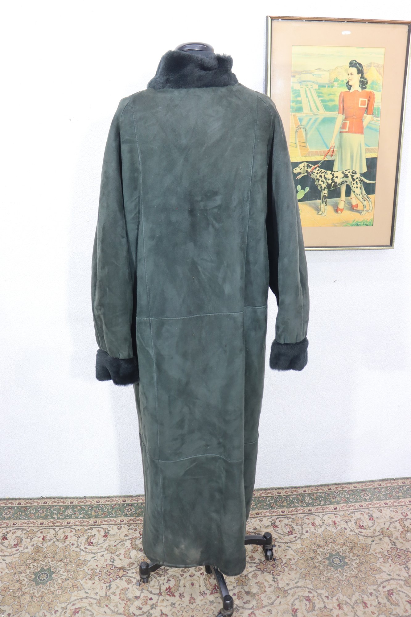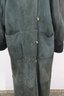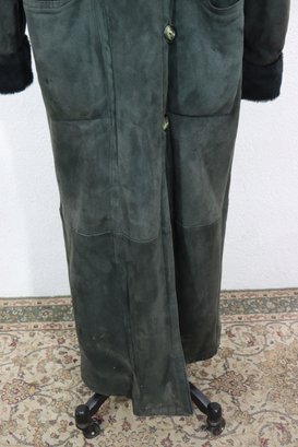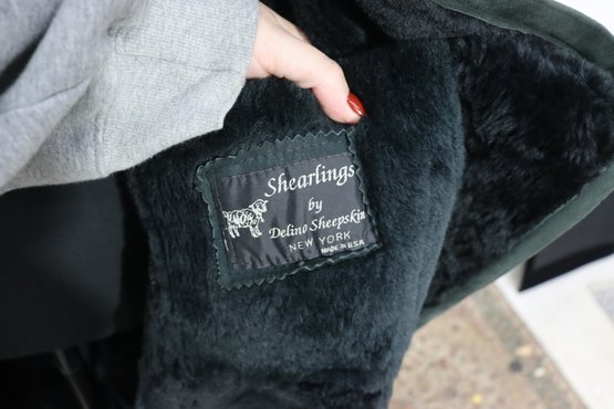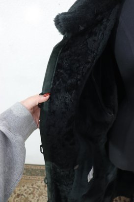 a beautiful vintage women’s full length genuine shearling coat by Deluxe Sheepskin New York. Size Medium. This coat features gorgeous dark green suede exterior paired with plush black shearling fur interior, cuffs, and collar. Heavy, warm, luxurious and classic winter elegance.