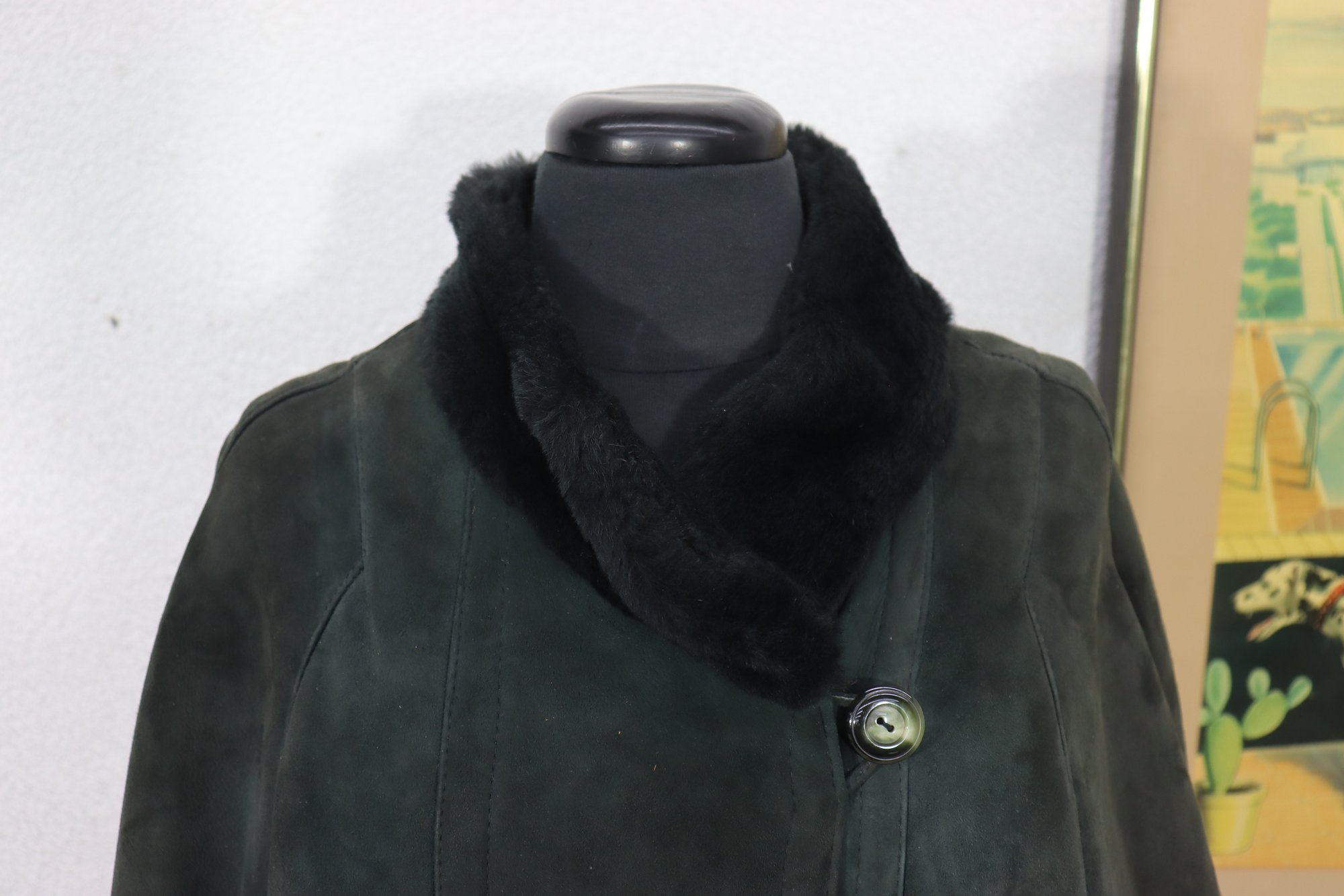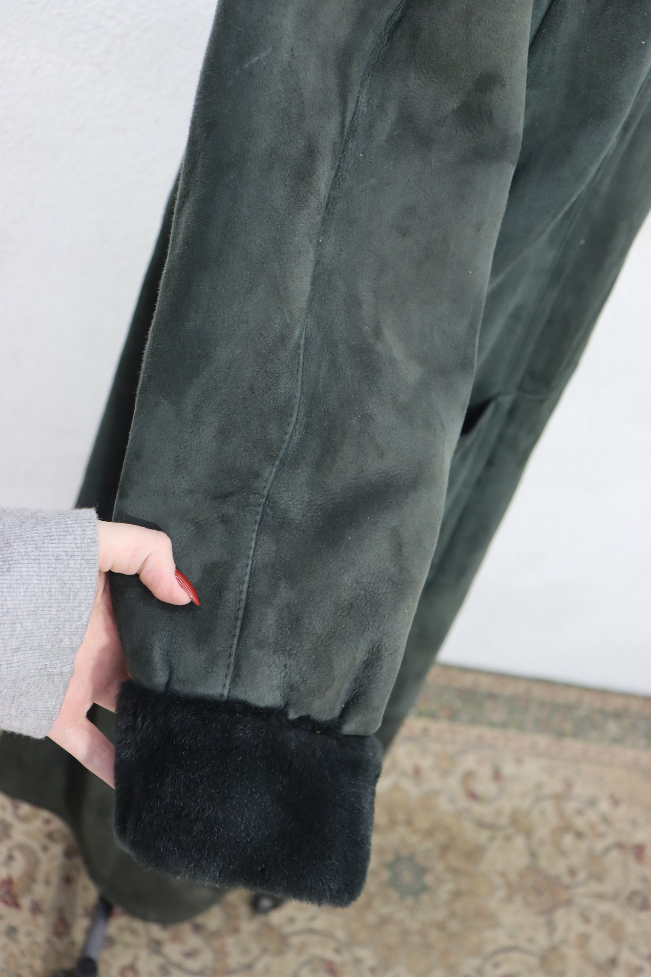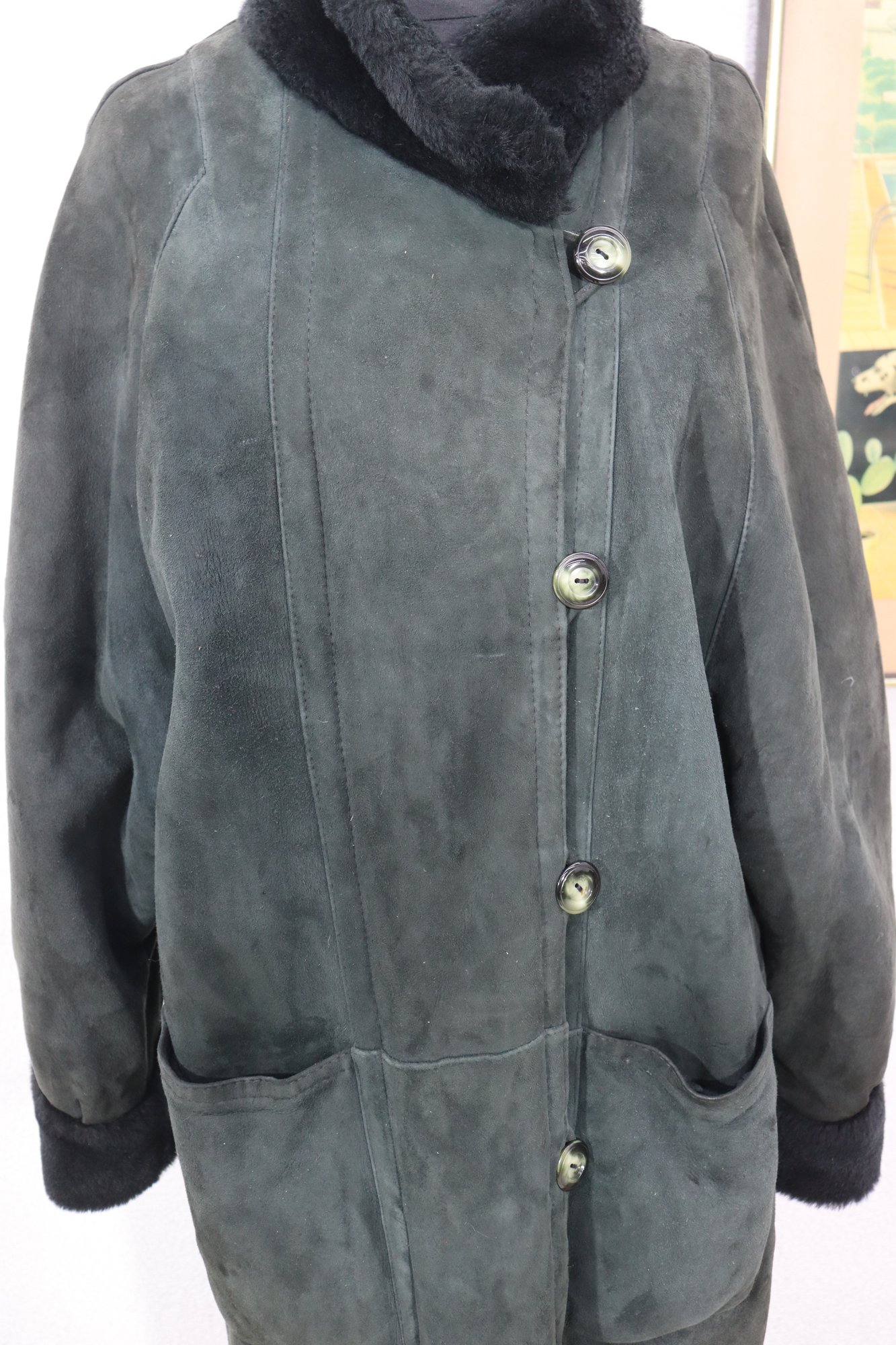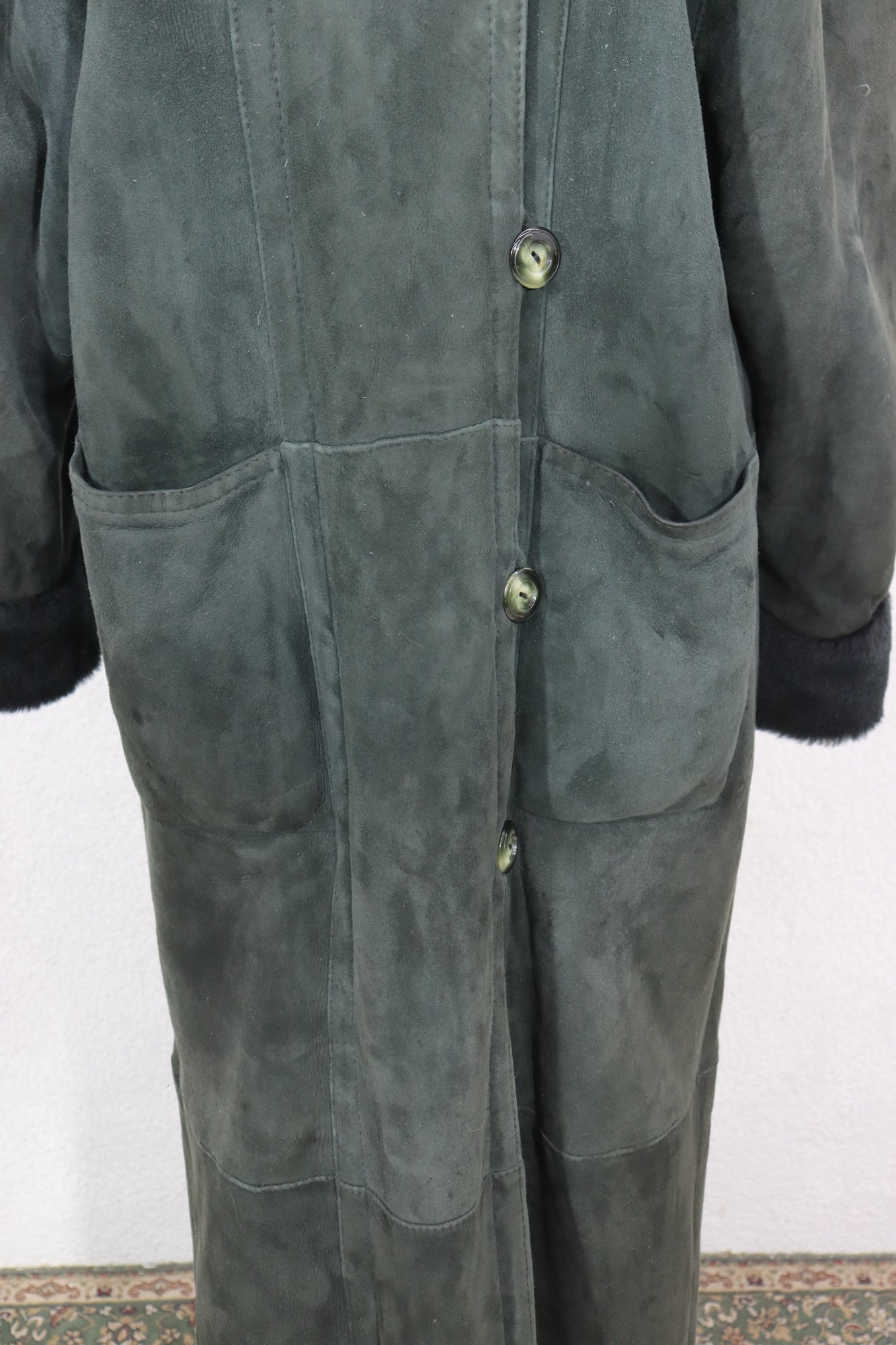 a beautiful vintage women’s full length genuine shearling coat by Deluxe Sheepskin New York. Size Medium. This coat features gorgeous dark green suede exterior paired with plush black shearling fur interior, cuffs, and collar. Heavy, warm, luxurious and classic winter elegance.