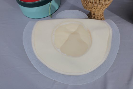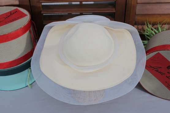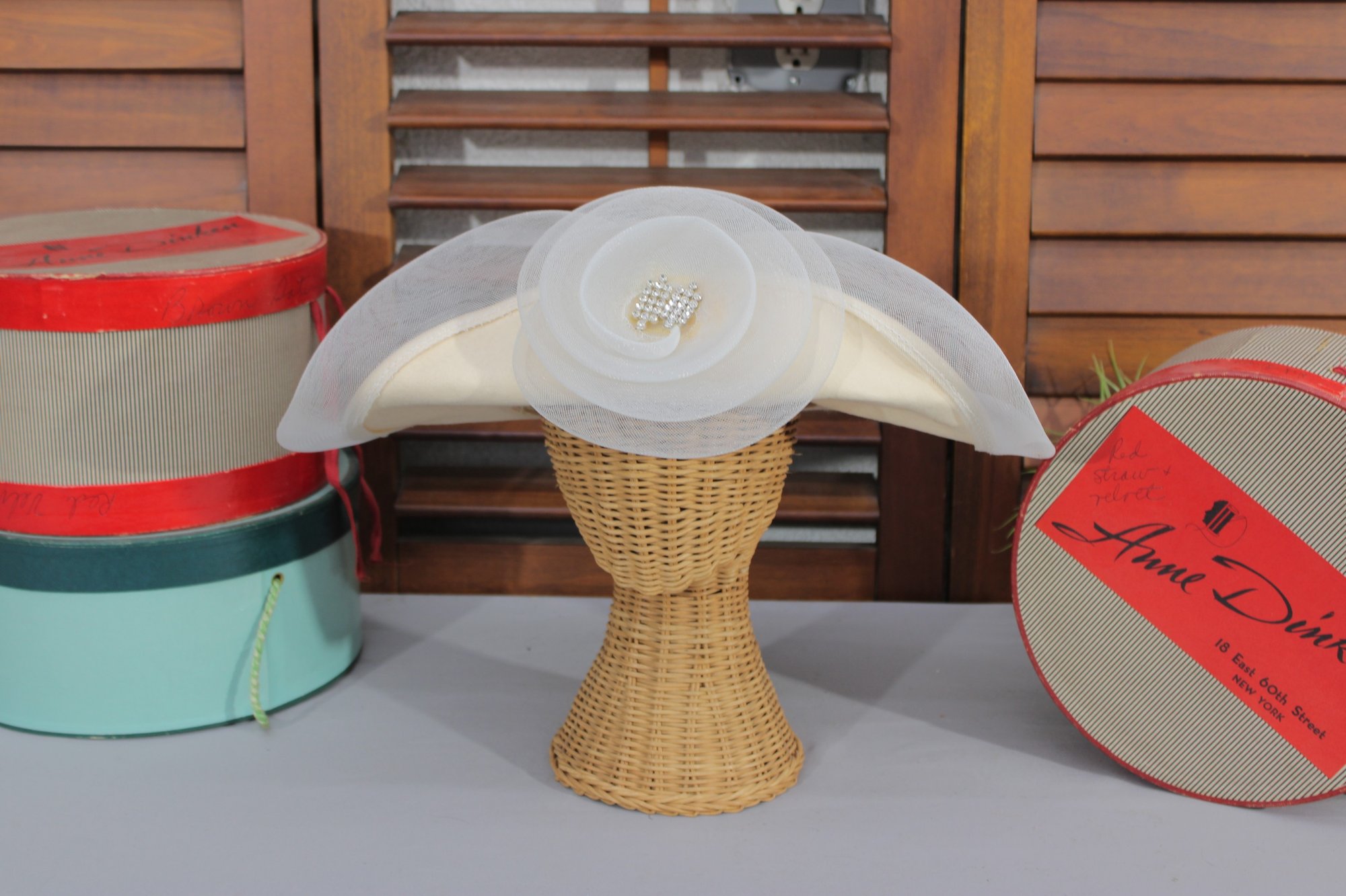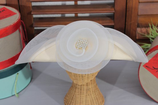 This beautiful hat features a wide ivory brim with layered sheer netting and a large sculptural flower accent at the front, highlighted with delicate bead detail. The dramatic silhouette and soft neutral color make it perfect for special occasions, vintage displays, weddings, or costume use.