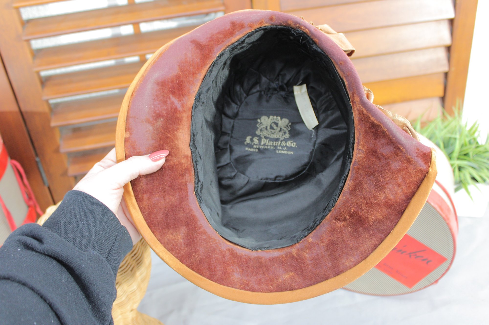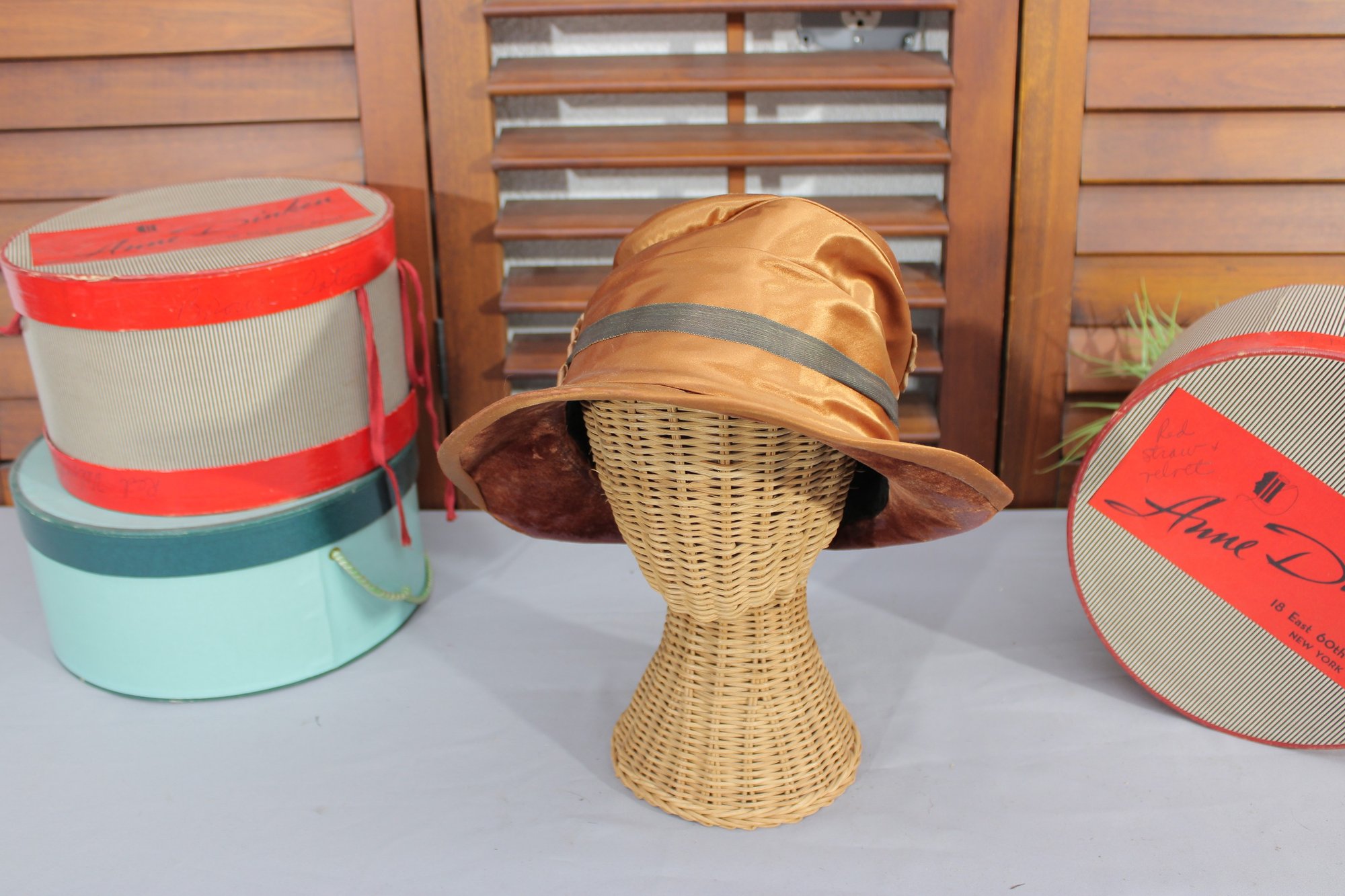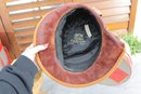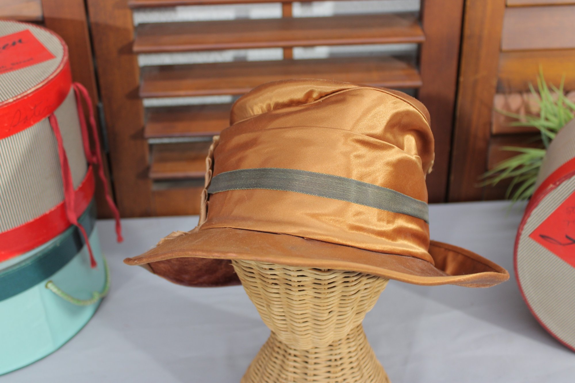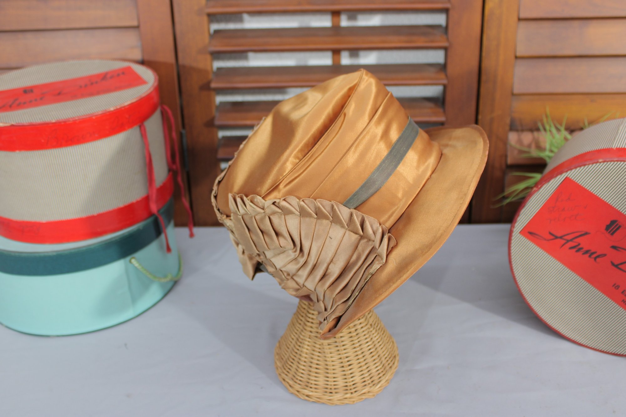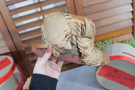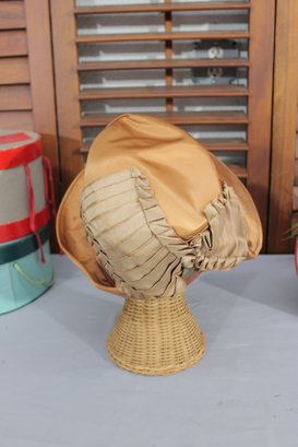 vintage women’s dress hat crafted in a rich bronze/golden satin fabric, featuring a softly structured crown and a graceful wide brim. This beautiful hat is highlighted by draped pleating and gathered detailing along the side, accented with a subtle band that adds depth and sophistication.