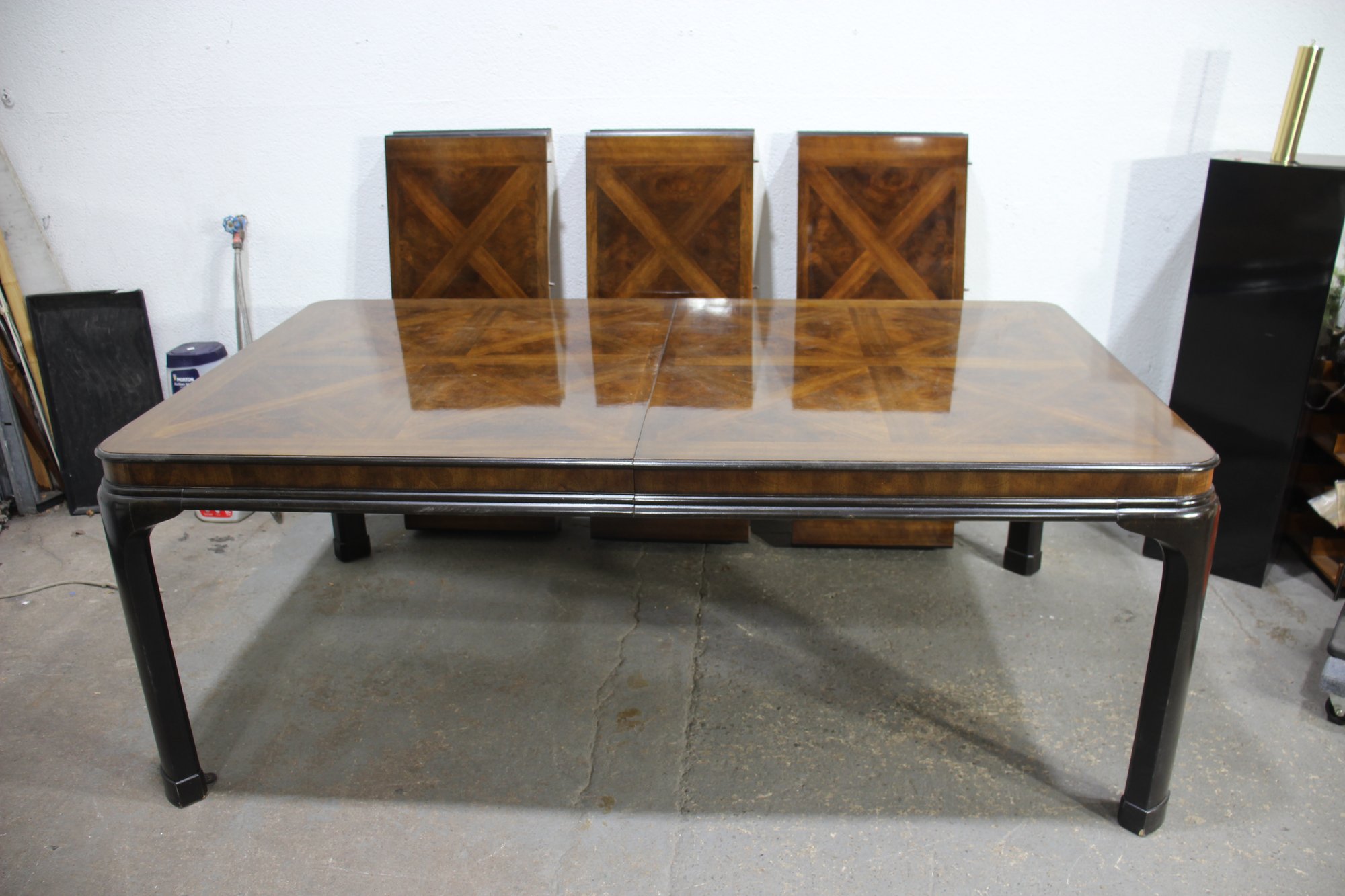 stunning vintage dining table with a beautifully crafted wood veneer top featuring intricate geometric patterns and a high-gloss finish. This elegant piece is supported by sturdy black metal legs, providing a striking contrast to the rich wood surface.