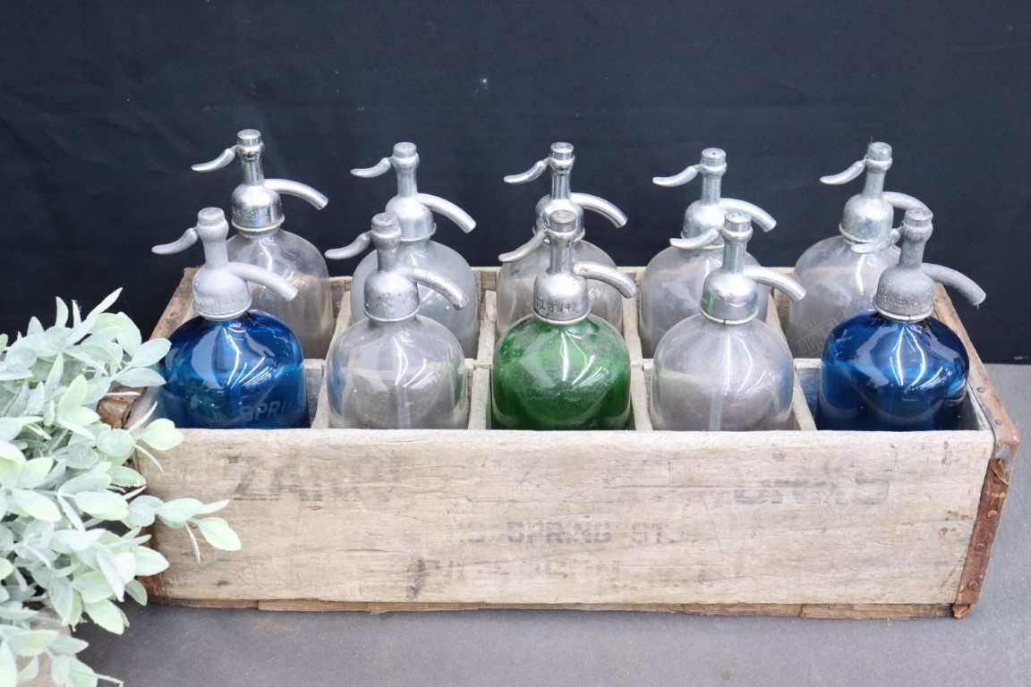 Vintage Wood Seltzer Delivery Box With 10 Vintage Seltzer Bottles