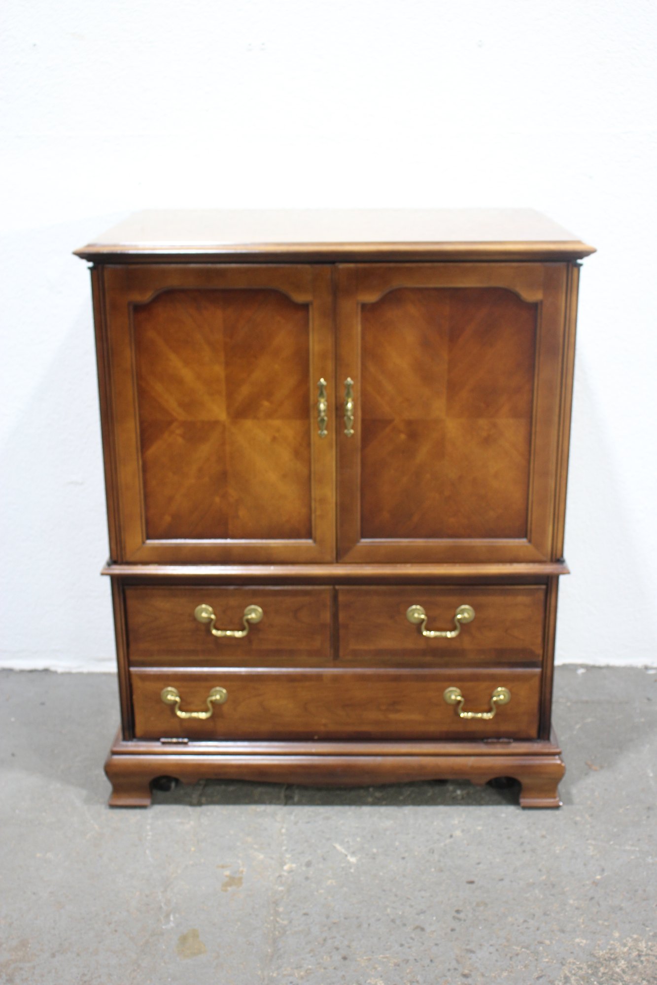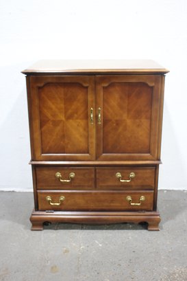 Below the cabinet doors, a drop-down desk offers a convenient workspace, making this piece perfect as a writing desk, bar cabinet, or media center. The lower section also includes two drawers with brass hardware for additional storage.