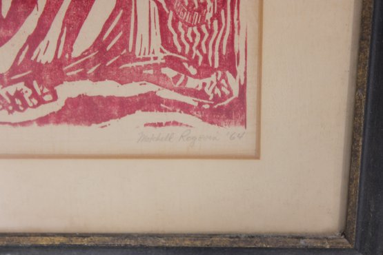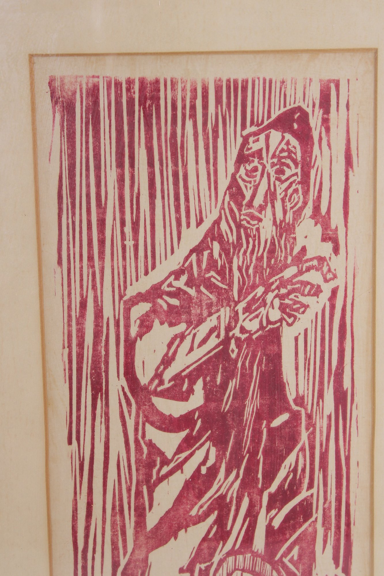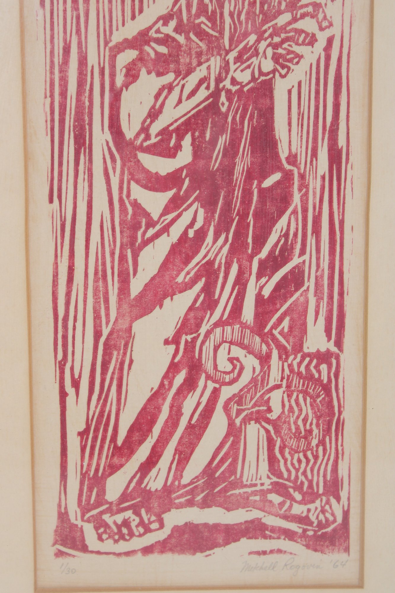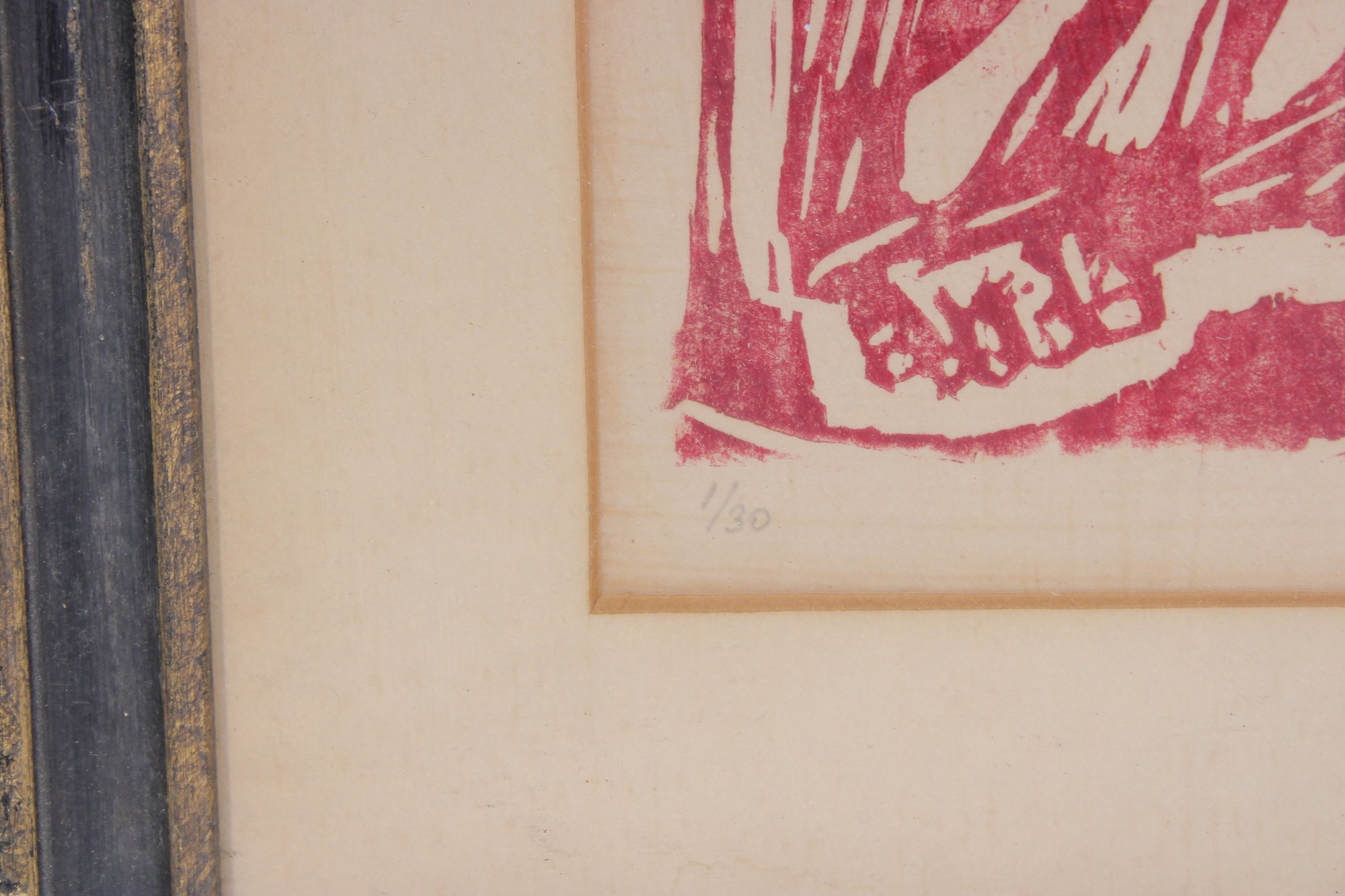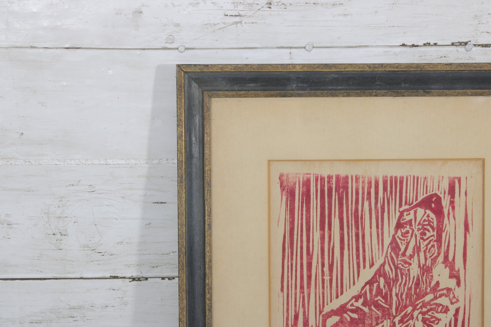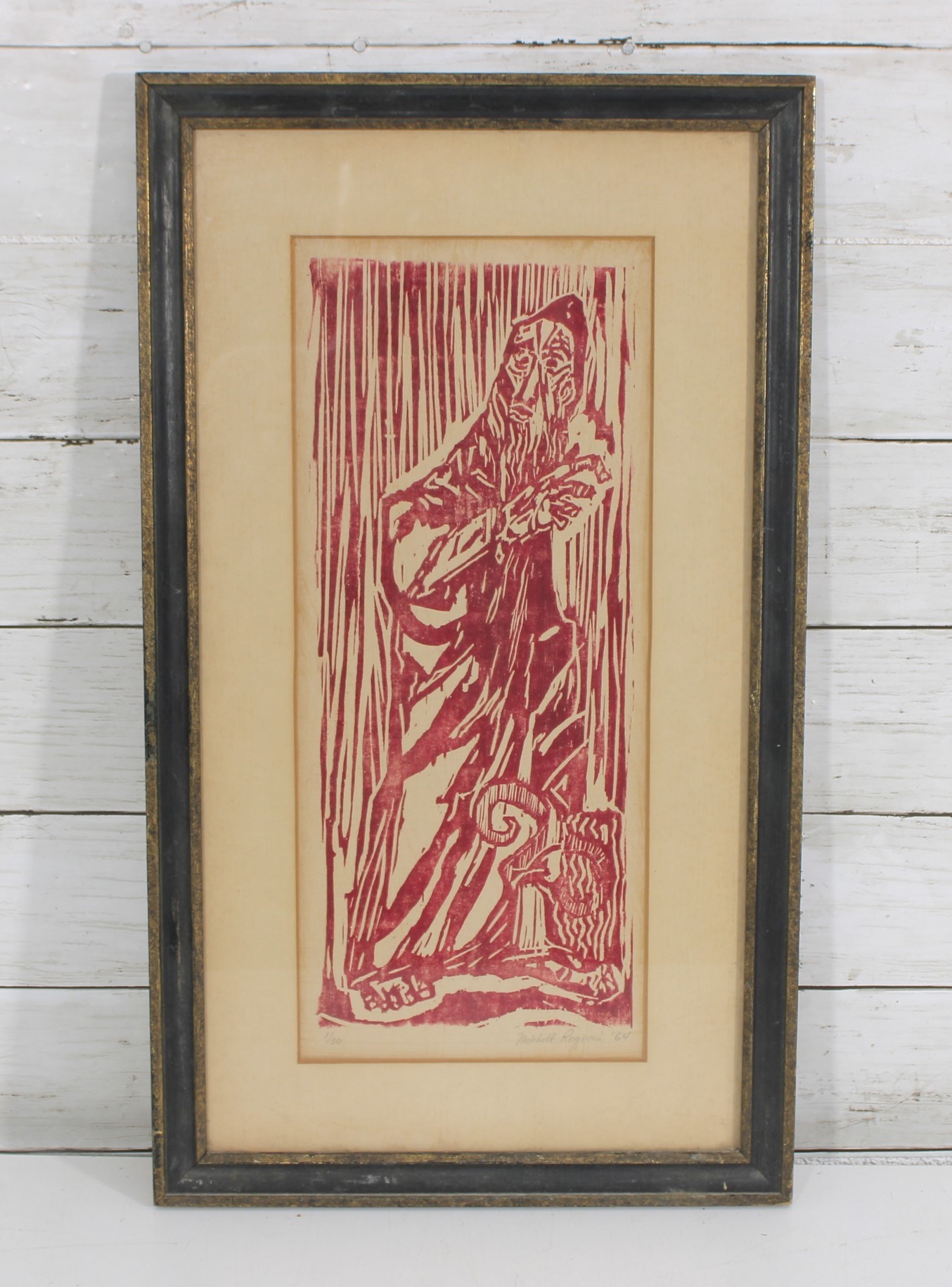 vintage woodcut print, numbered 1 of 30, pencil signed and dated 1964 by the artist. This bold, expressionist composition depicts a robed figure rendered in strong, carved lines and rich red tones, characteristic of traditional woodcut techniques.