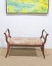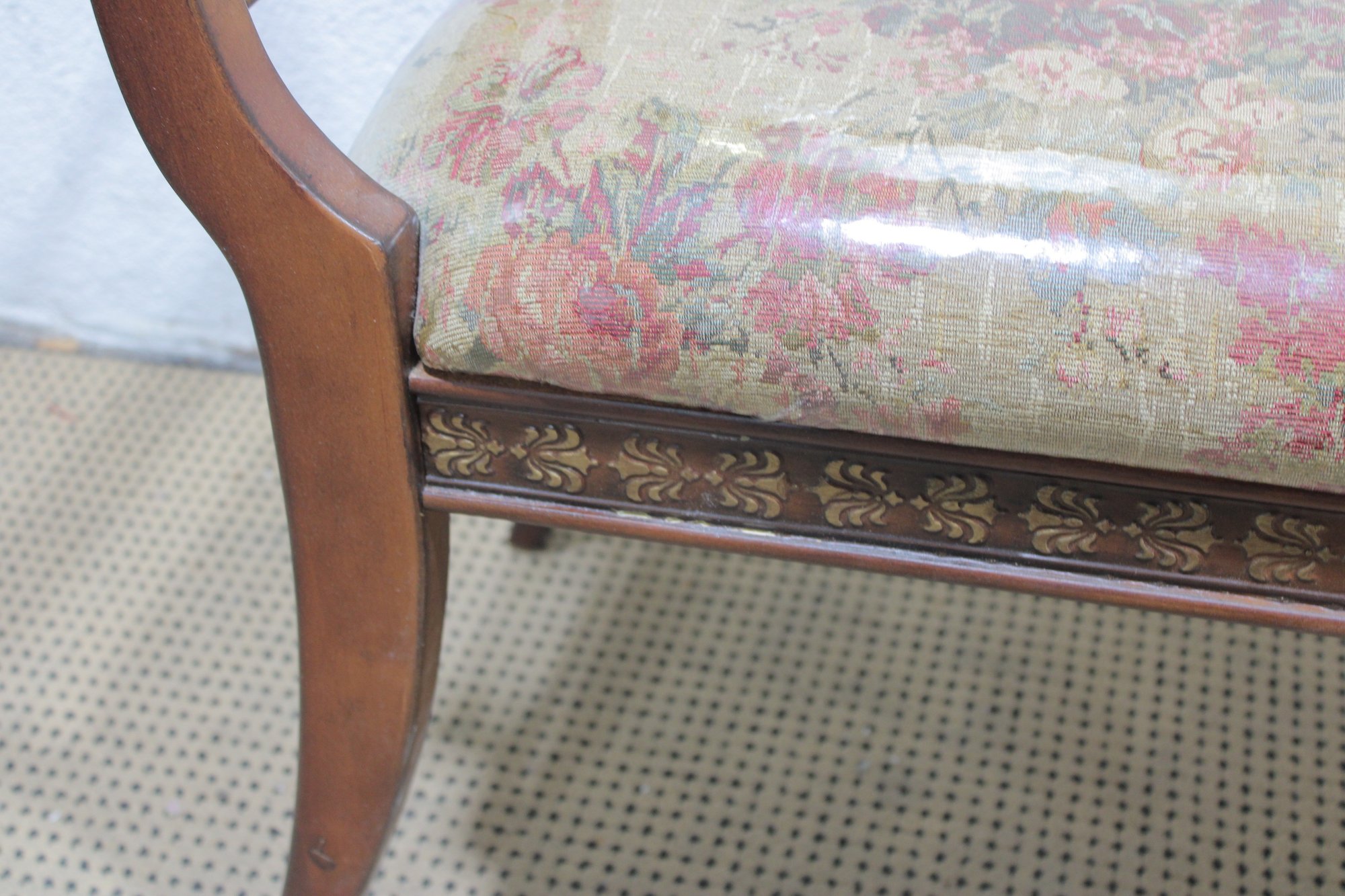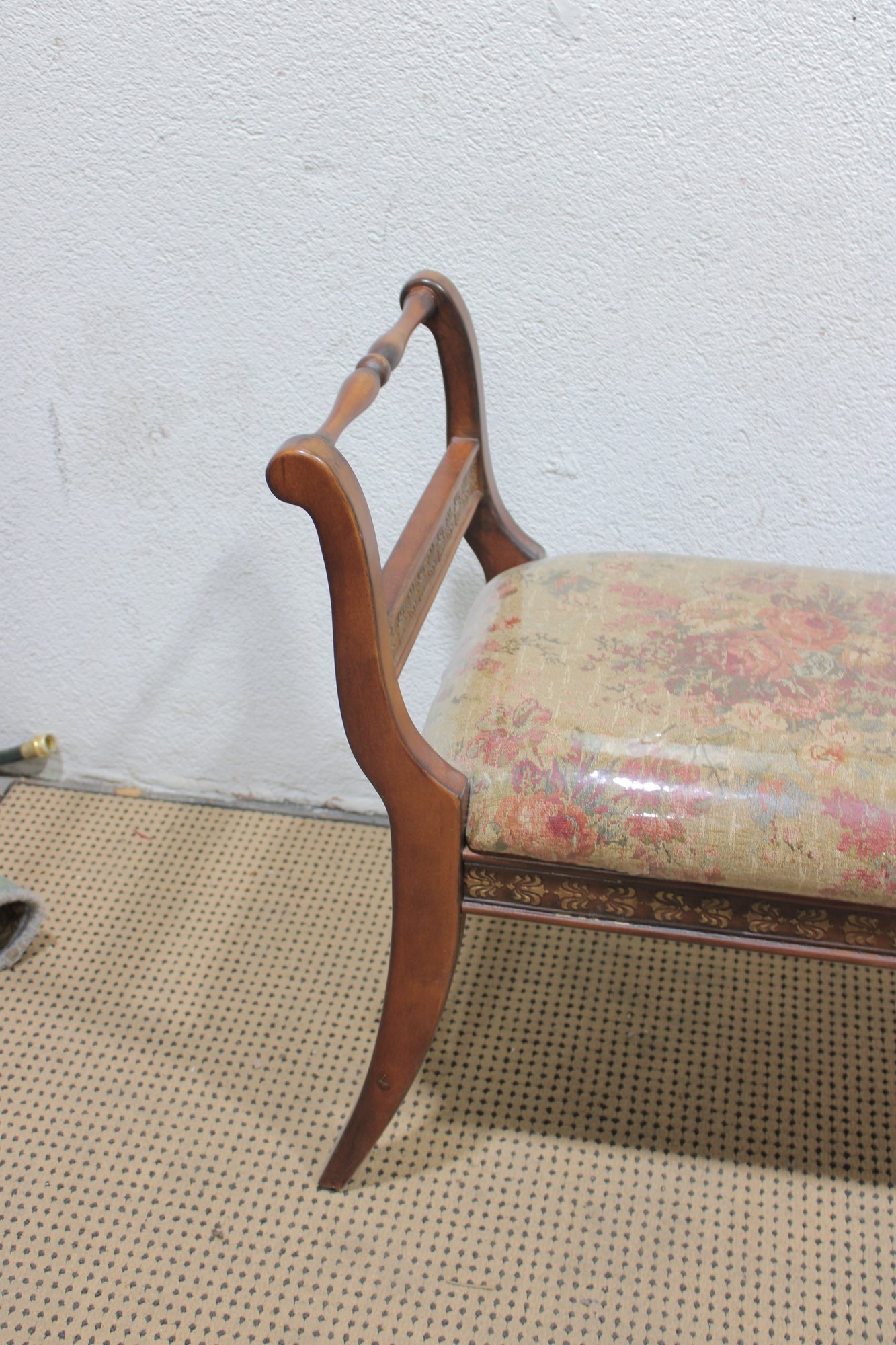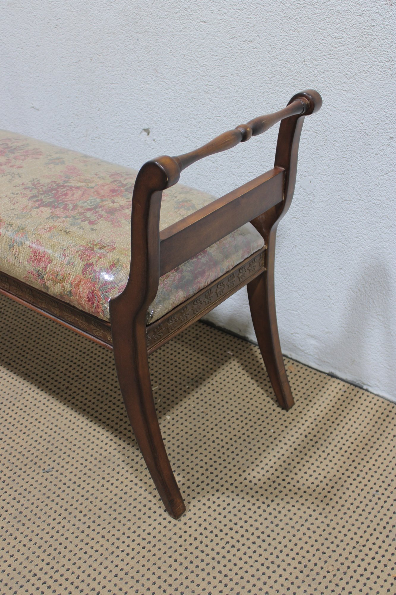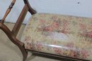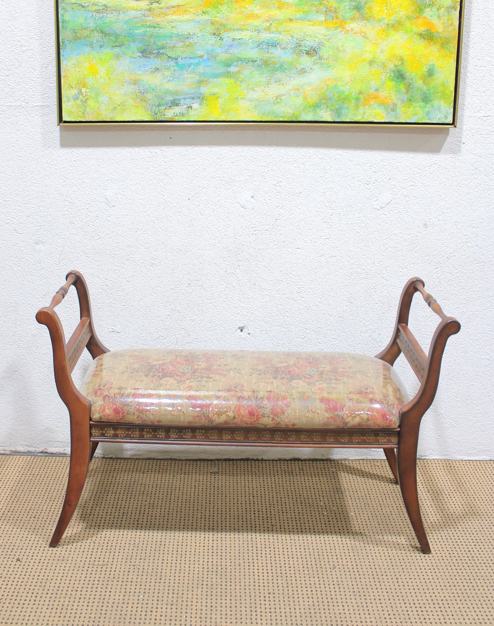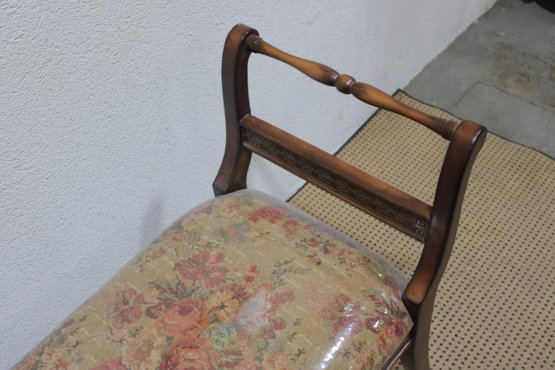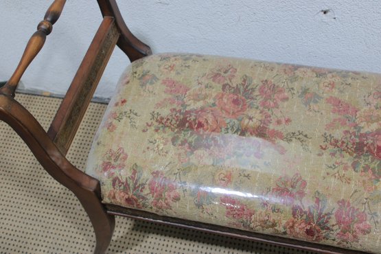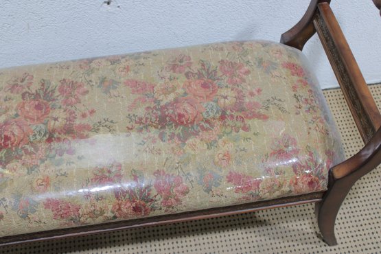 The bench showcases a warm wood frame with graceful curved arms and turned stretcher details, giving it a refined, traditional look. The seat is upholstered in a floral needlepoint-style fabric and protected with a clear plastic cover, helping preserve the material while still showing the beautiful pattern.