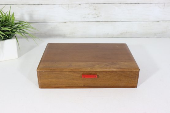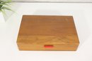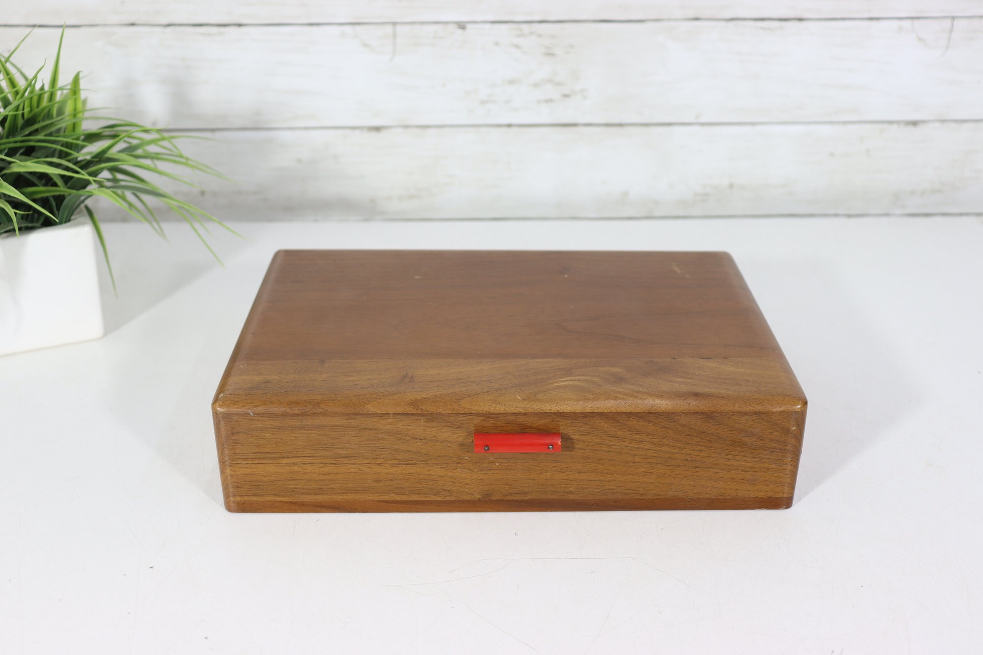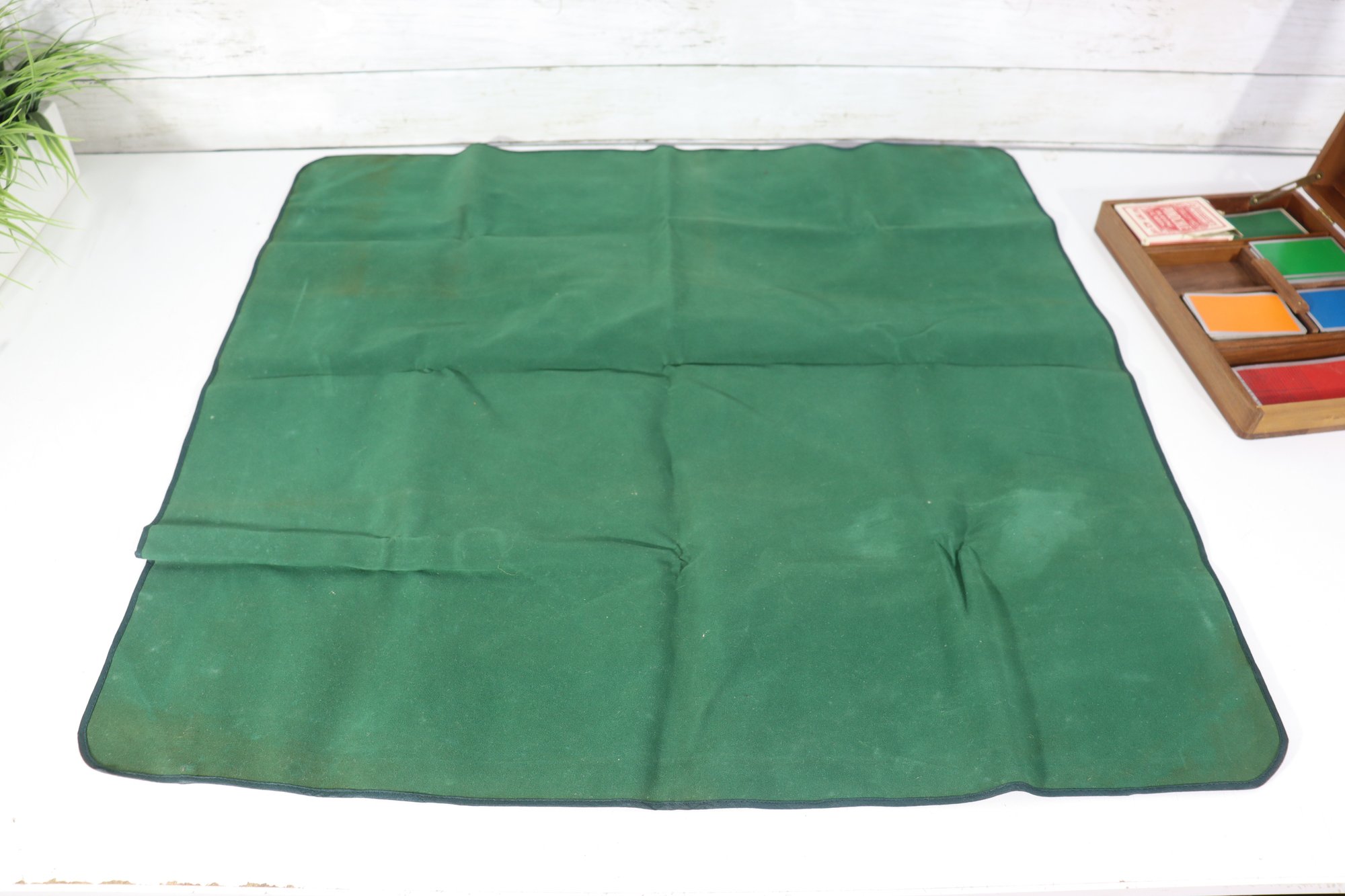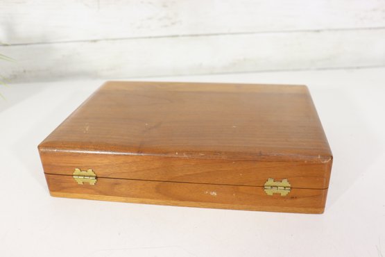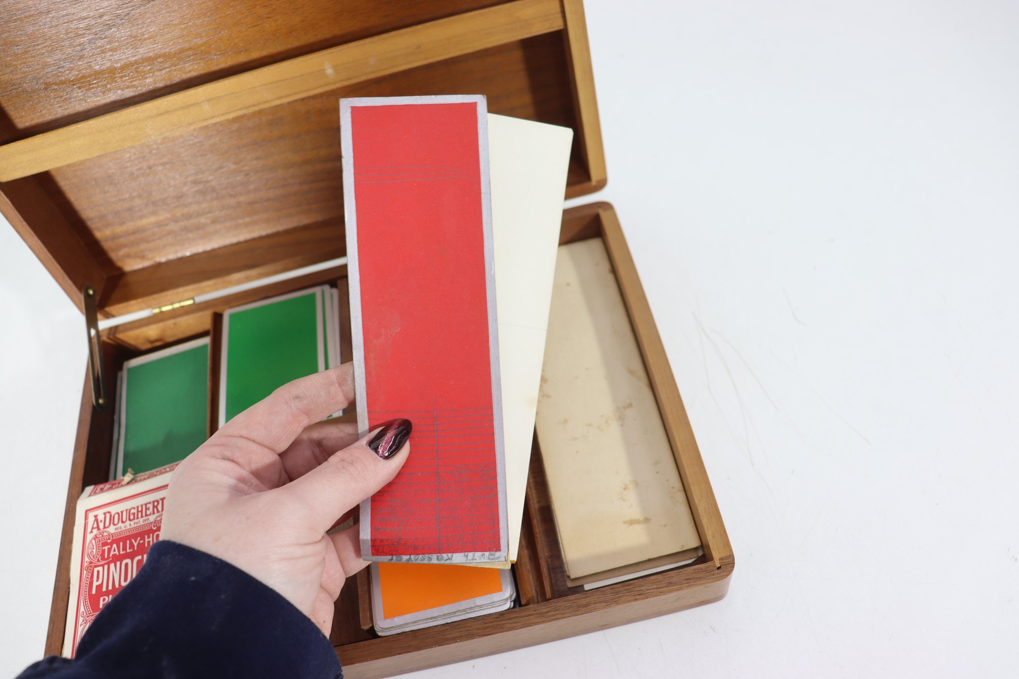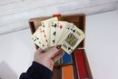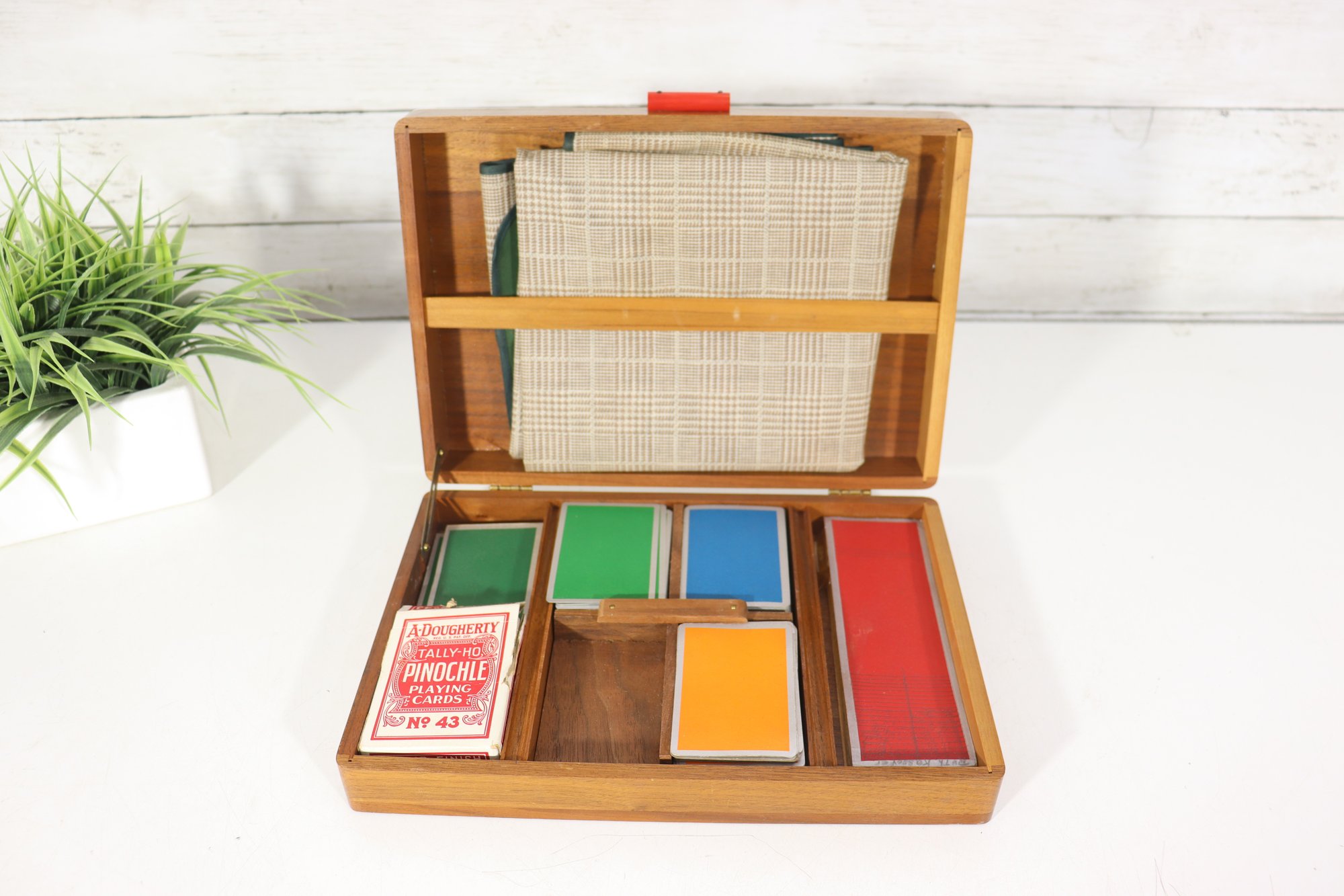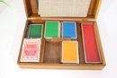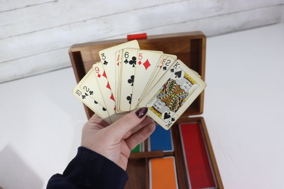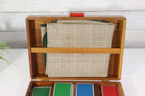 vintage wooden card and game set, housed in a handsome hinged wooden box. When opened, the box reveals neatly divided compartments containing playing cards, colored game pieces or chips, and accessories, along with a green felt mat for gameplay.
