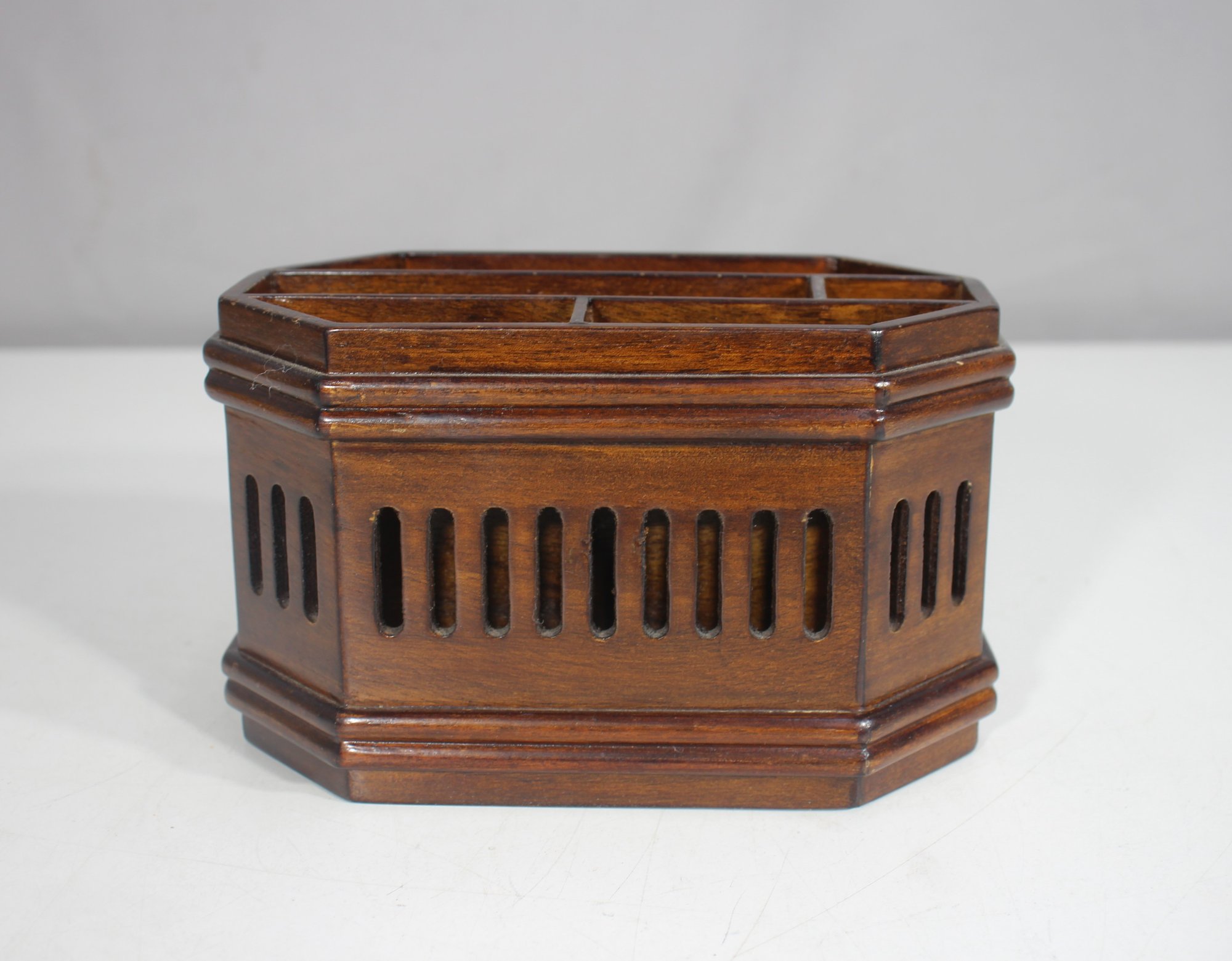 This vintage wooden desk organizer features an elegant octagonal shape with slotted side panels and multiple compartments for organizing pens, letters, or office supplies. Measuring 4 inches high, 7 inches wide, and 4 inches deep, this piece is both functional and decorative, making it a great addition to any office, library, or home workspace.