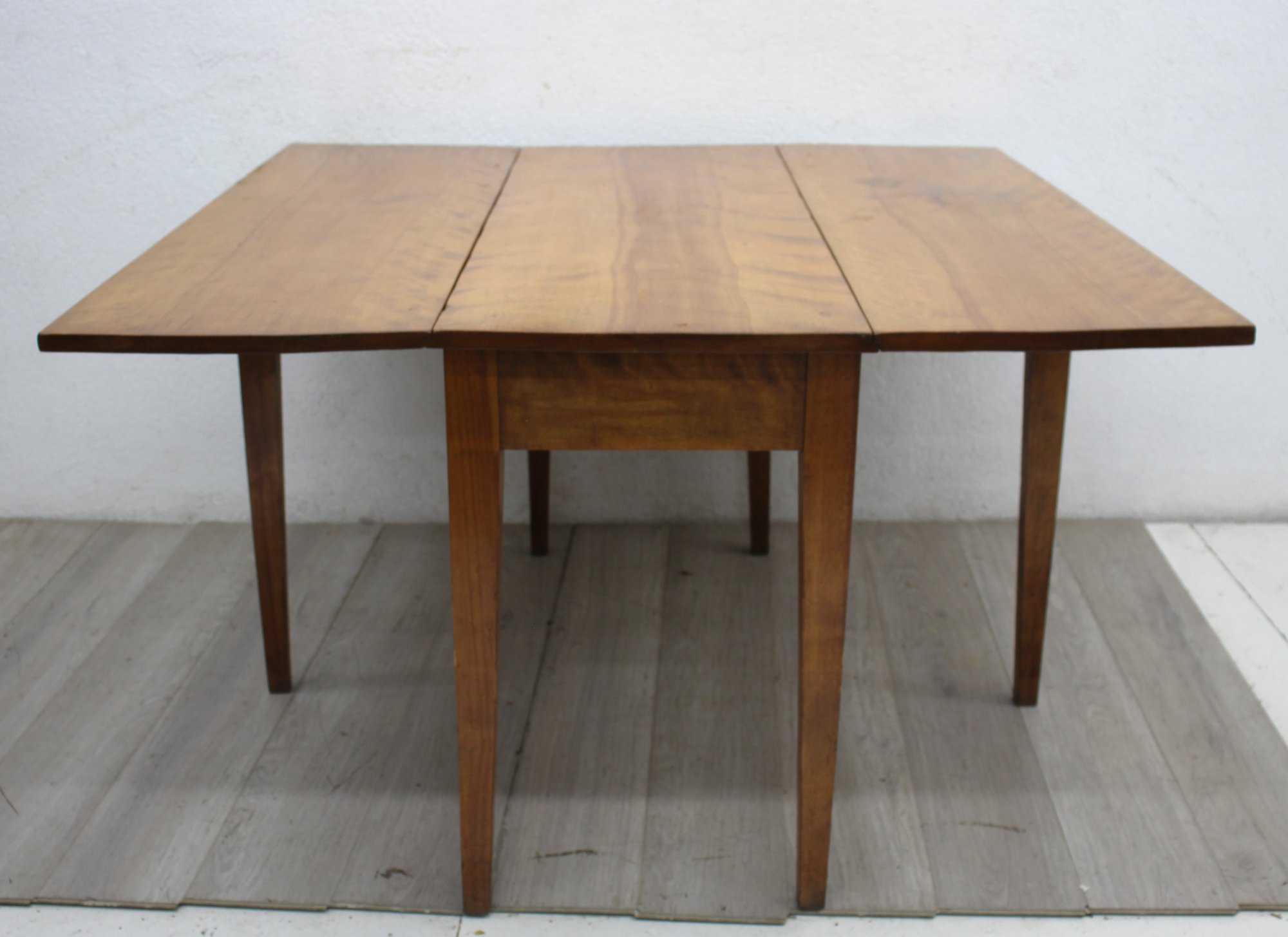 This classic wooden drop-leaf table offers both functionality and elegance, perfect for versatile use in any room. With its solid wood construction and warm natural finish, the table easily transitions from a compact console table to a spacious dining or workspace when the leaves are extended. The natural wood grain adds character to the piece, showing signs of age and use that enhance its vintage charm. Minor surface marks present add to the authenticity of this timeless piece. Ideal for both small spaces and larger gatherings.