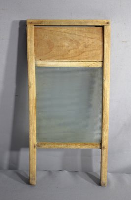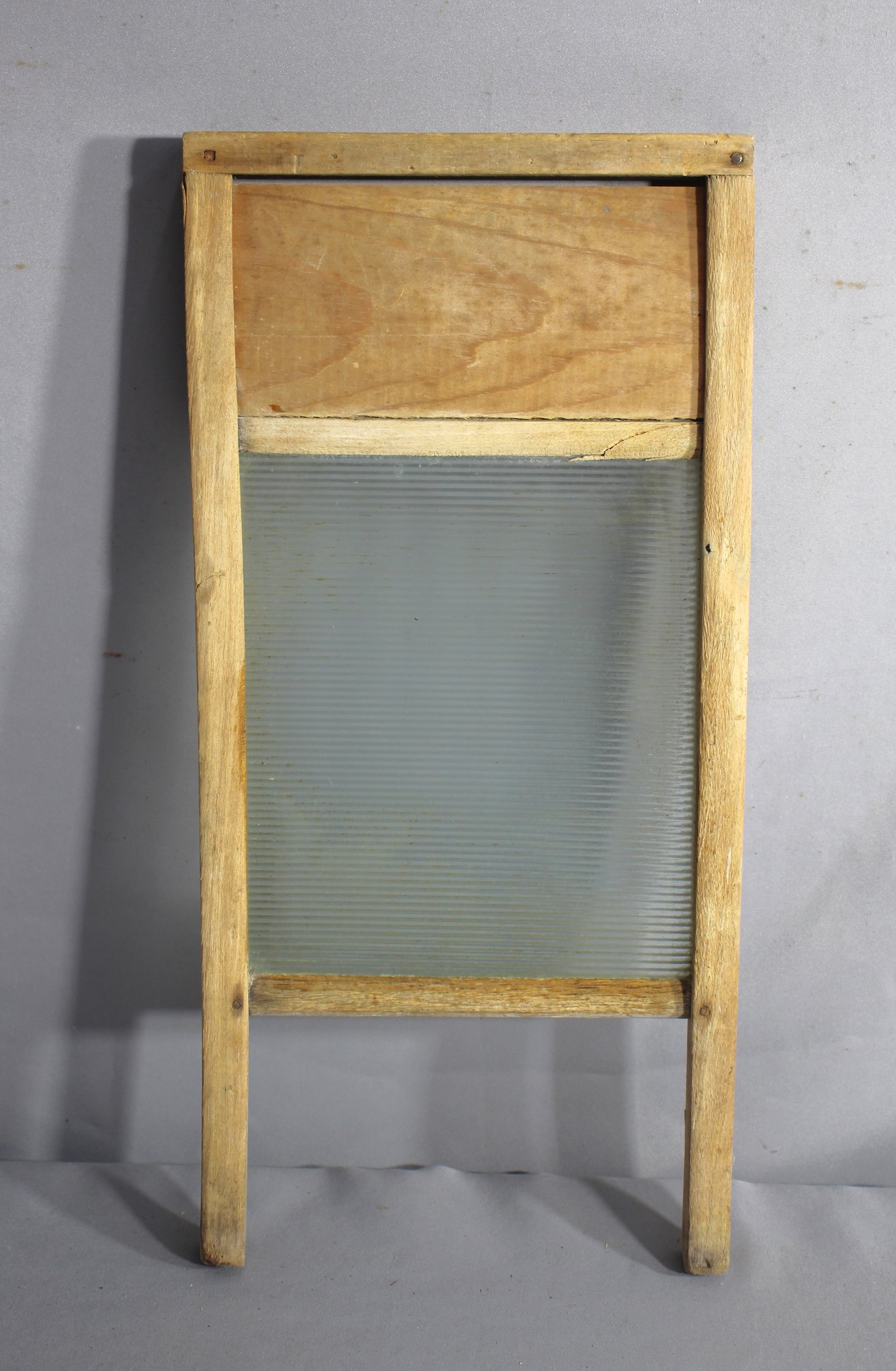 This charming piece features a solid wooden frame supporting a textured glass scrubbing surface, traditionally used for hand-washing clothing.The item is in good vintage condition, with natural wear and patina consistent with age and use.