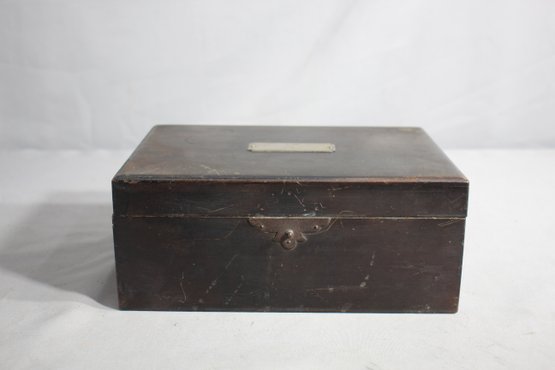 The box is crafted from dark-stained wood, with a simple yet sophisticated rectangular design that speaks to its utilitarian purpose. A brass nameplate is affixed to the top, awaiting customization, while the front sports a brass clasp that secures the lid. This piece harkens back to an era when smoking cigars was a ritualistic pastime, and the accessories associated with it were crafted with care.