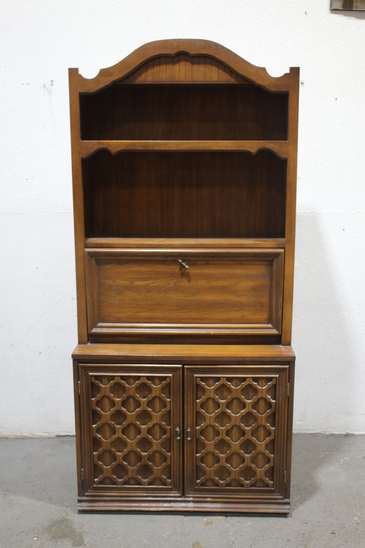 The hutch is characterized by an elegant scalloped top shelf and a spacious middle section, perfect for displaying your cherished collectibles or books.