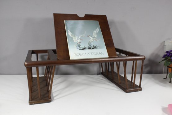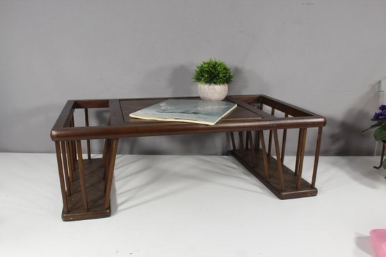 mid-century charm to your home with this beautifully crafted wooden magazine rack featuring a built-in adjustable book display stand. This versatile piece is perfect for organizing your magazines, books, or vinyl records while also showcasing your favorite book or artwork on the display stand. The rich wooden finish highlights the timeless design, and the rack's open slat construction ensures easy access to stored items. A functional and stylish addition to any living room, study, or office. Dimensions: approximately [insert dimensions if known]. Condition: Excellent vintage condition with minimal wear consistent with age.