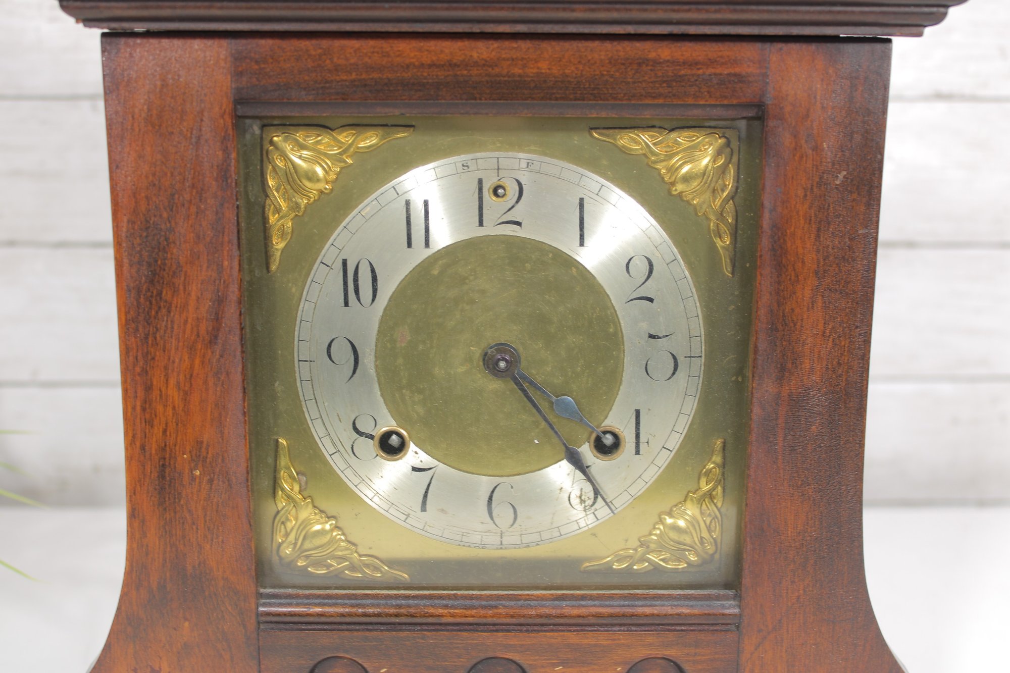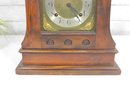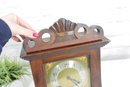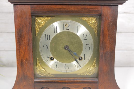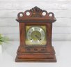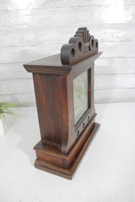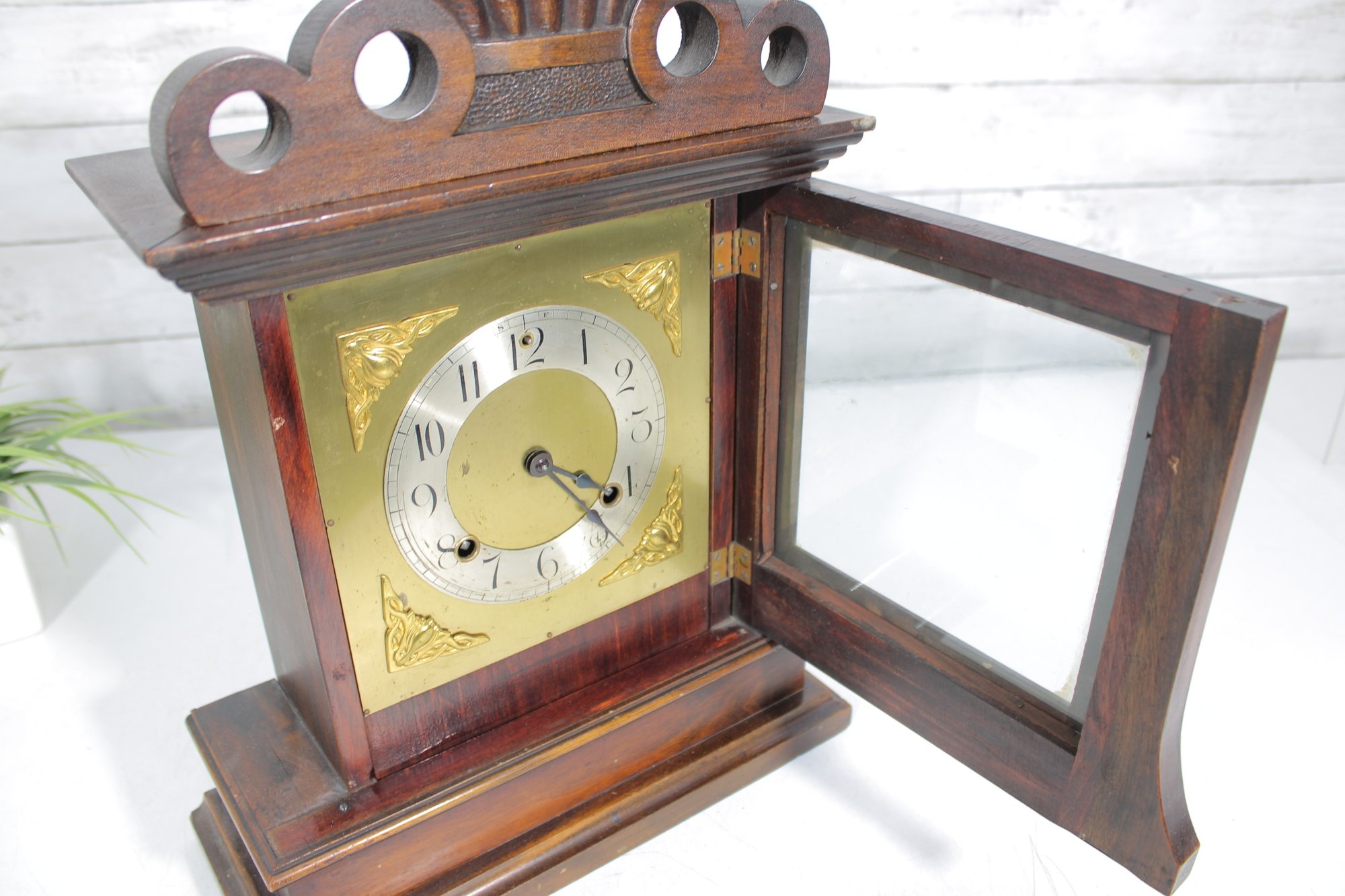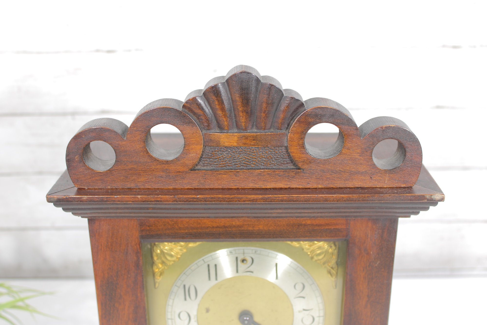 Classic vintage wooden mantel clock featuring a beautifully crafted case with decorative top crest and a glass front door. The clock displays a brass-tone dial with traditional Arabic numerals and ornate corner accents, giving it a timeless, elegant appearance.