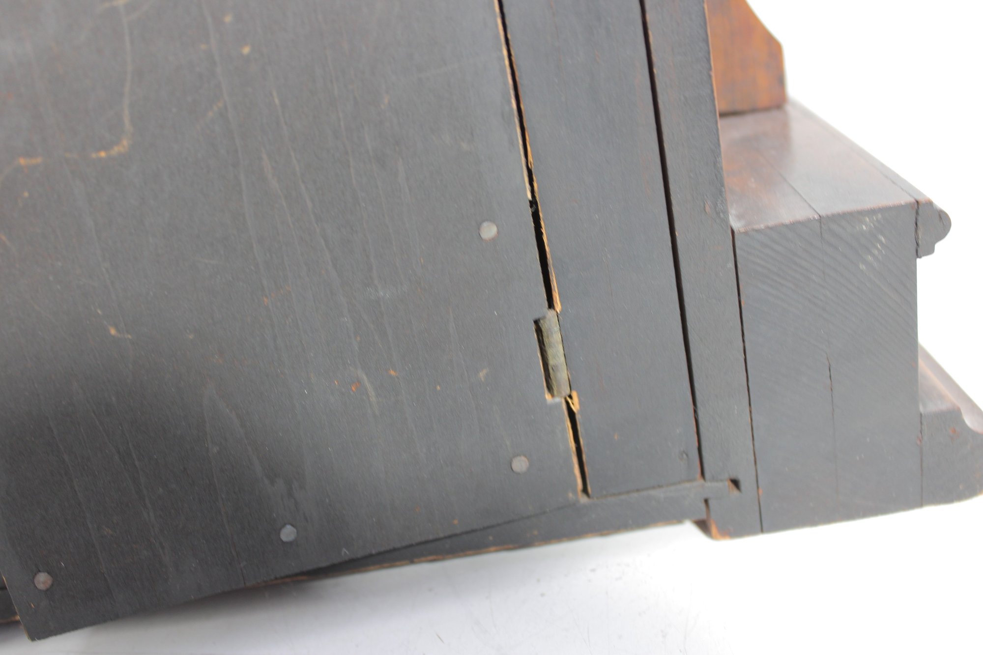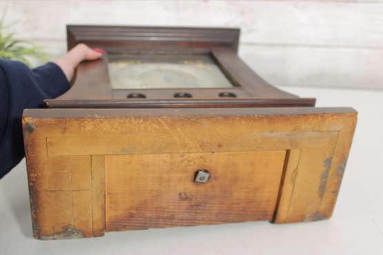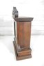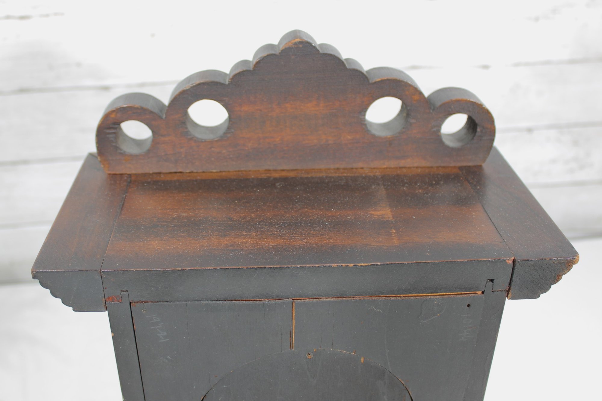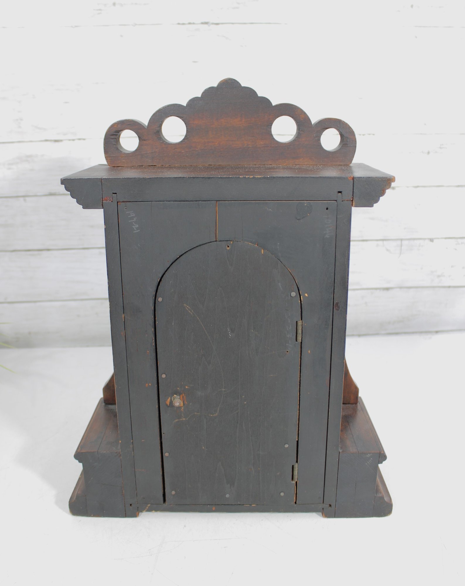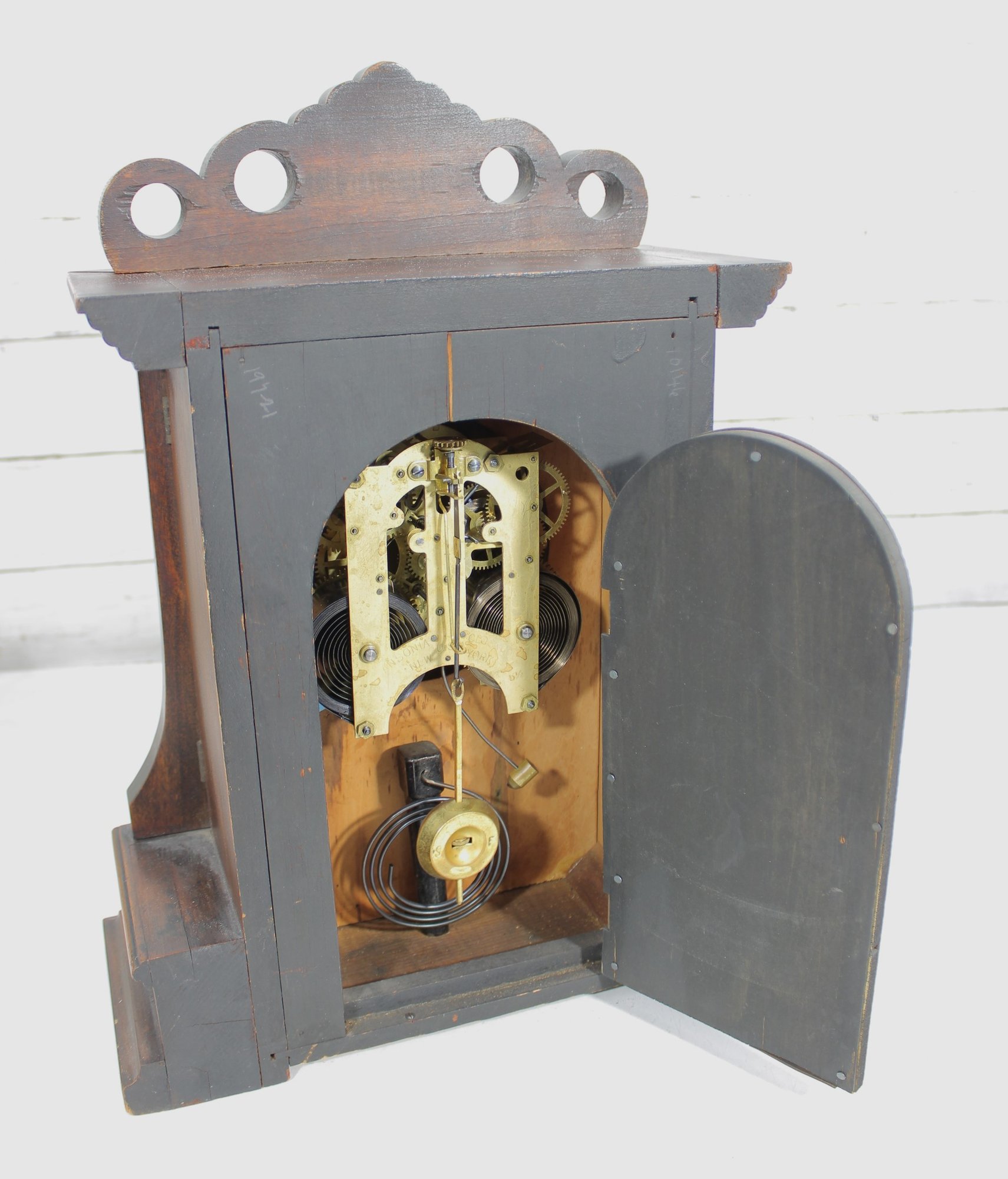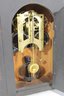 The interior houses a mechanical key-wind movement with visible chime rods and pendulum assembly. The back opens to reveal the inner workings, adding to its collectible appeal for clock enthusiasts.