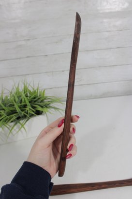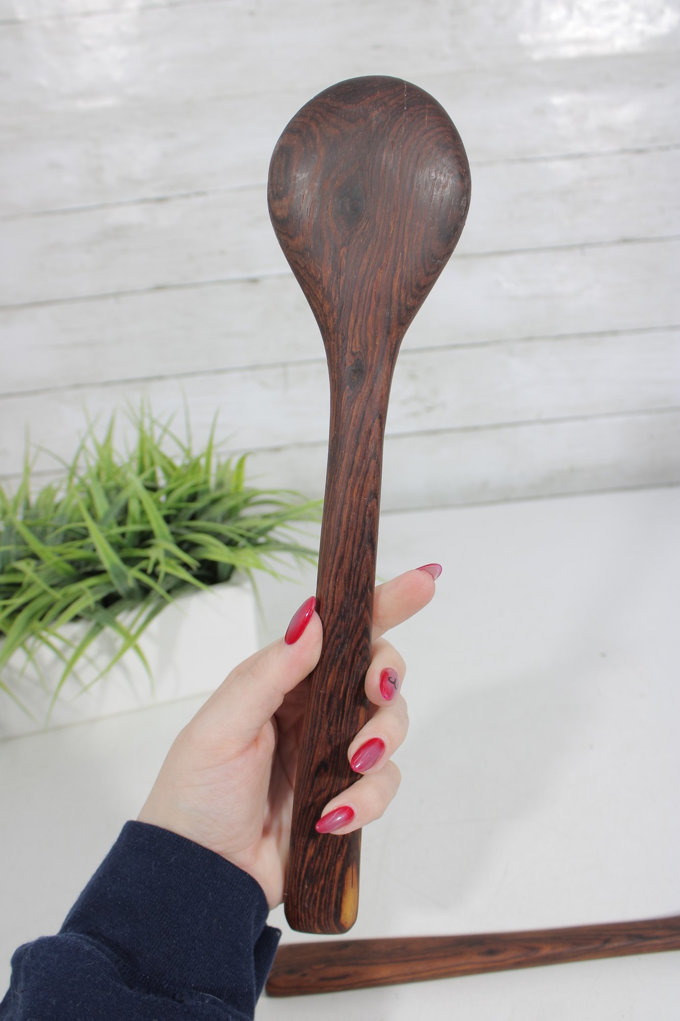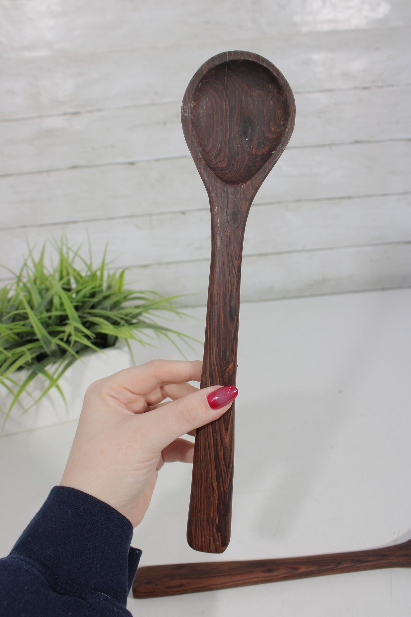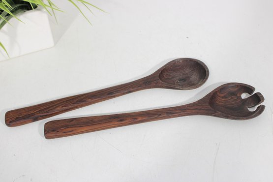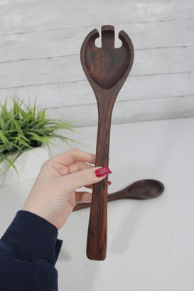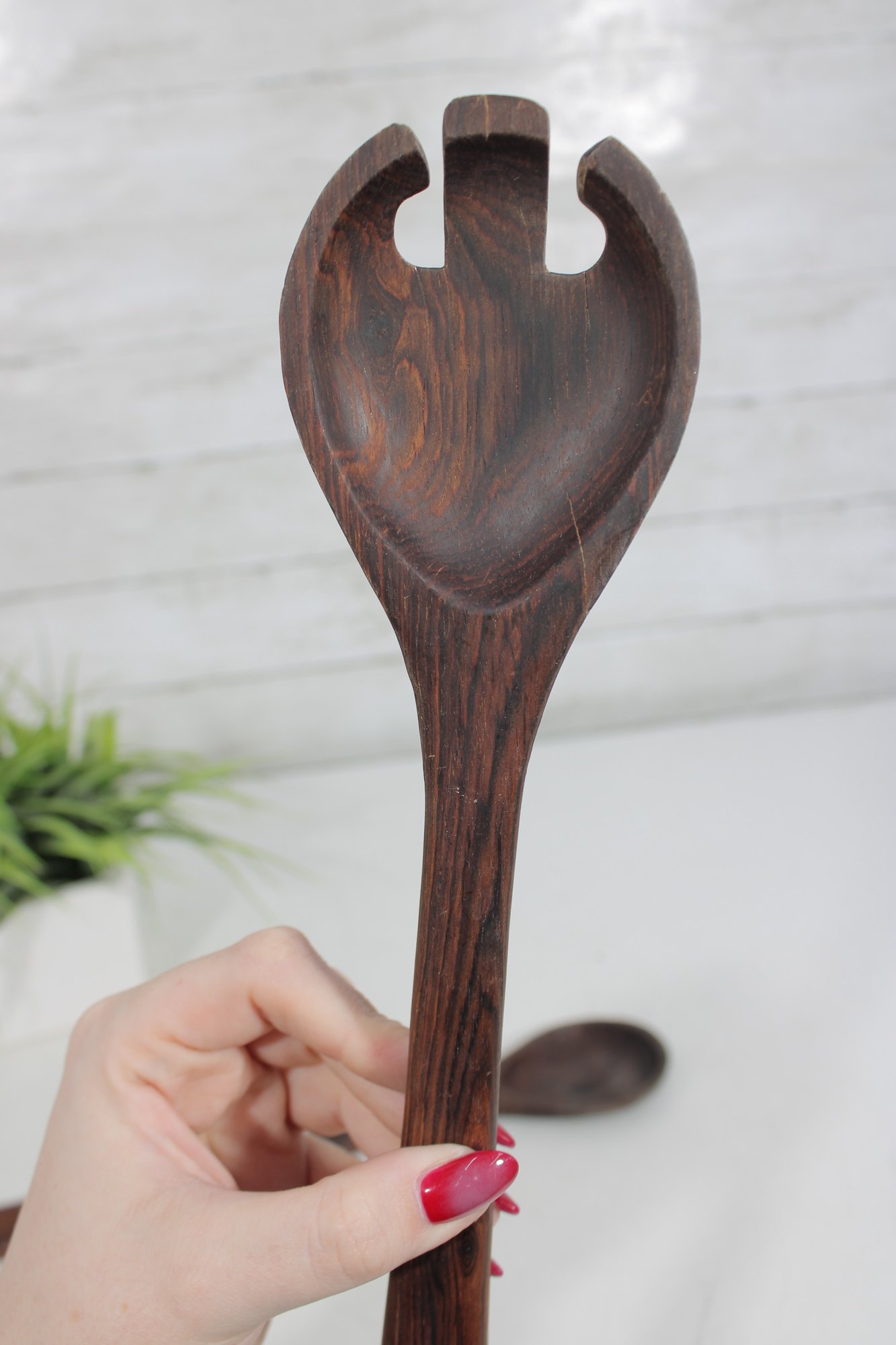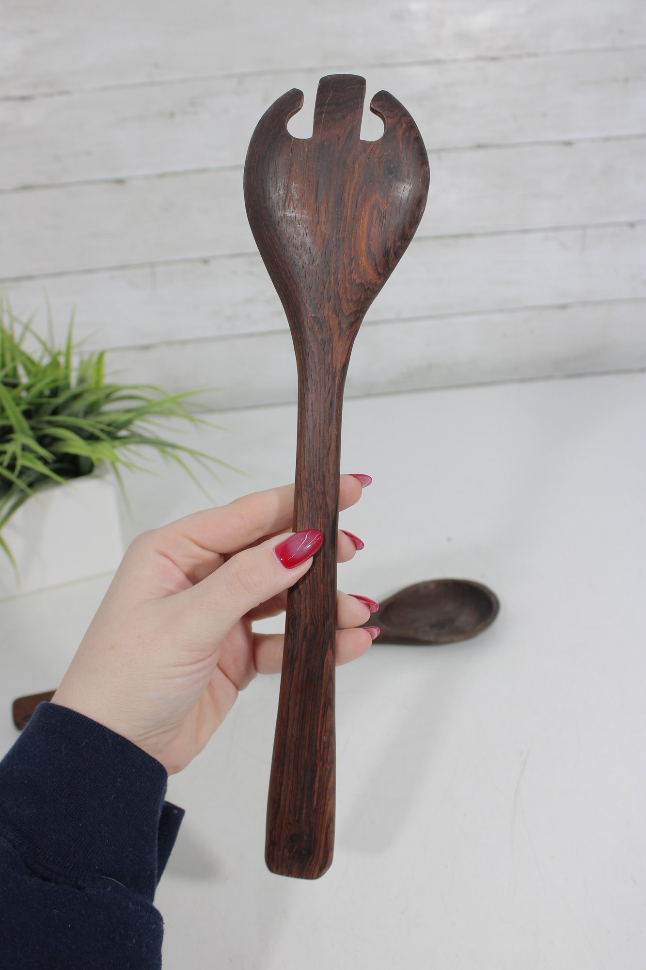vintage wooden salad serving set, featuring a matching spoon and fork. Each utensil measures approximately 12.5 inches in length and showcases a rich, dark wood grain with a smooth, hand-finished appearance.