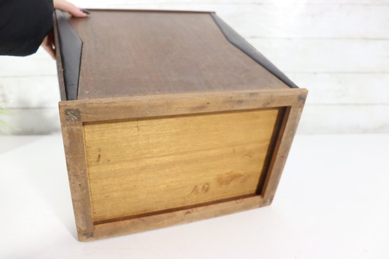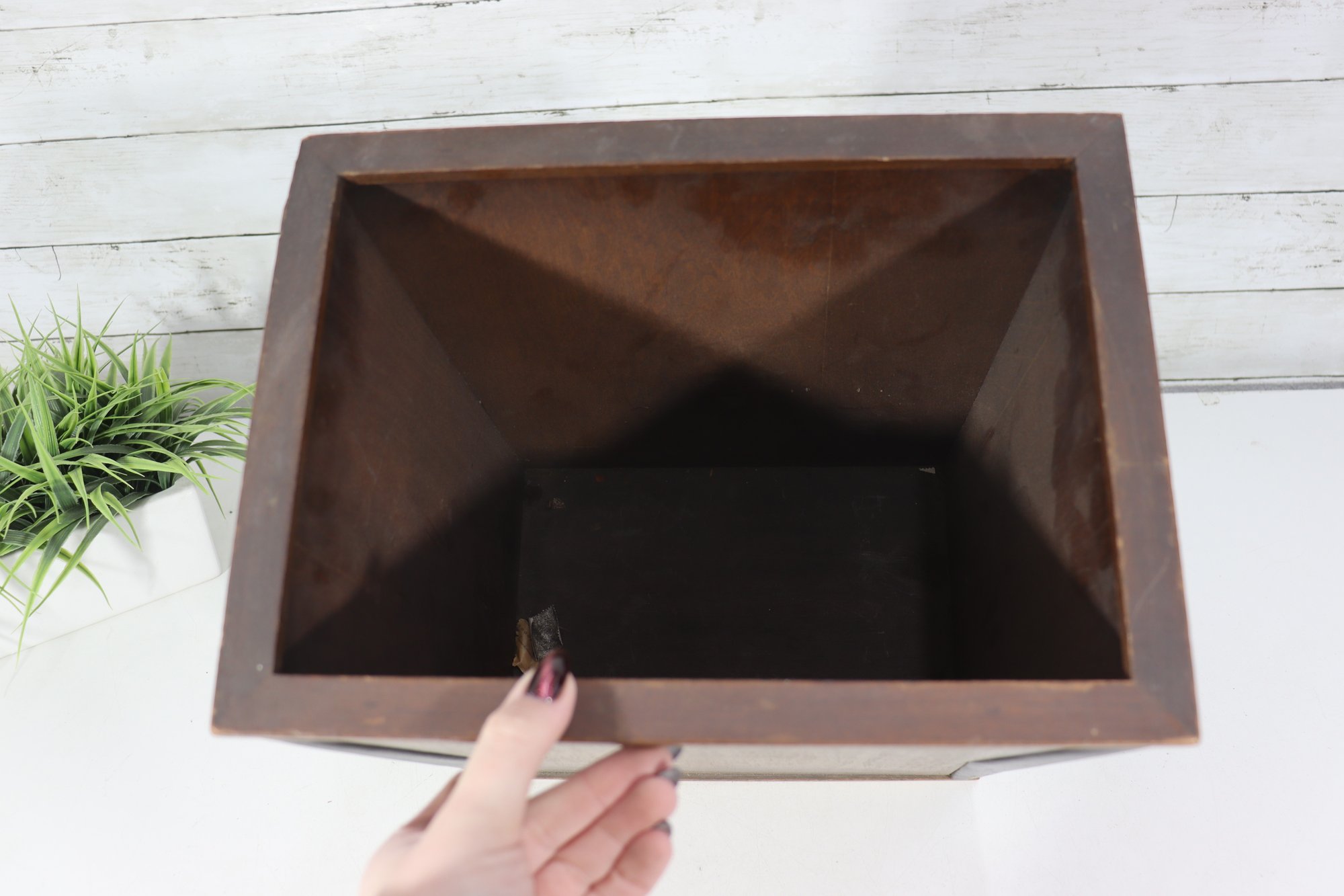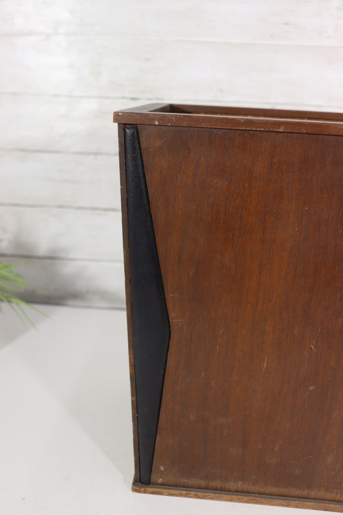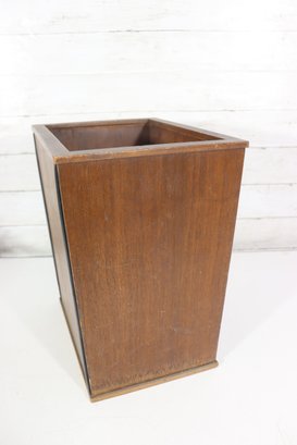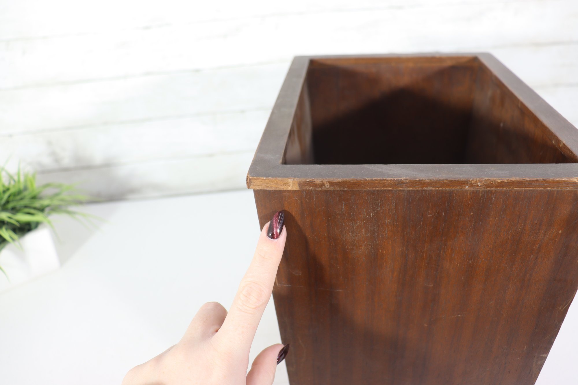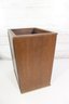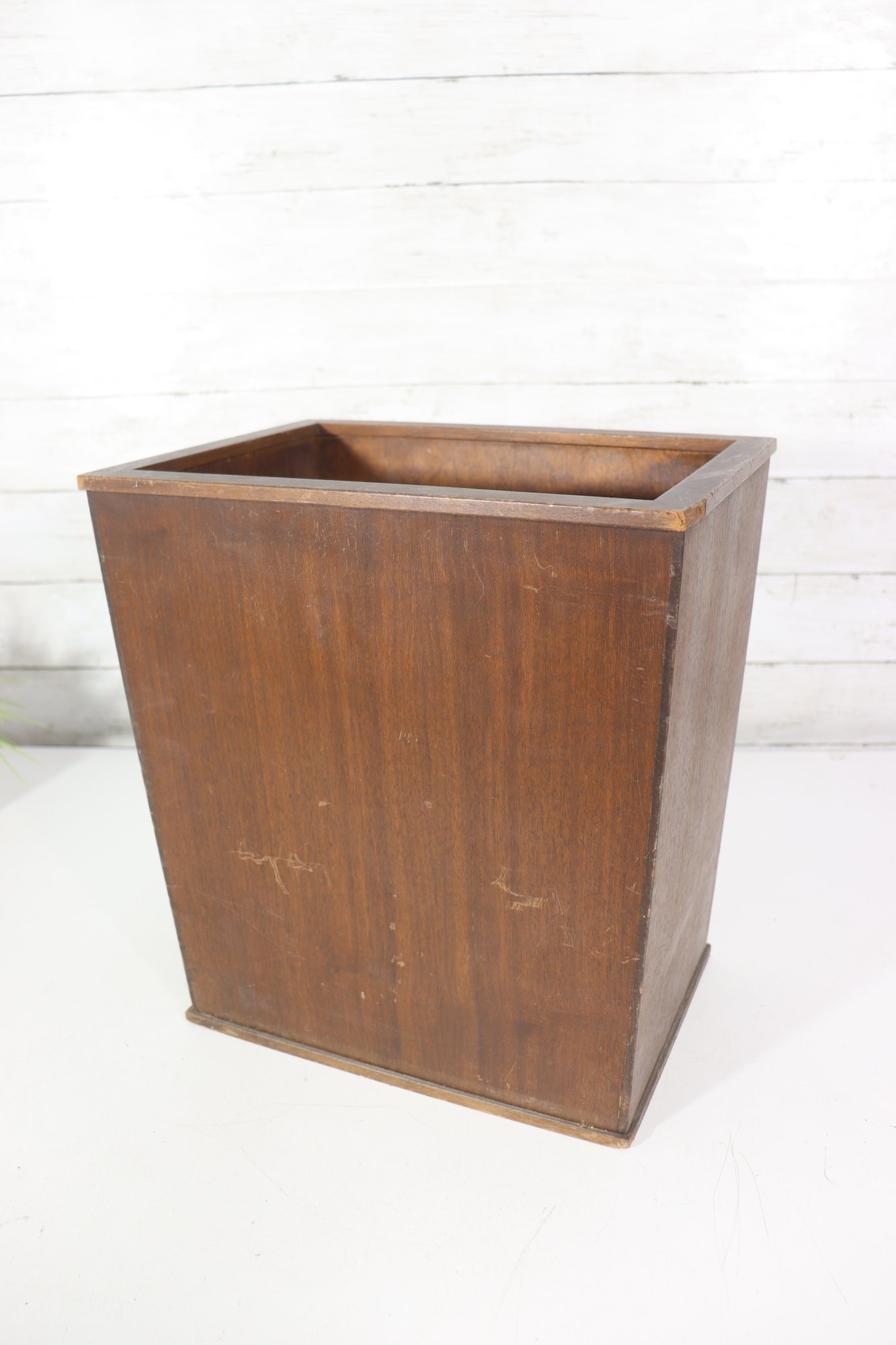 Classic vintage wooden wastebasket or storage bin featuring a simple, clean-lined design with angled sides and warm wood tones. This piece has a timeless mid-century look and works beautifully as a trash bin, umbrella holder, magazine holder, or decorative storage container.