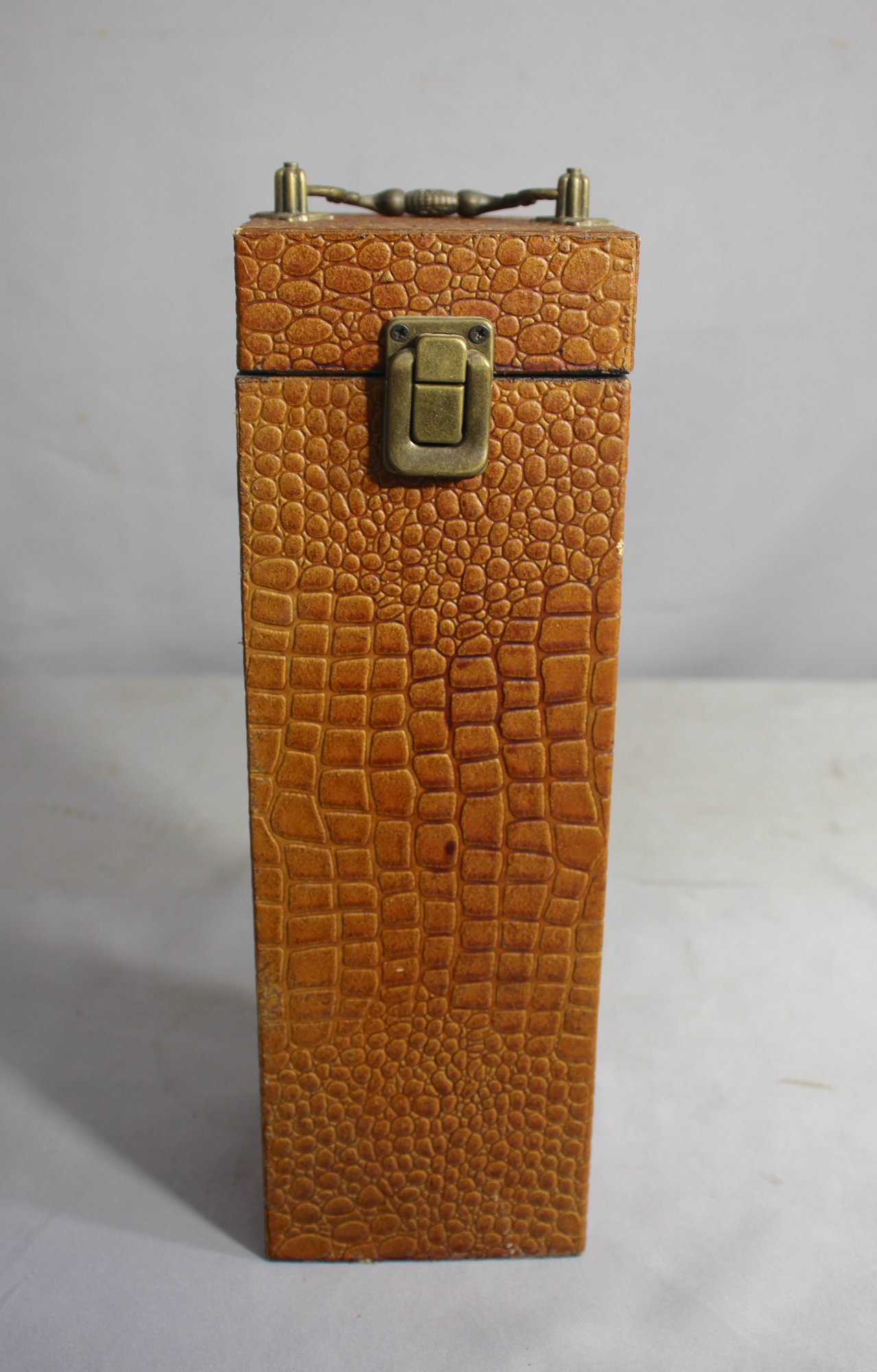 Vintage Wooden Wine Bottle Case Holder Faux Ostrich Leather Brass