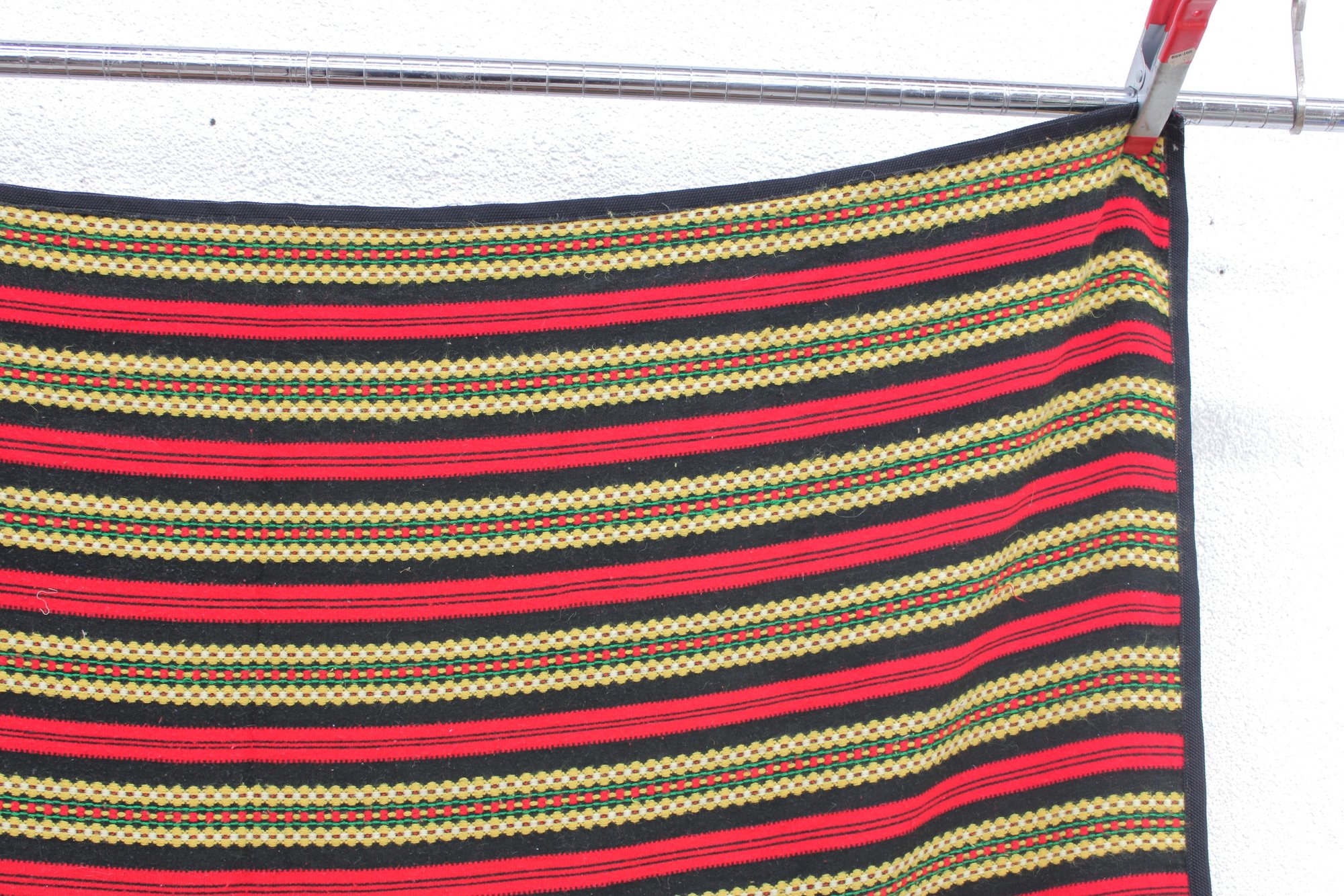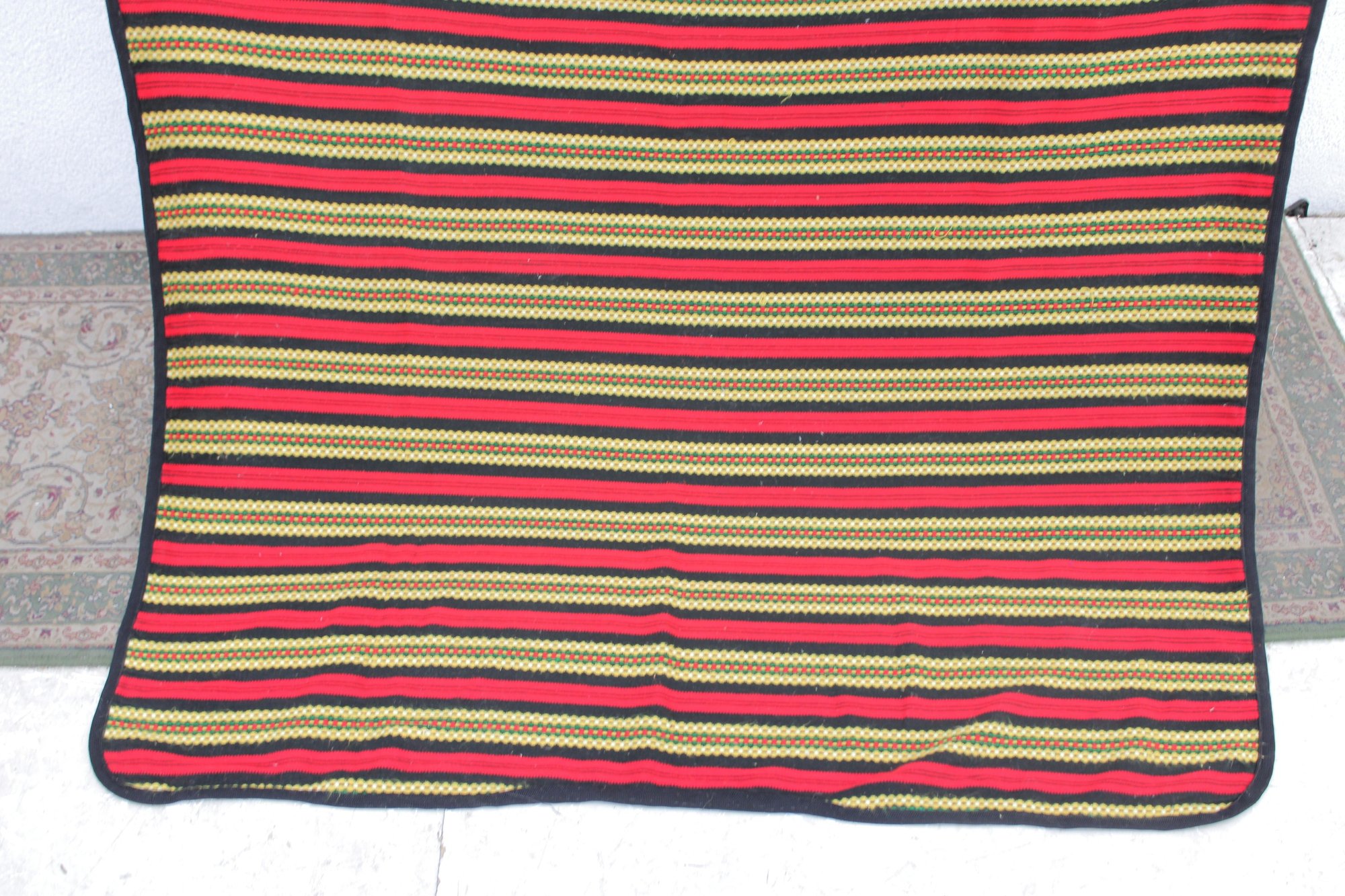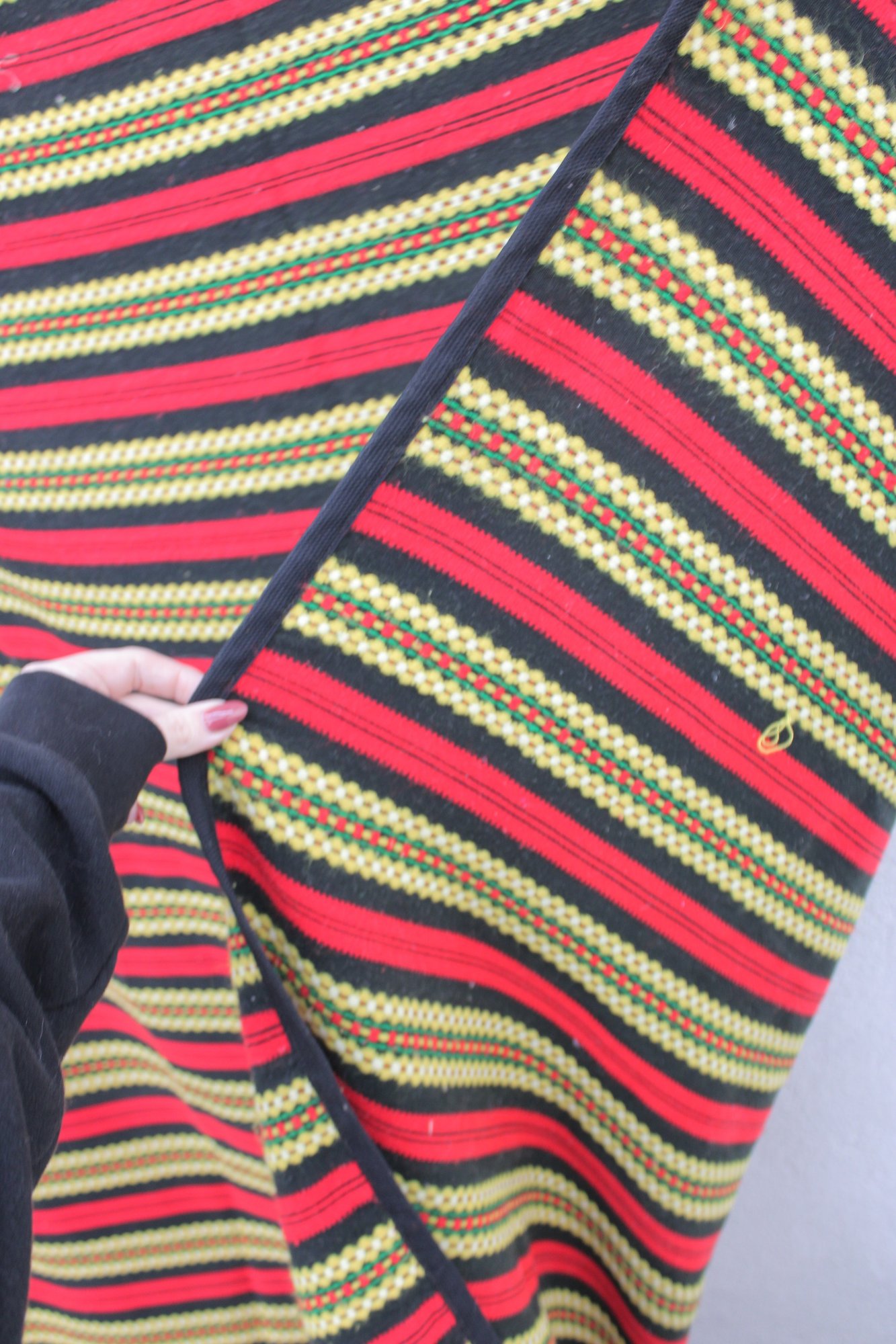 Eye-catching vintage woven textile featuring bold horizontal stripes in red, yellow, green, and black. This large, versatile piece has a striking geometric look that works beautifully as a blanket, wall hanging, picnic throw, or layered décor accent in boho, eclectic, or global-inspired interiors.