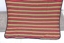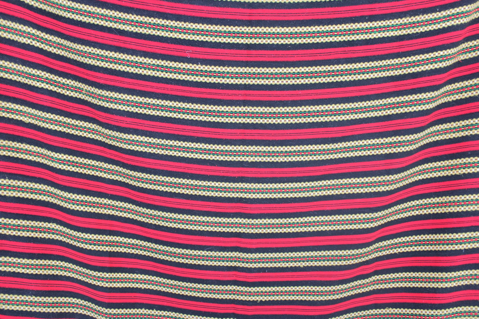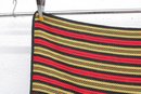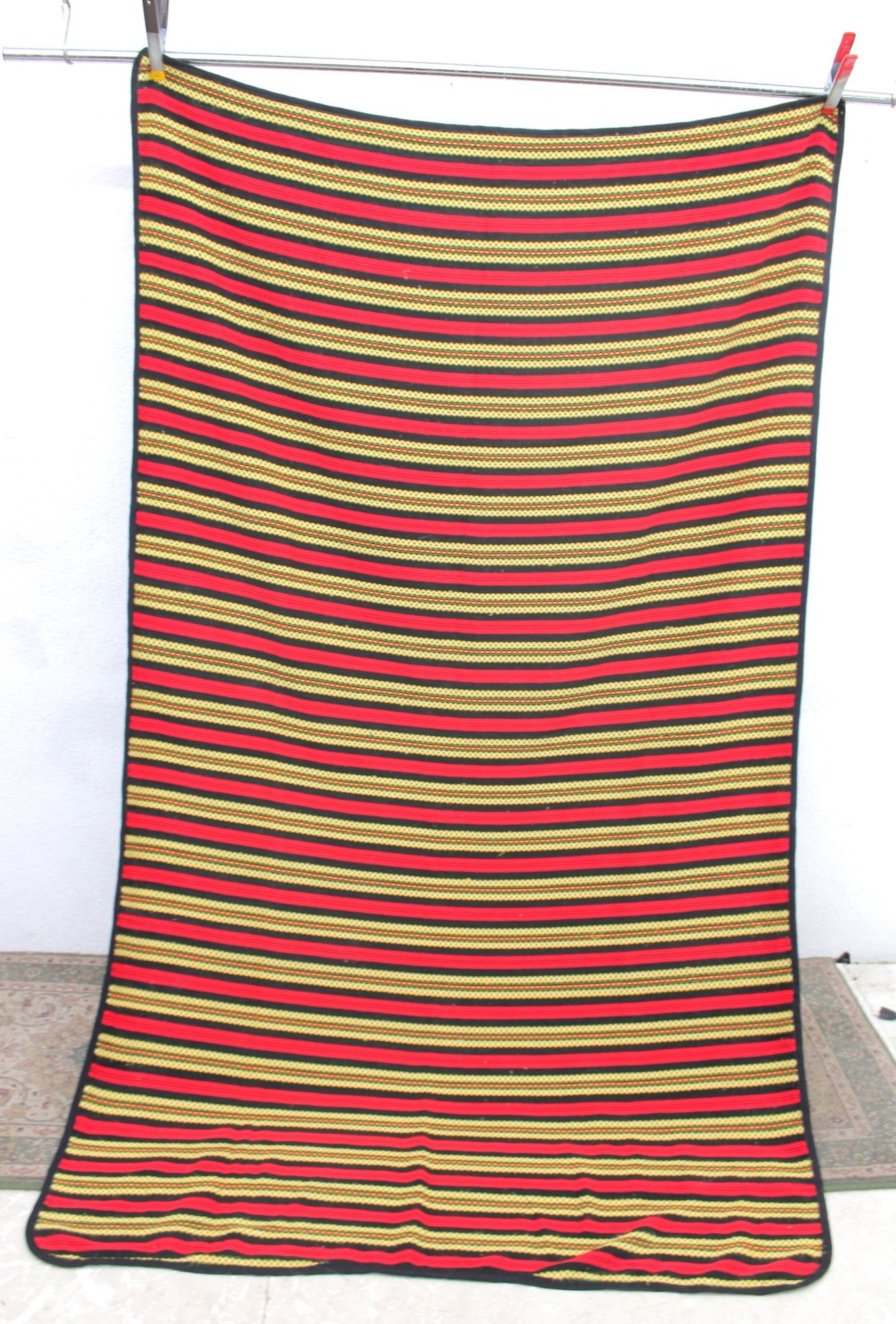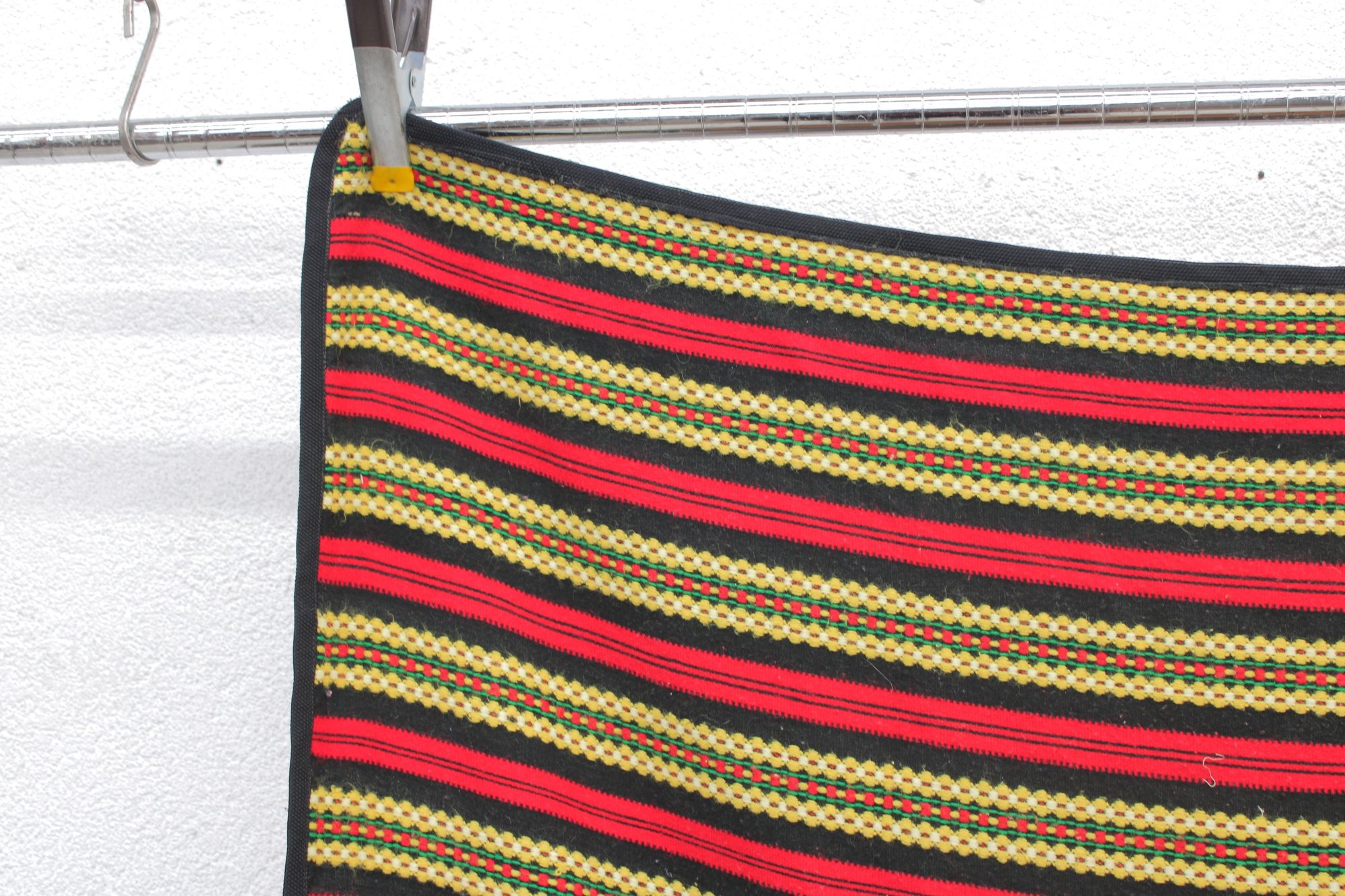 Eye-catching vintage woven textile featuring bold horizontal stripes in red, yellow, green, and black. This large, versatile piece has a striking geometric look that works beautifully as a blanket, wall hanging, picnic throw, or layered décor accent in boho, eclectic, or global-inspired interiors.