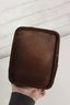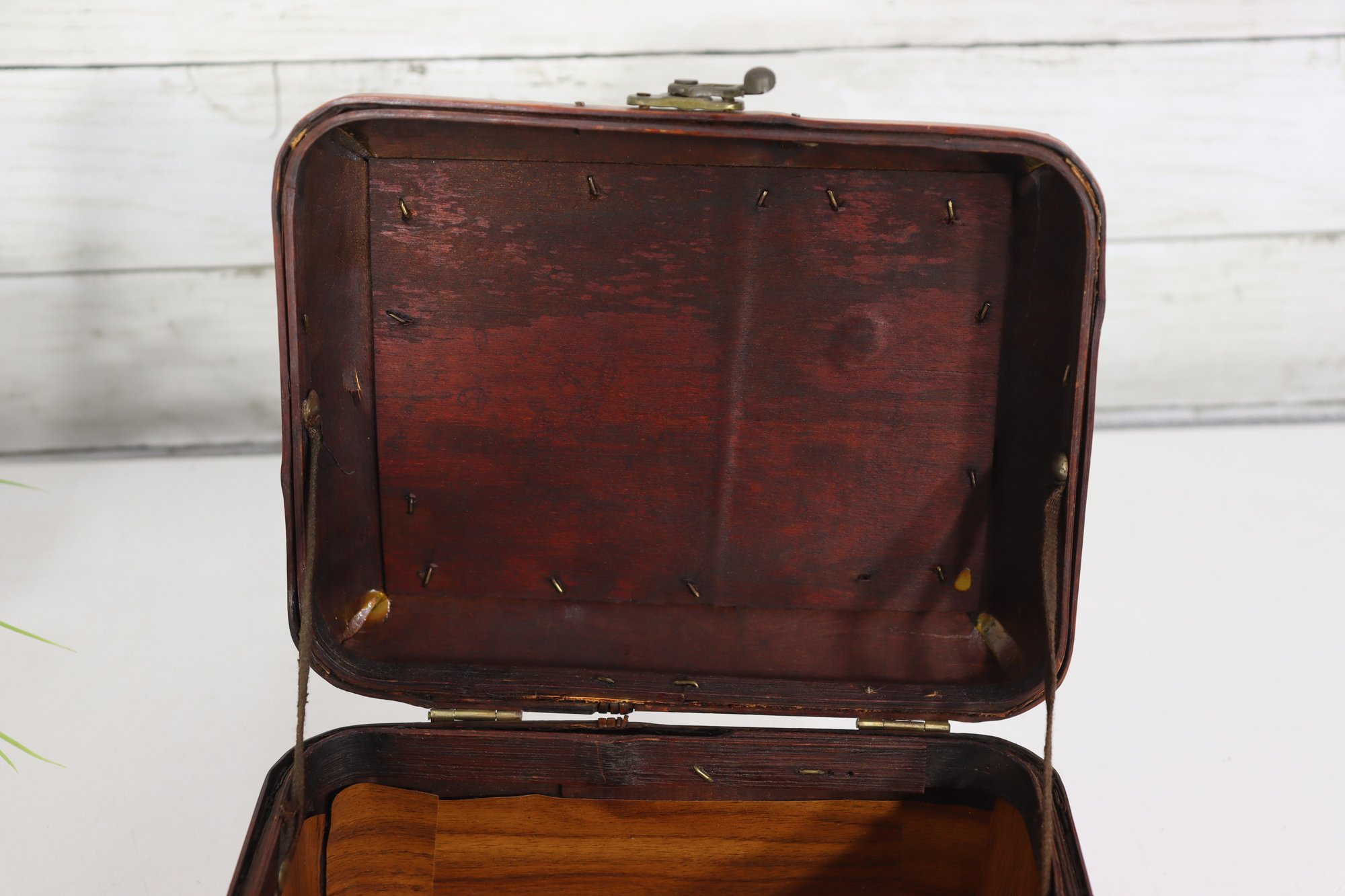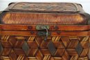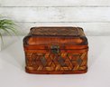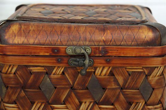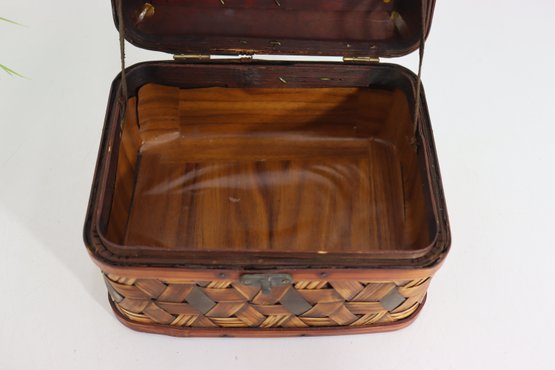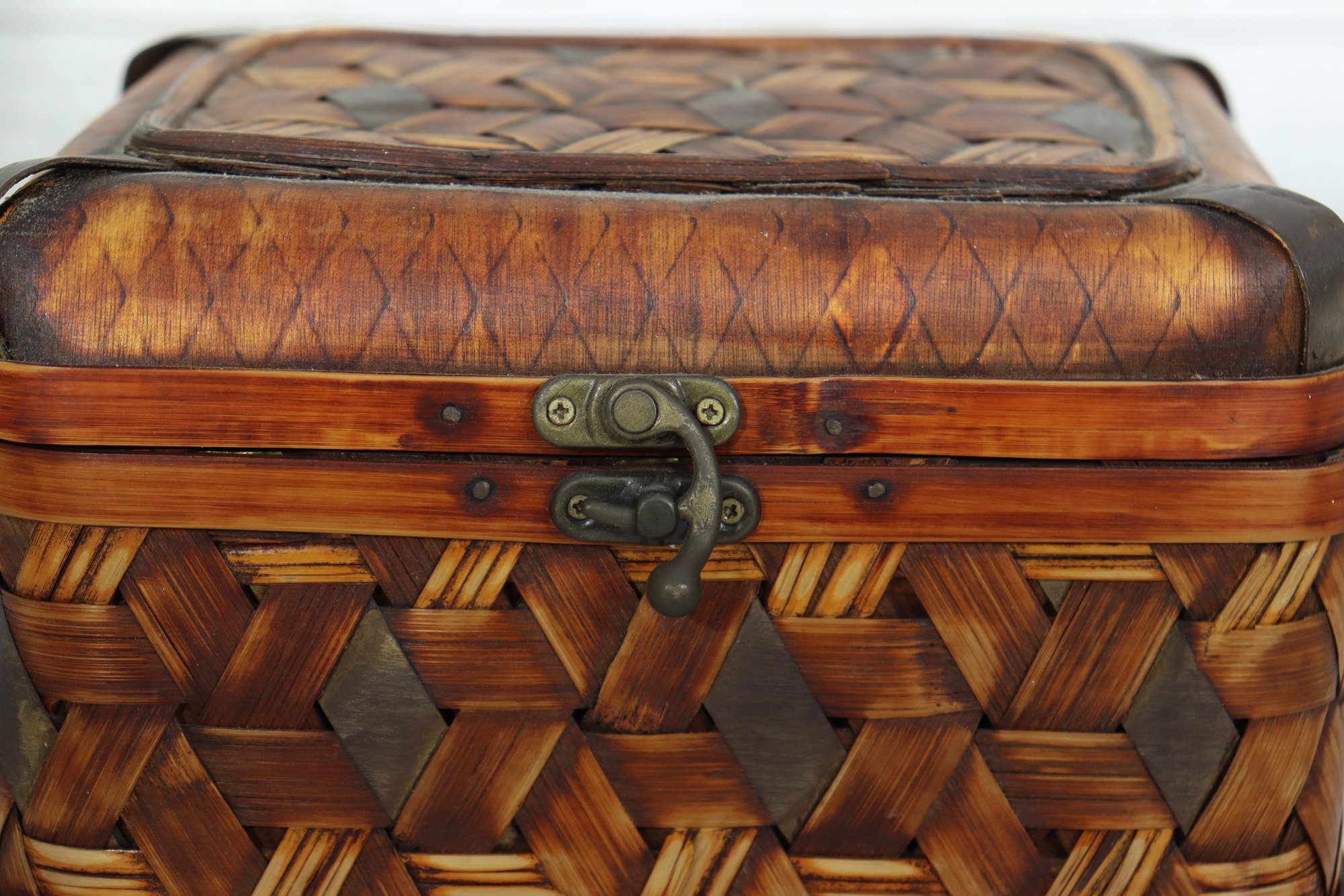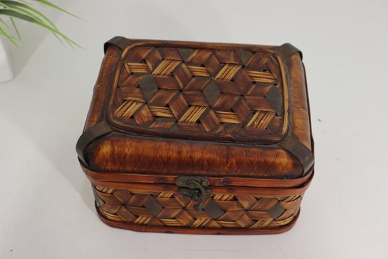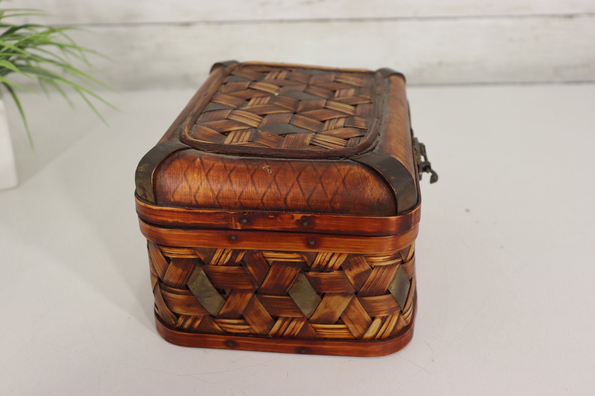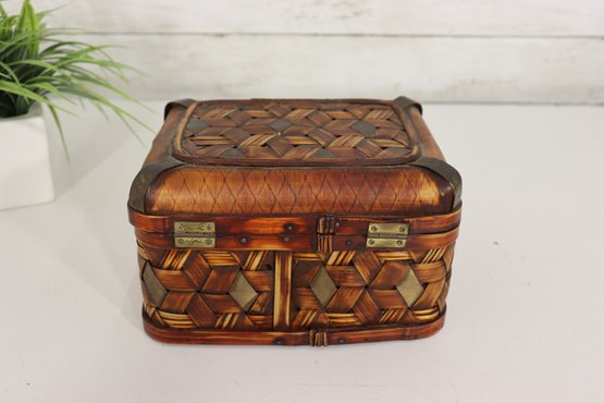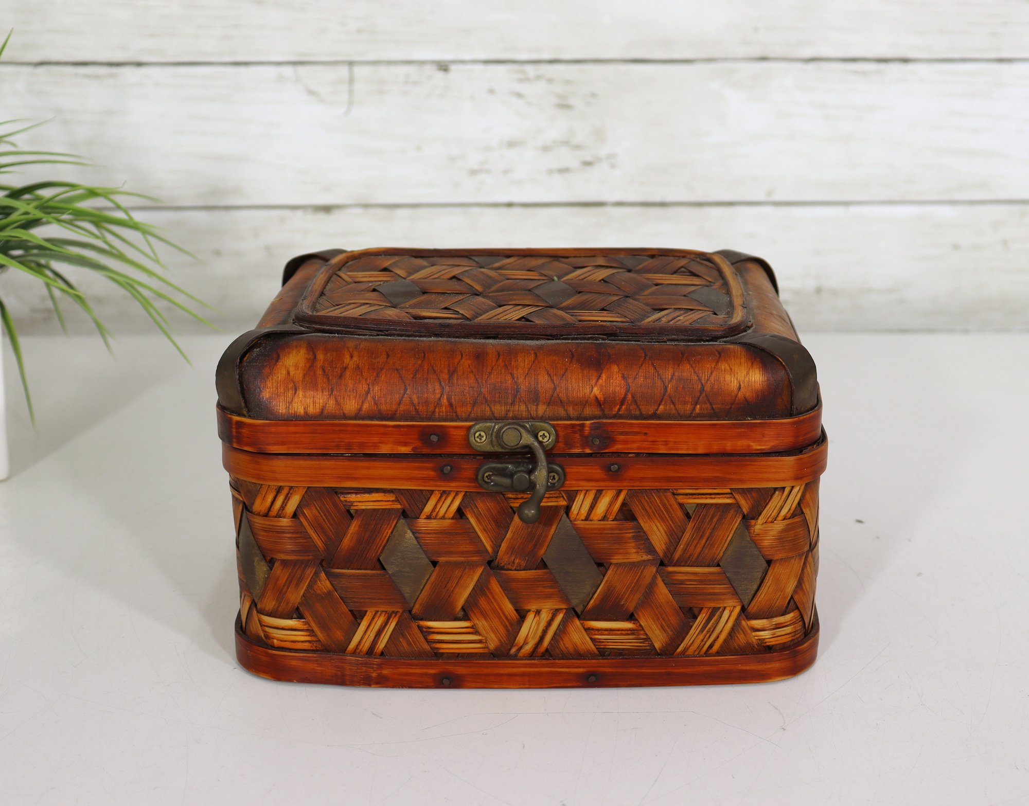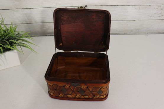 Beautiful vintage woven wood trinket / keepsake box featuring a geometric basket weave design and rustic aged finish. The box has a hinged lid with decorative patterning and an antique style metal latch closure. Interior is clean and wood lined.