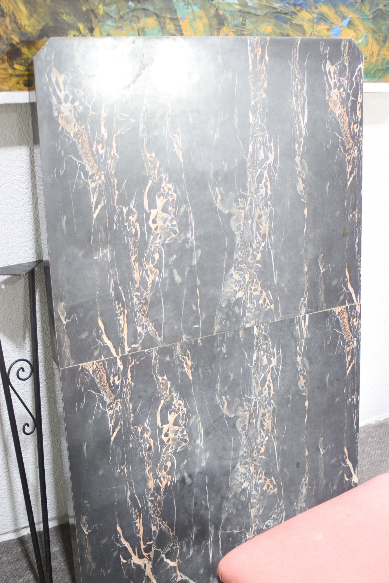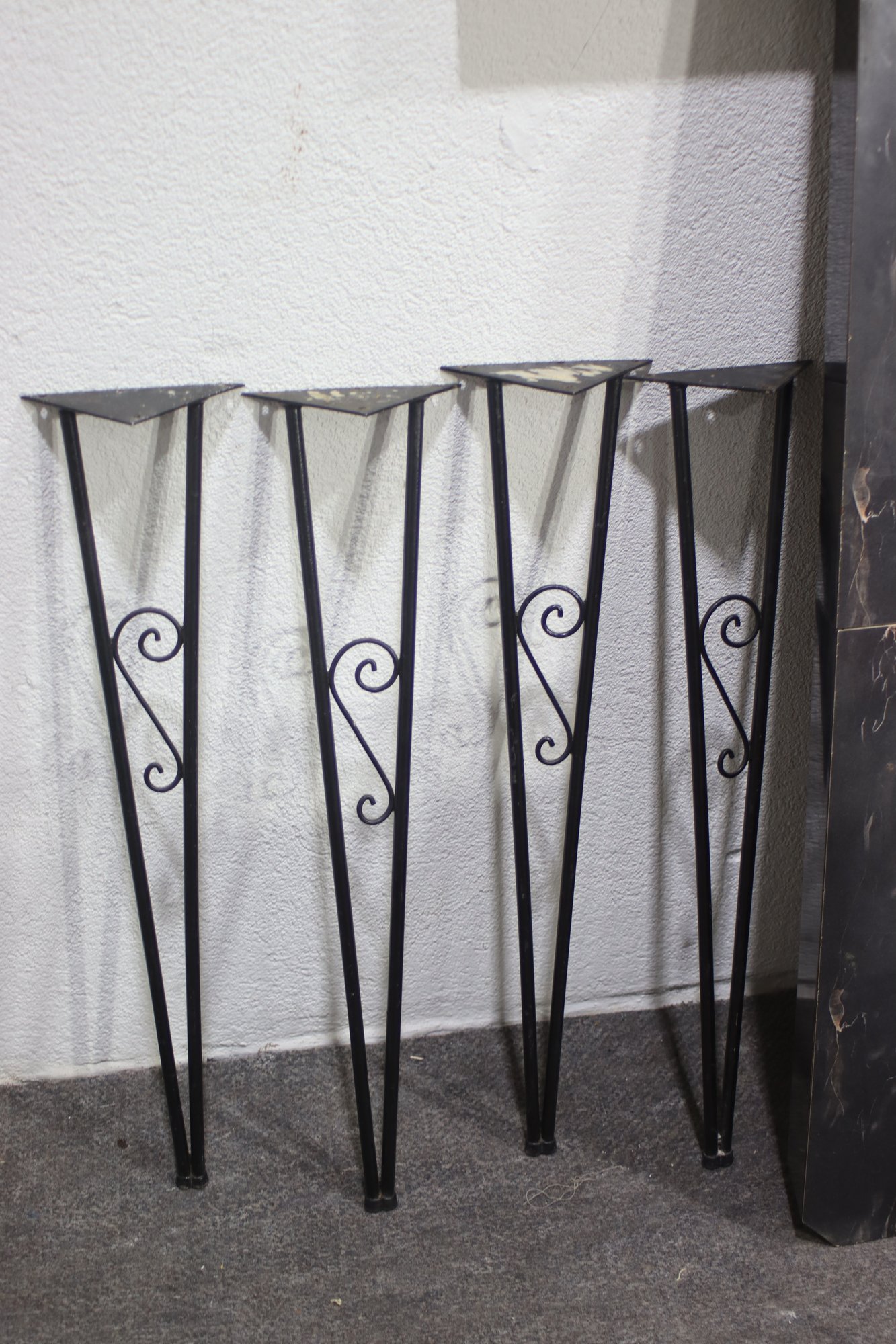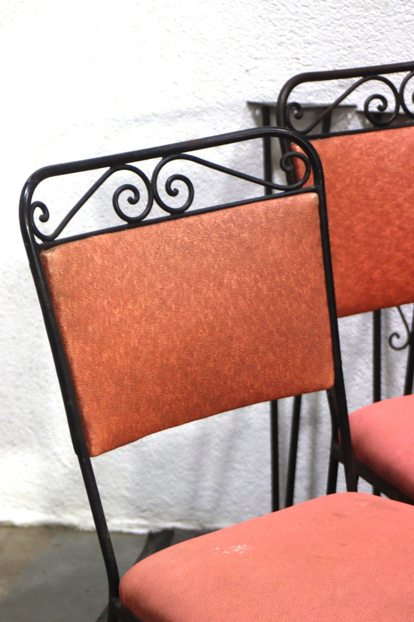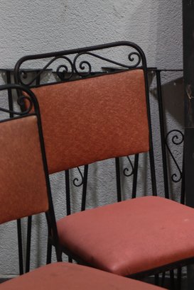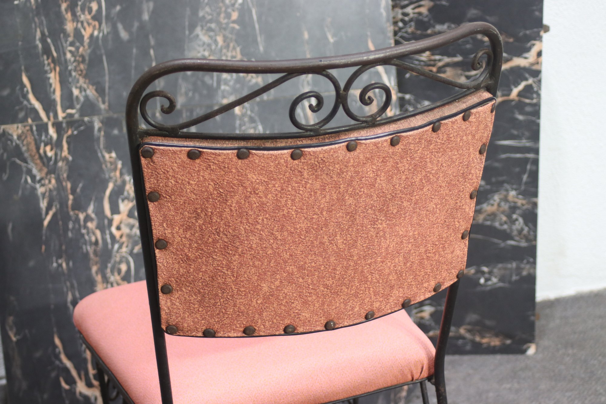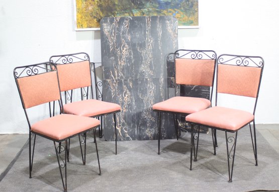 Elevate your dining space with this stunning vintage wrought iron dining set. Featuring four elegantly designed chairs with intricate scrollwork and comfortable upholstered seats, this set exudes timeless charm. The table base mirrors the chairs' intricate wrought iron design, supporting a striking black marble tabletop with natural veining. The set includes four removable matching wrought iron legs for easy assembly. Ideal for indoor or outdoor use, this elegant set is perfect for any space looking to add a touch of vintage sophistication. Don't miss out on this unique and stylish dining ensemble!