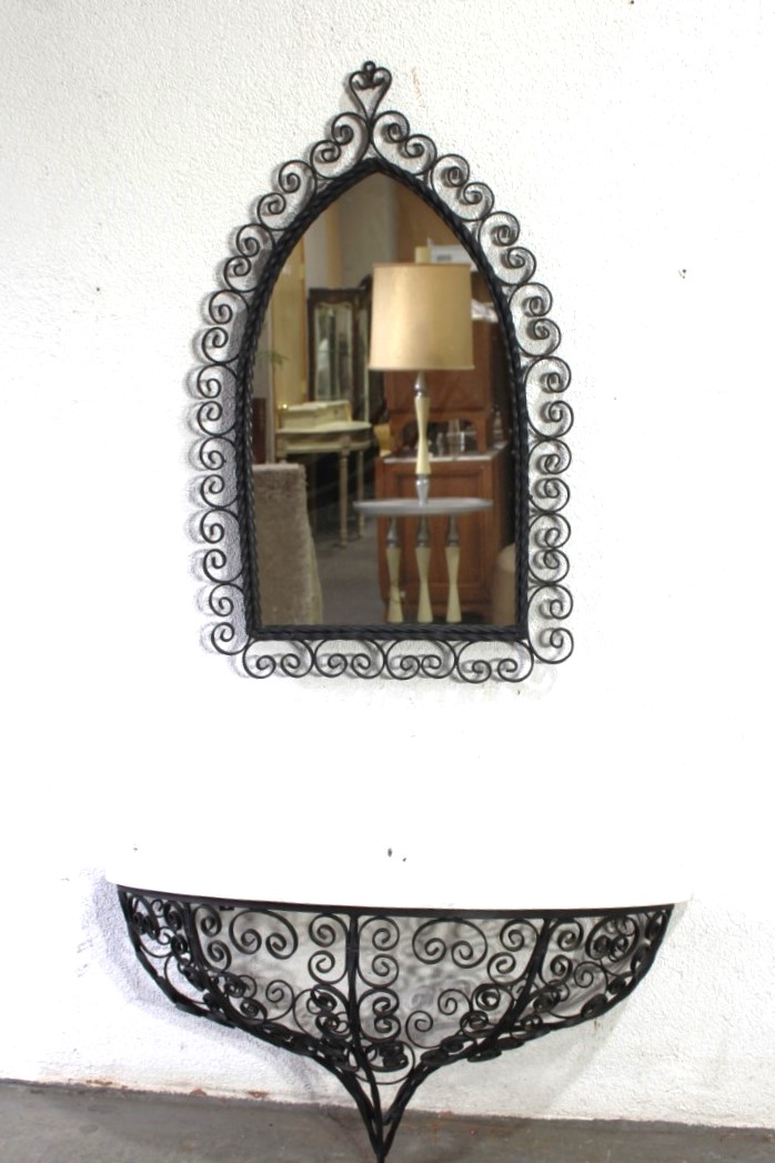 featuring a beautifully detailed wrought iron mirror and matching console table with a marble top. The set includes: