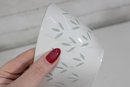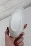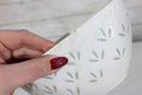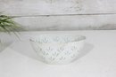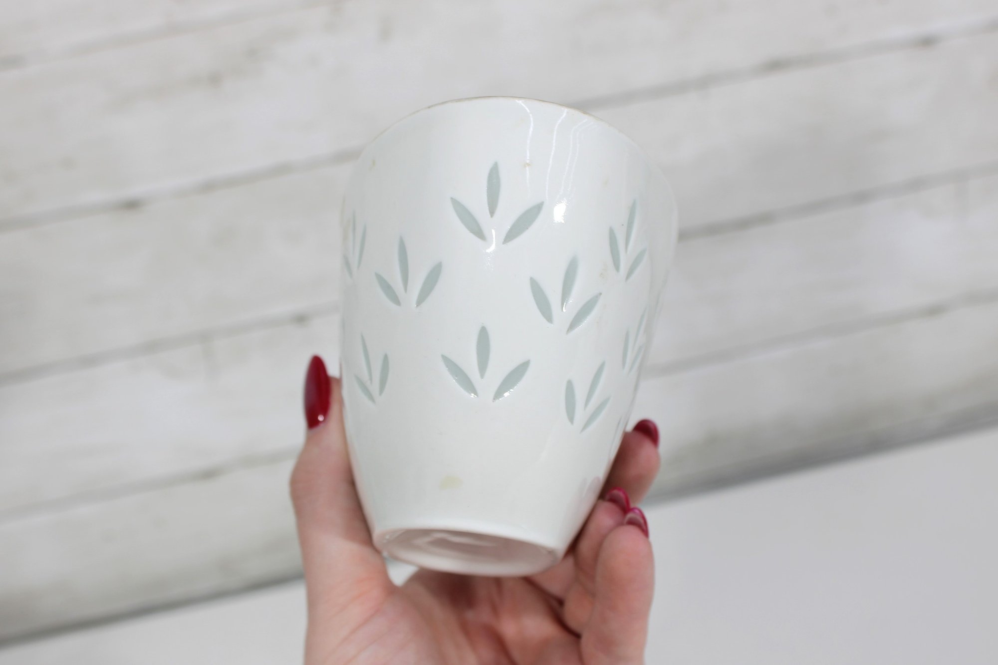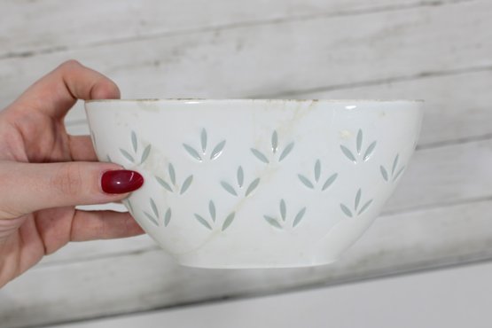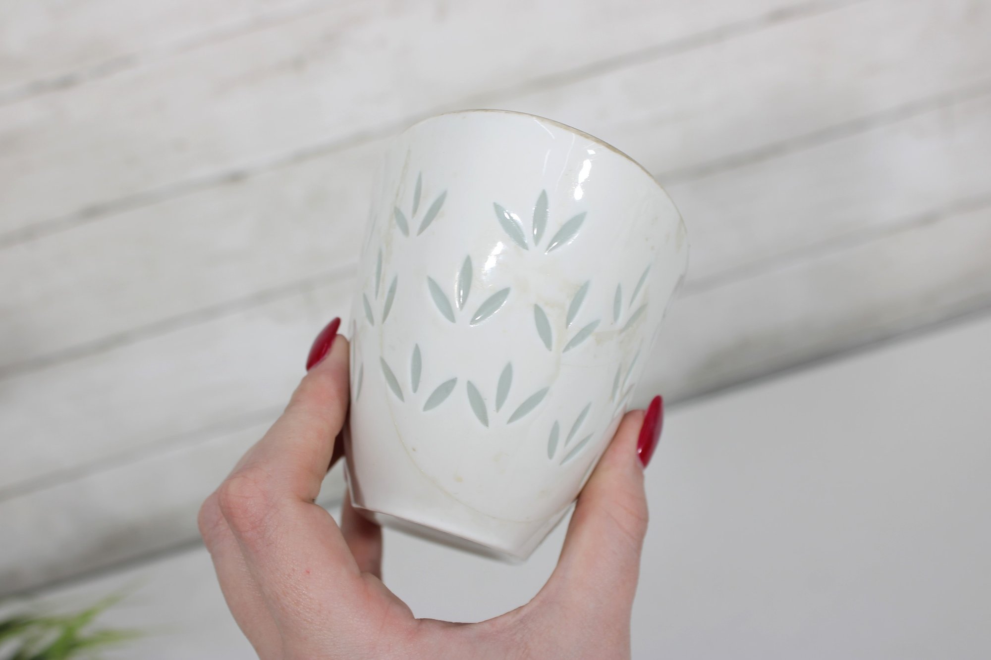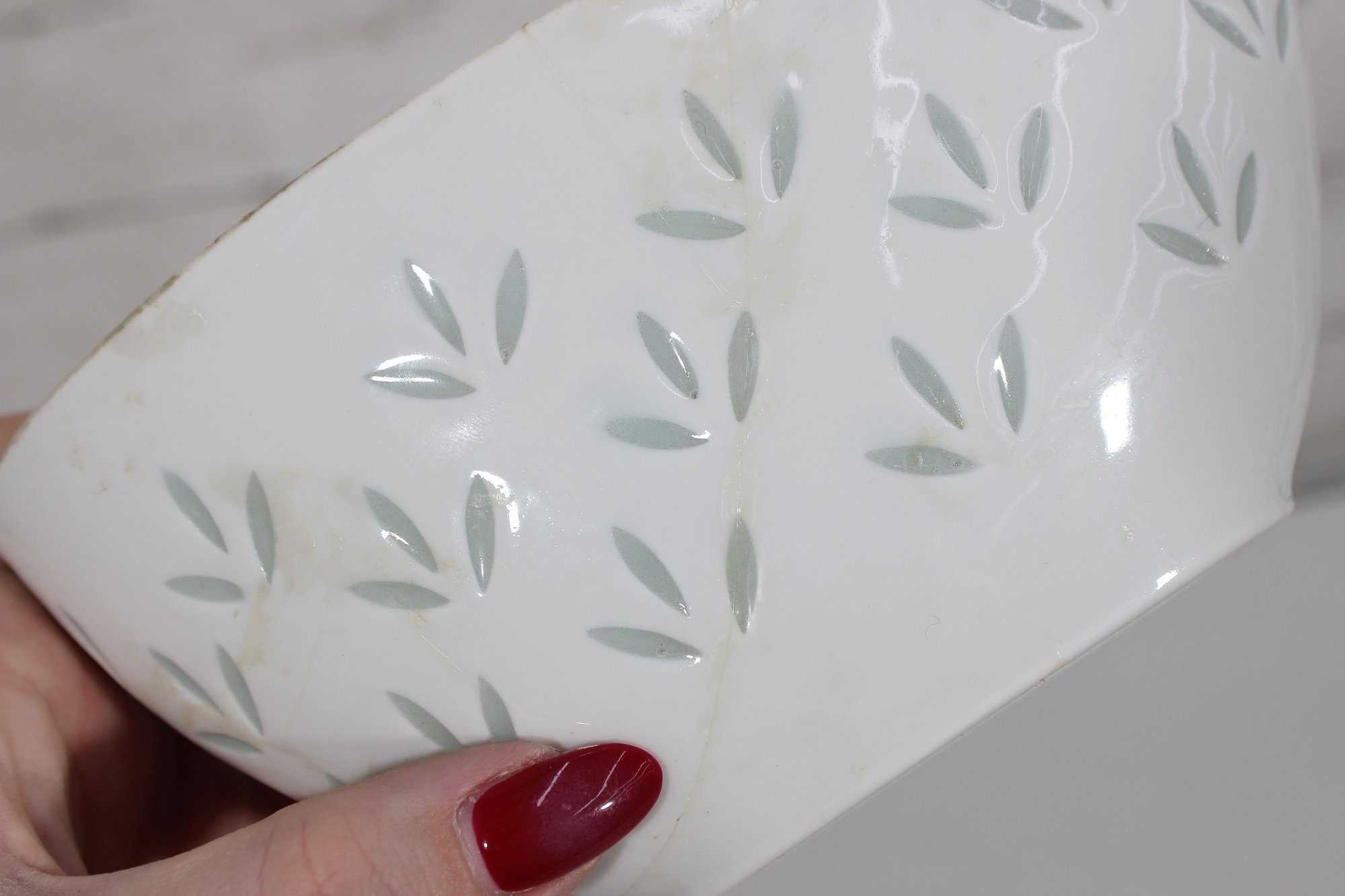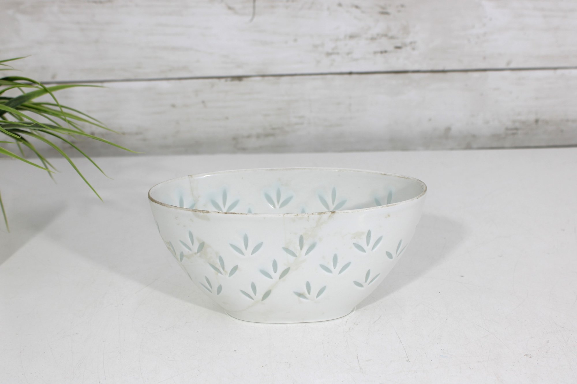 Vintage mid-century modern porcelain rice bowl by Arabia Finland, featuring a clean white glaze with a subtle repeating leaf pattern in soft gray tones. The minimalist Scandinavian design makes this piece both functional and visually appealing.