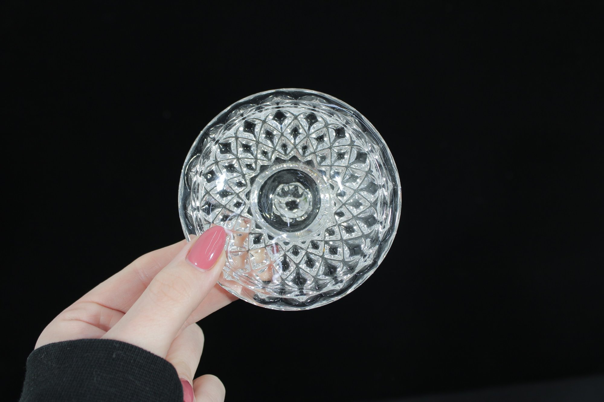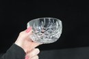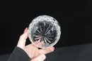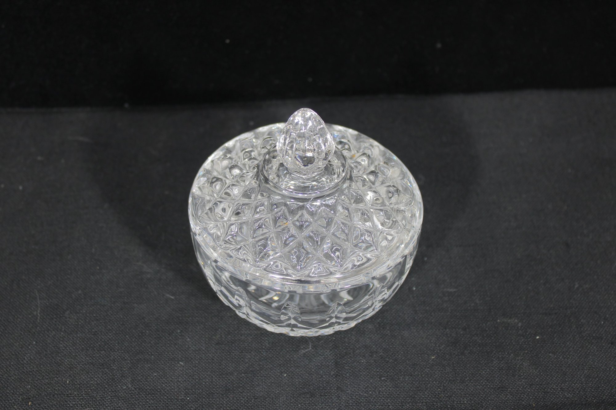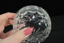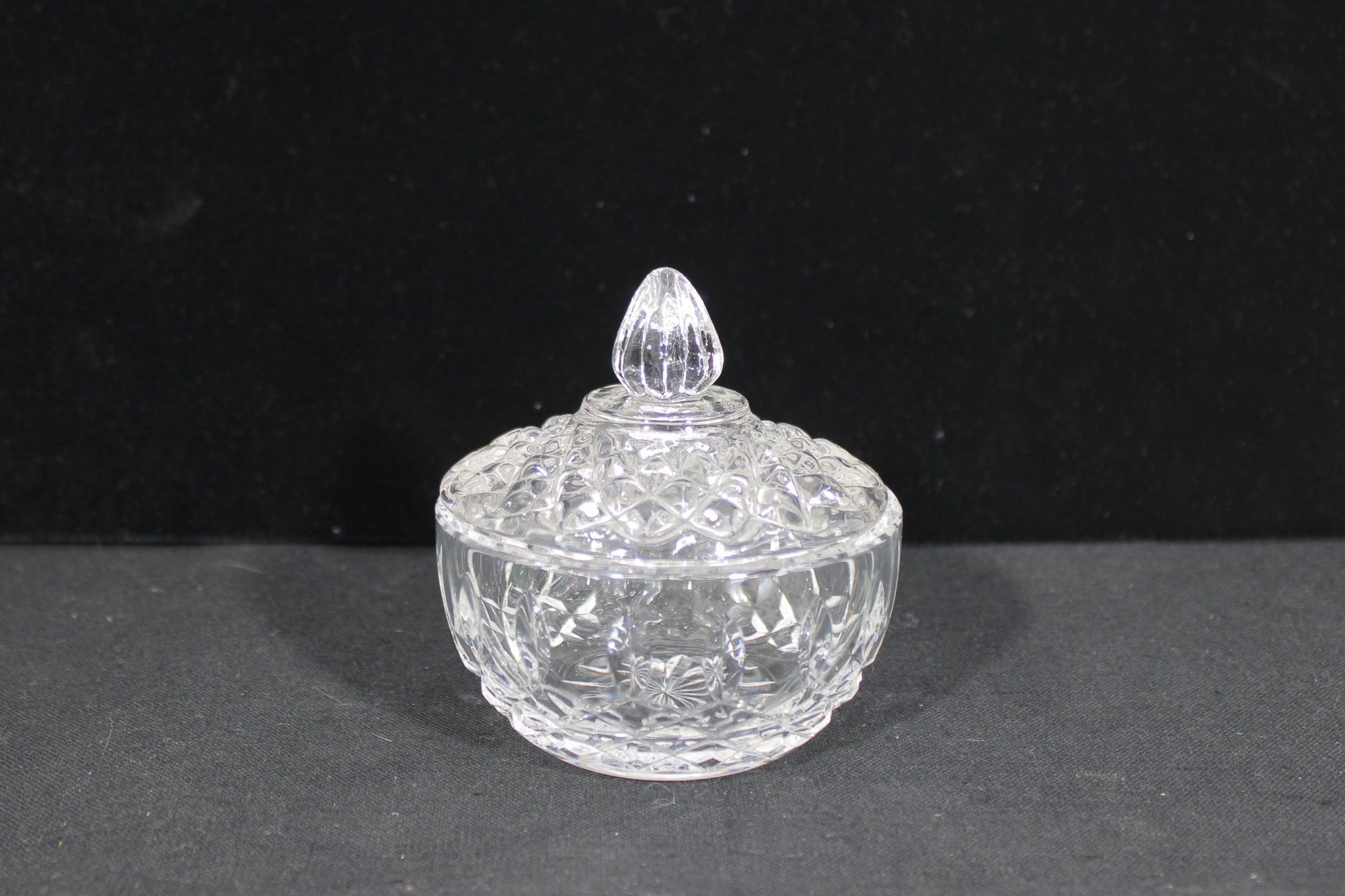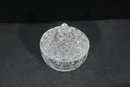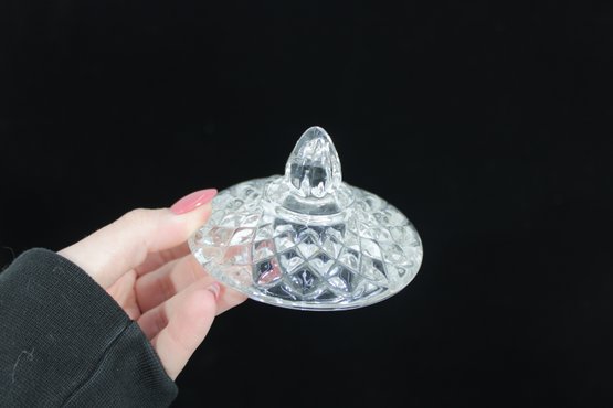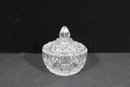 The piece includes a matching cut crystal lid with a faceted finial, adding to its refined presentation. Perfect for use on a tea or coffee service, or as a decorative crystal dish for candies, trinkets, or small keepsakes.