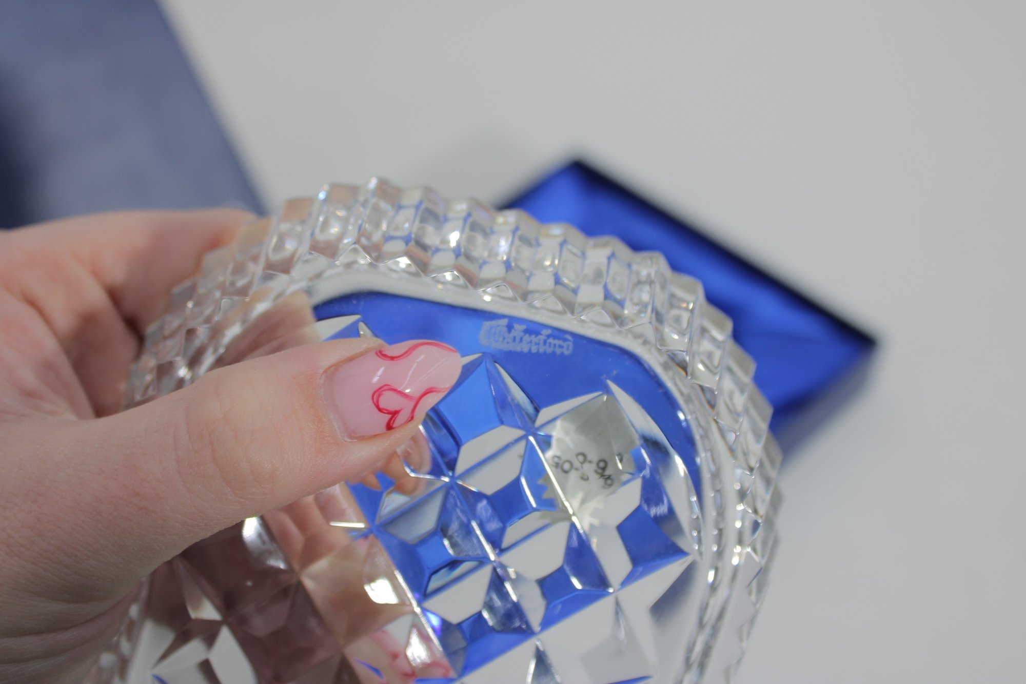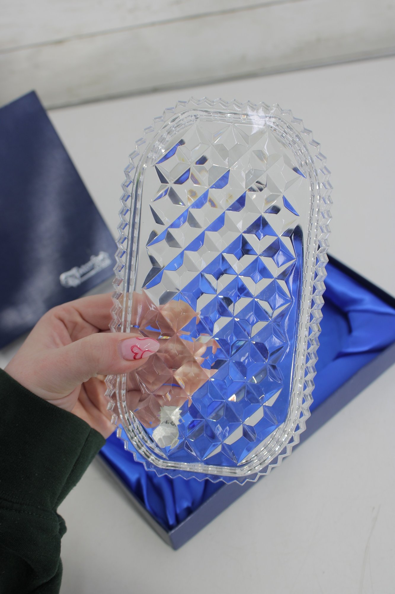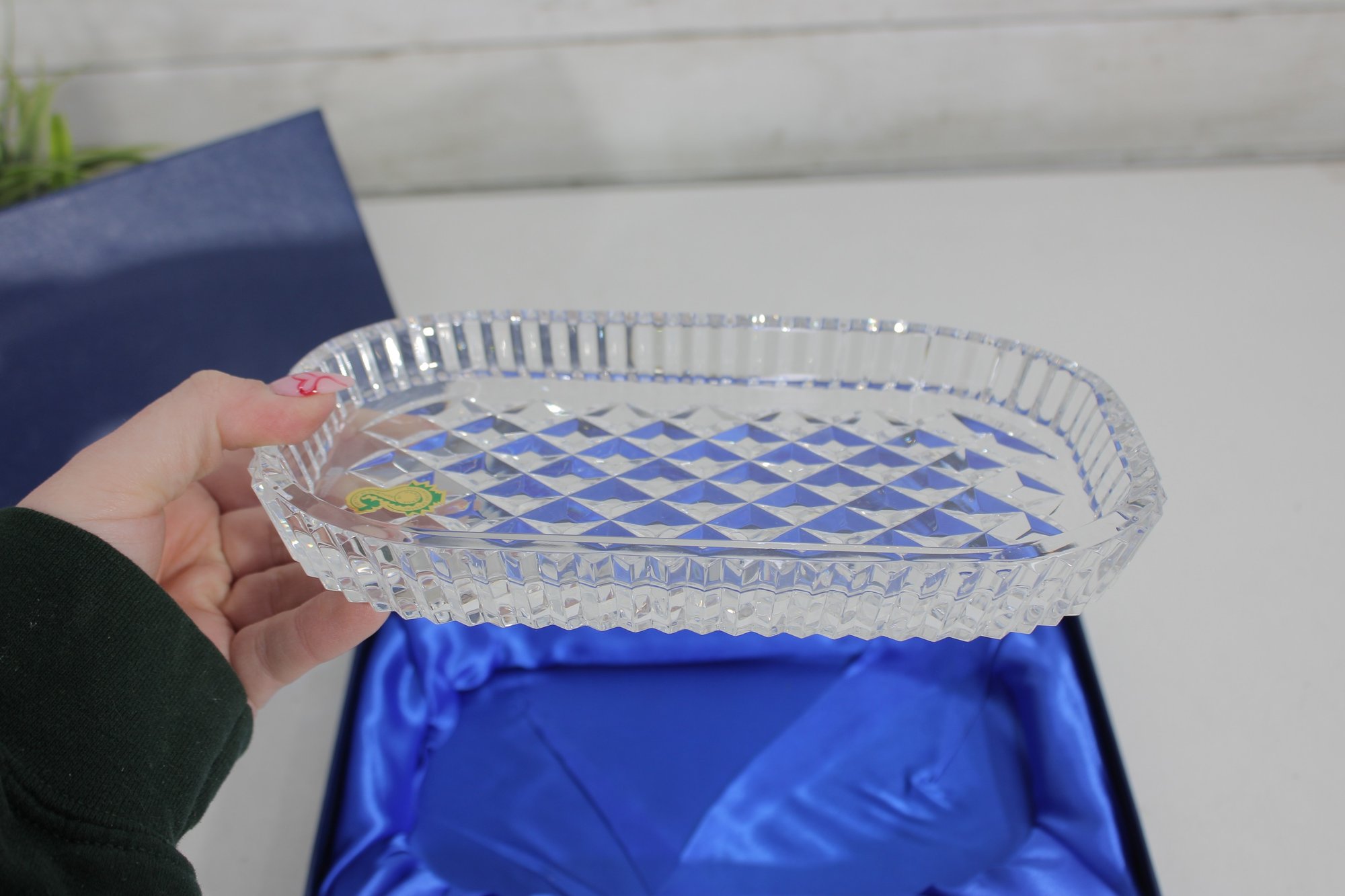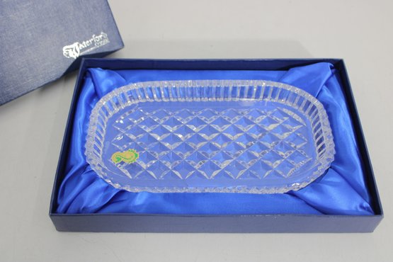 This versatile piece is ideal as a relish tray, small serving platter, candy dish, or vanity tray. It is presented in its original Waterford box with the care booklet included, making it especially appealing for collectors or gift-giving.
