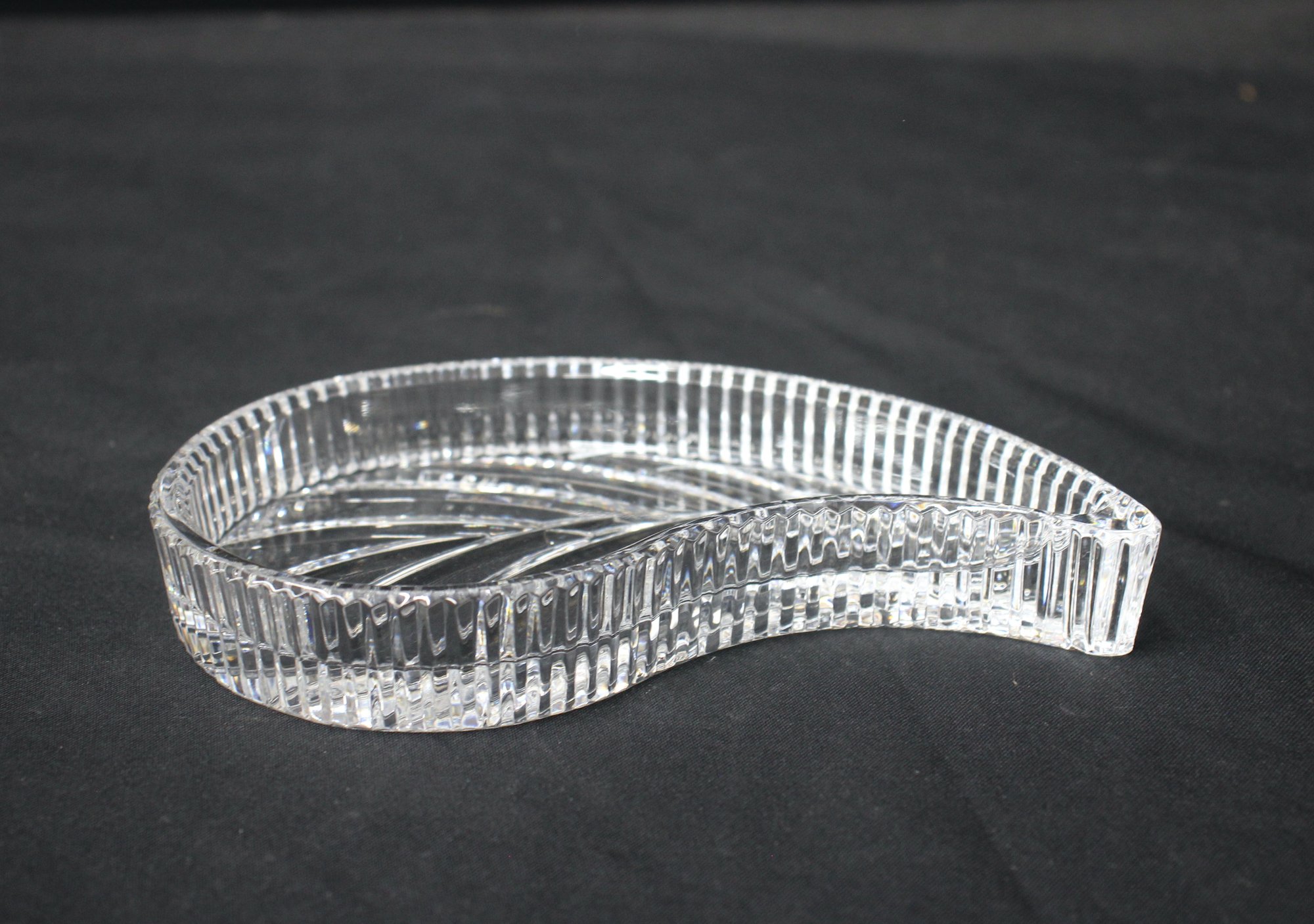 Presenting an exquisite Waterford Crystal paisley-shaped dish, a stunning piece showcasing the renowned craftsmanship of Waterford. The intricate leaf pattern within the dish is beautifully accentuated by the precise cuts that capture and reflect light. This dish is a perfect blend of functionality and elegance, ideal for serving or as a decorative centerpiece
