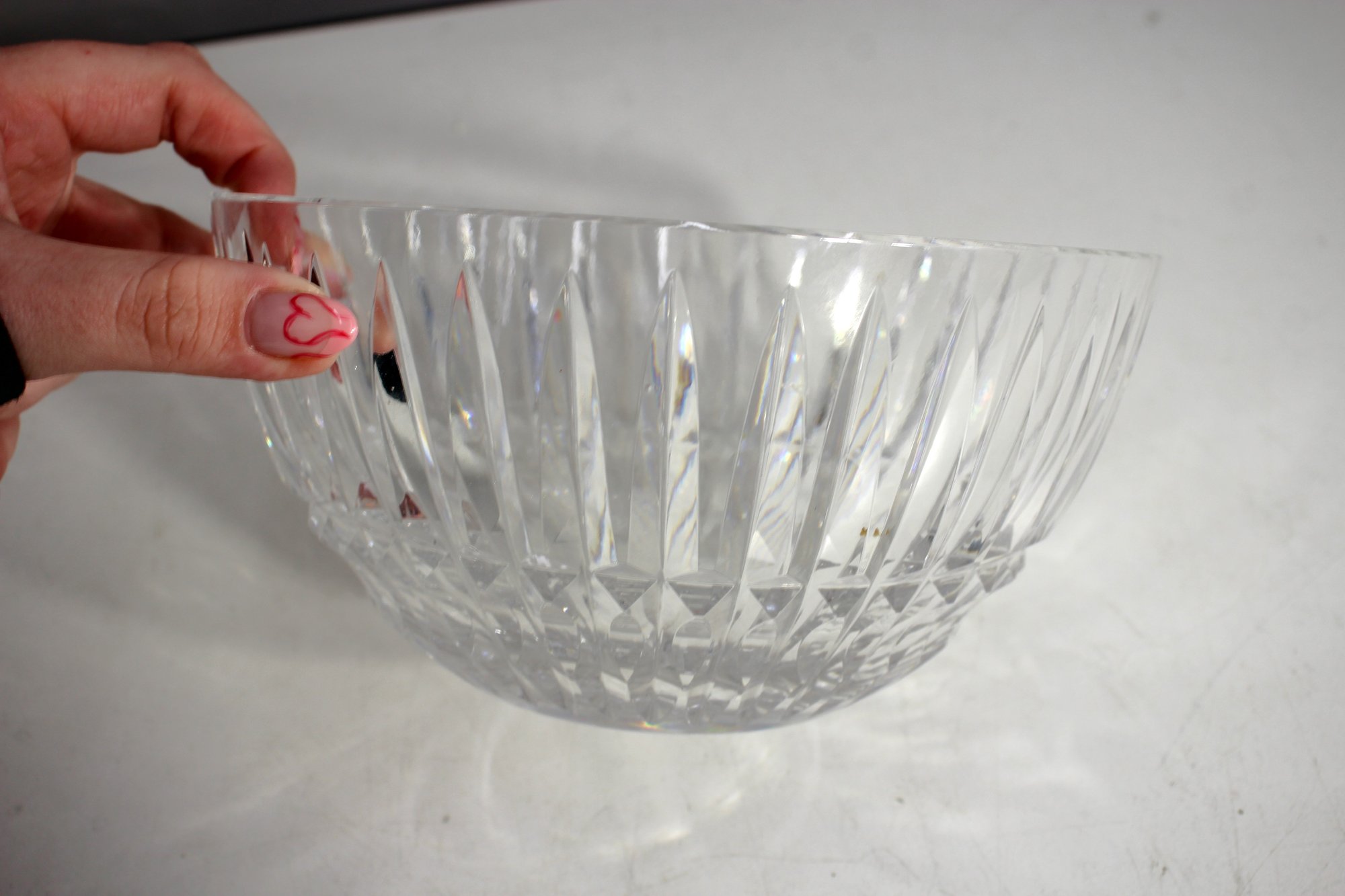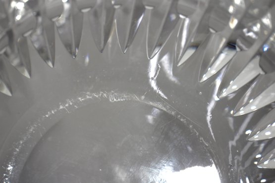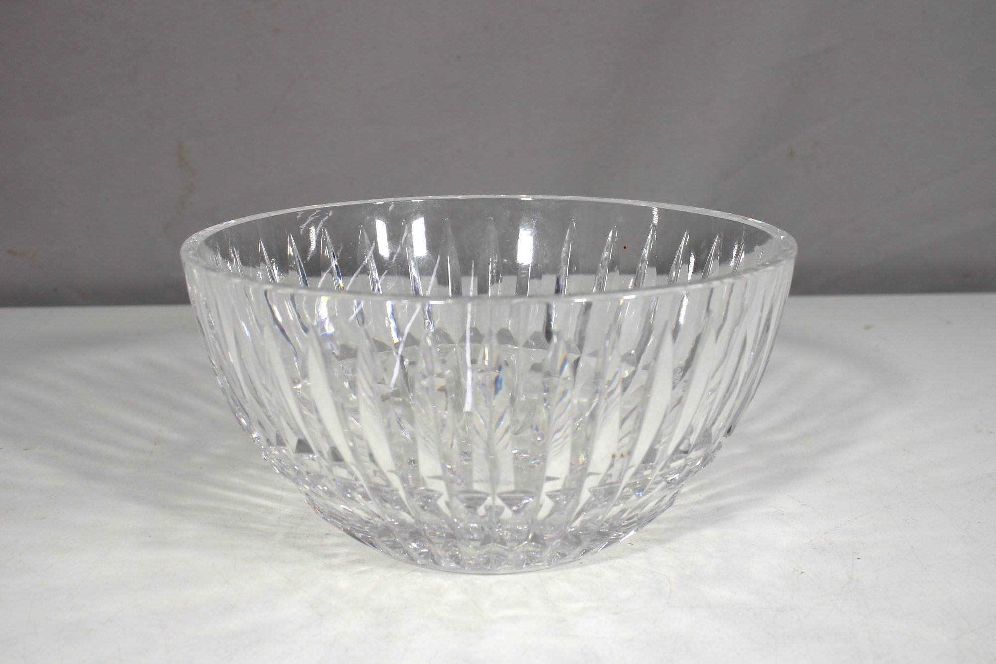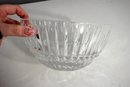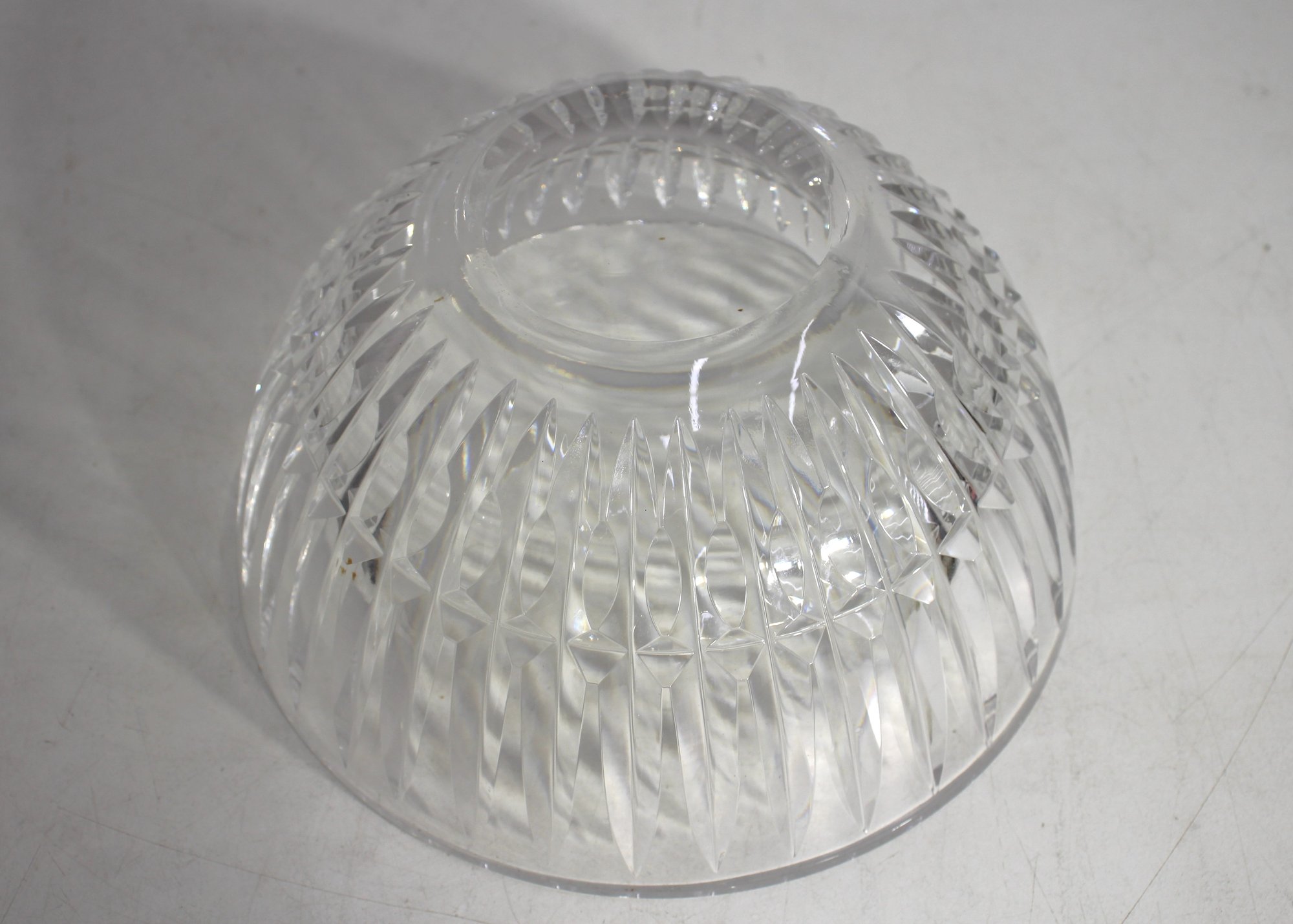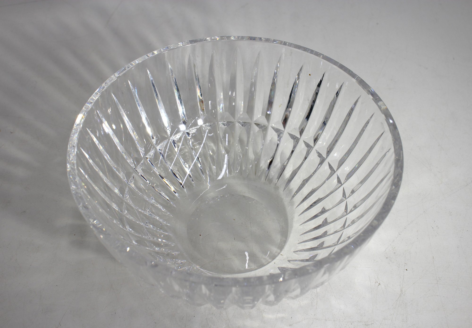 Waterford crystal bowl featuring a master cutter design. This elegant piece boasts brilliant clarity with beautifully cut vertical lines and diamond patterns that capture and reflect light. Measuring 4 inches in height and 8 inches in diameter, this bowl is perfect for display or use as a centerpiece. A stunning addition to any collection of fine crystal.