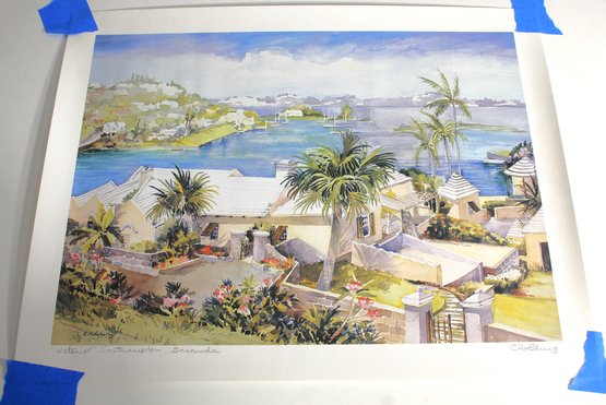 This is an exquisite unframed watercolor print titled "Waterlot, Southampton, Bermuda" by renowned Bermudian artist Carole Holding. The piece beautifully captures the vibrant colors and serene landscape of Bermuda, showcasing the artist's skill in portraying the natural beauty of the island. Signed by the artist, this print is accompanied by an information sheet detailing Holding's accomplishments and exhibitions.