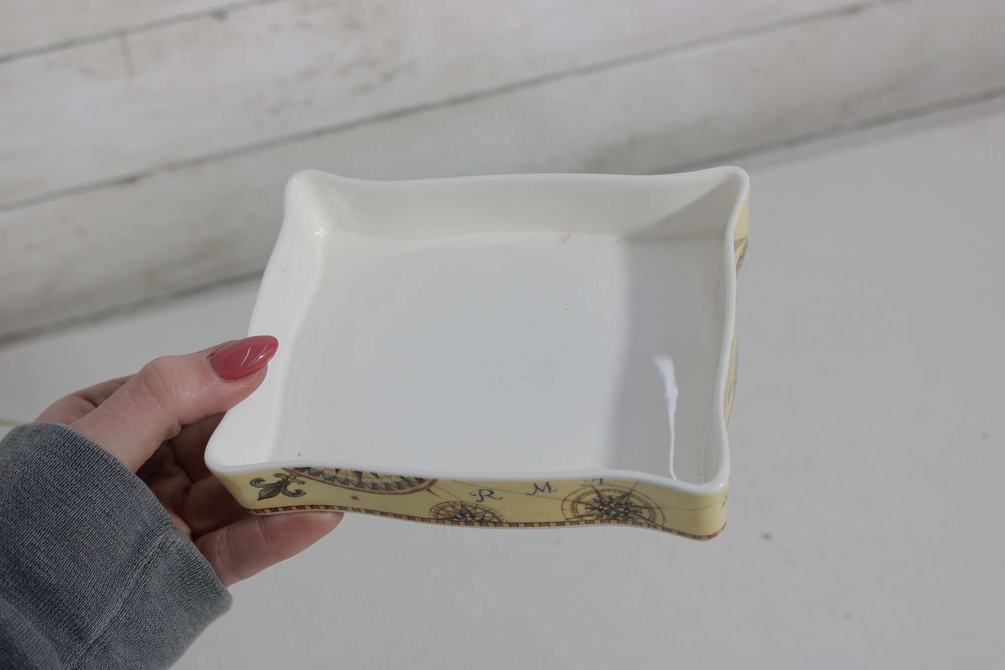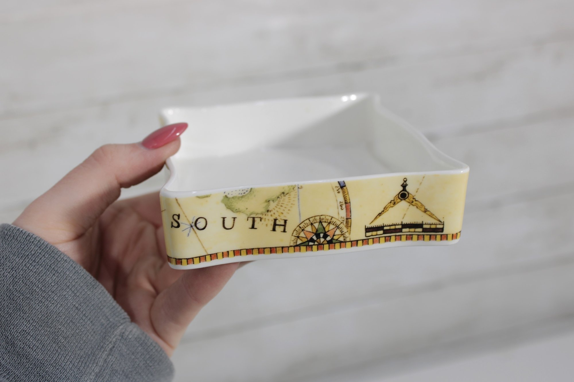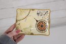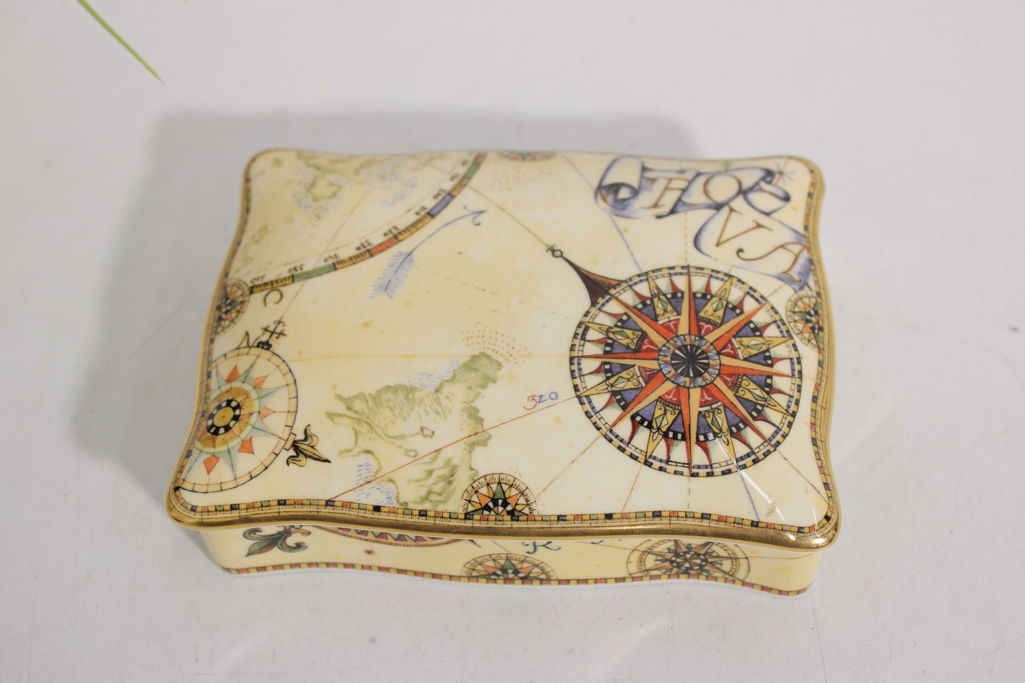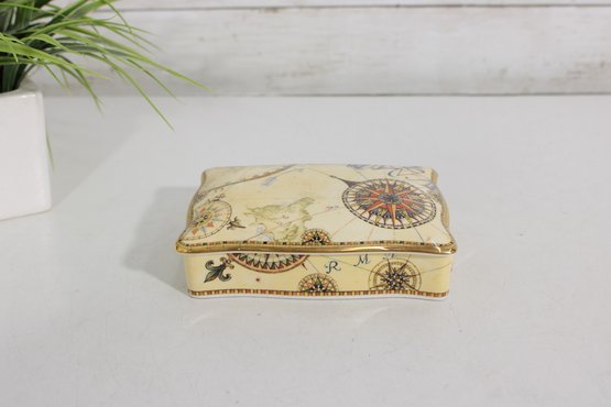 Wedgwood “Atlas” porcelain trinket box, featuring a beautifully detailed design of antique-style maps, compasses, and navigational motifs. The soft cream background is accented with intricate multicolor graphics and finished with delicate gold trim along the edges.