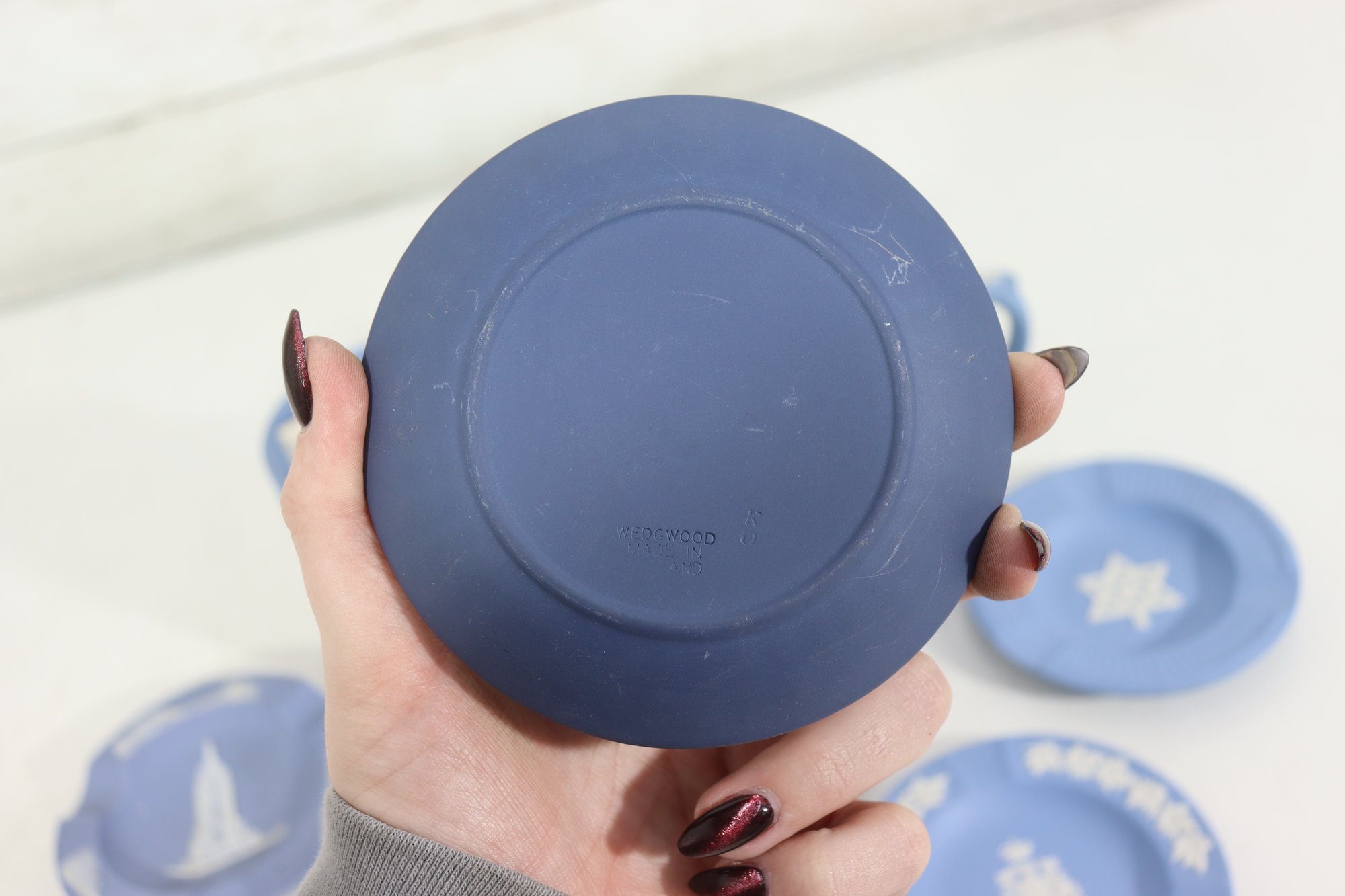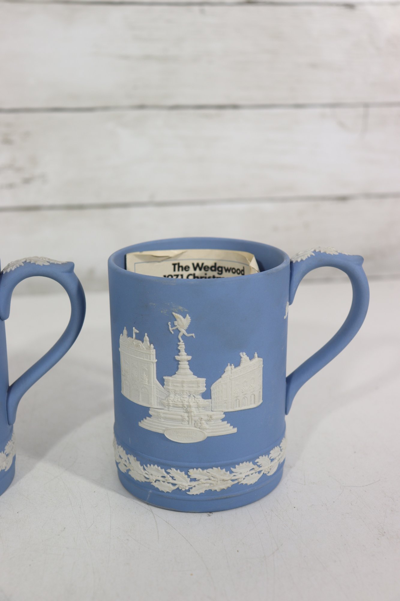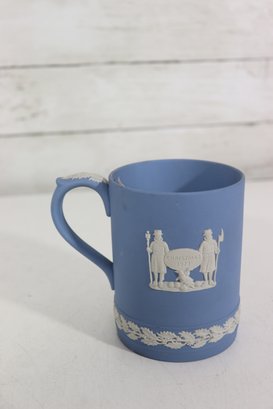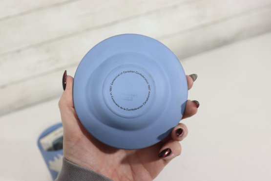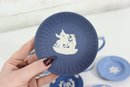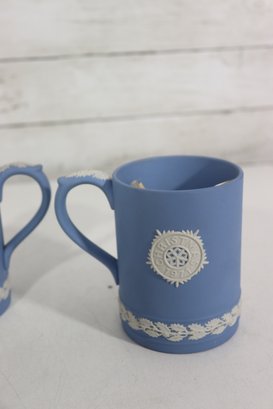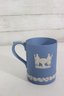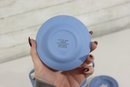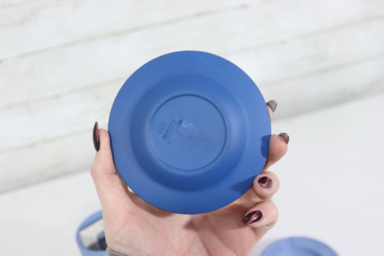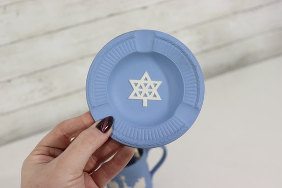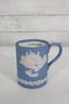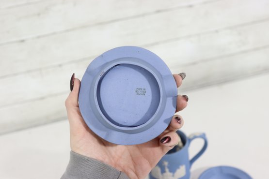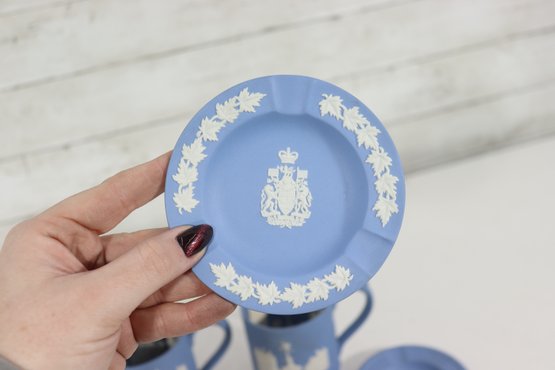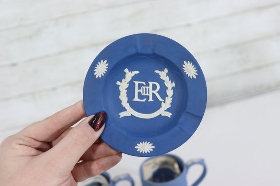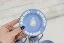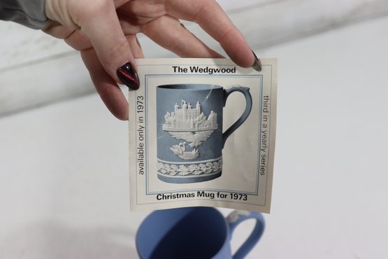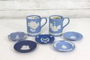 a collectible lot of blue Wedgwood Jasperware, including 1971 Christmas mugs and an assortment of commemorative pin dishes / small plates. Executed in classic Wedgwood blue with white relief decoration, these pieces feature a variety of historic and symbolic motifs.