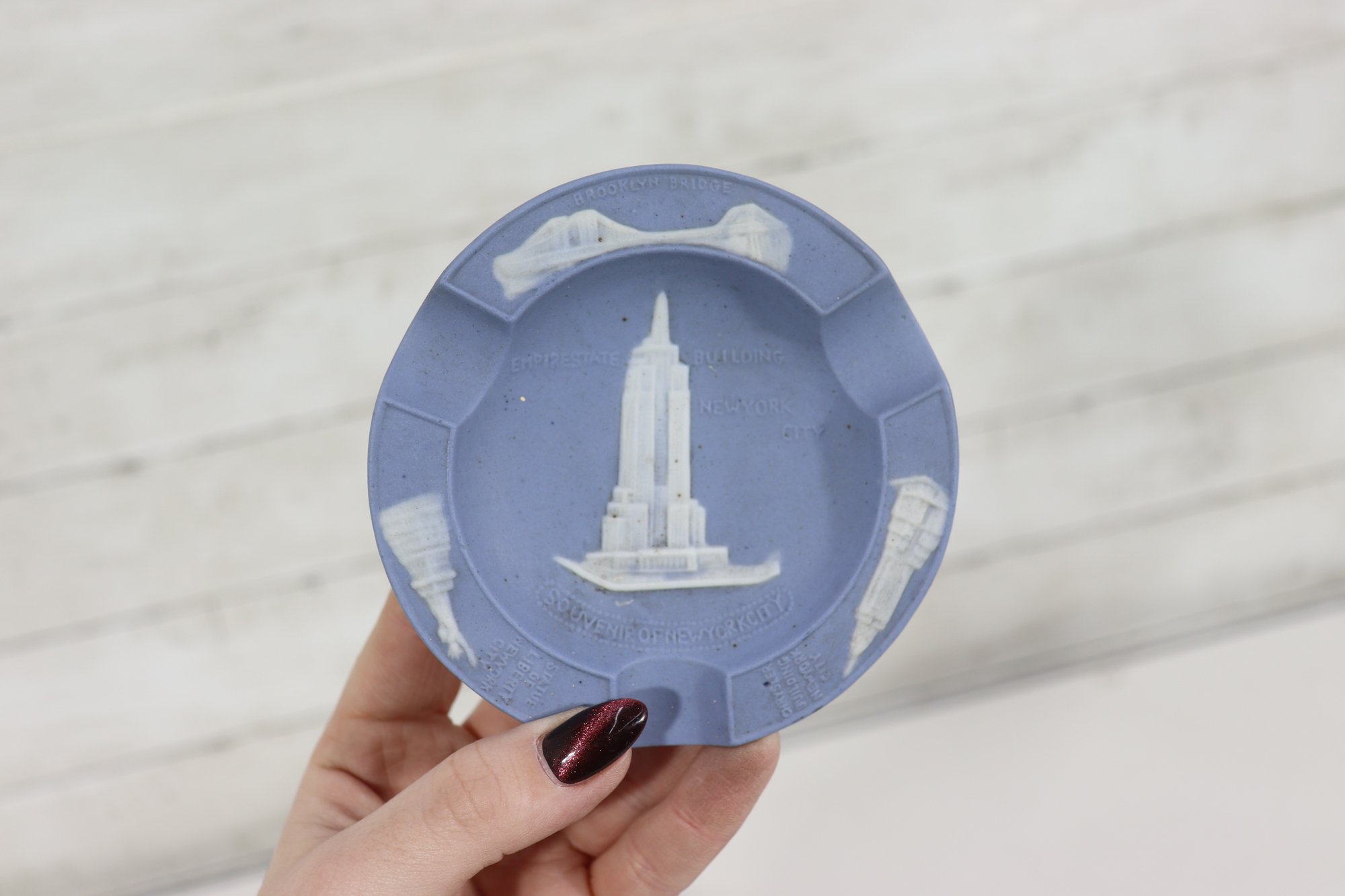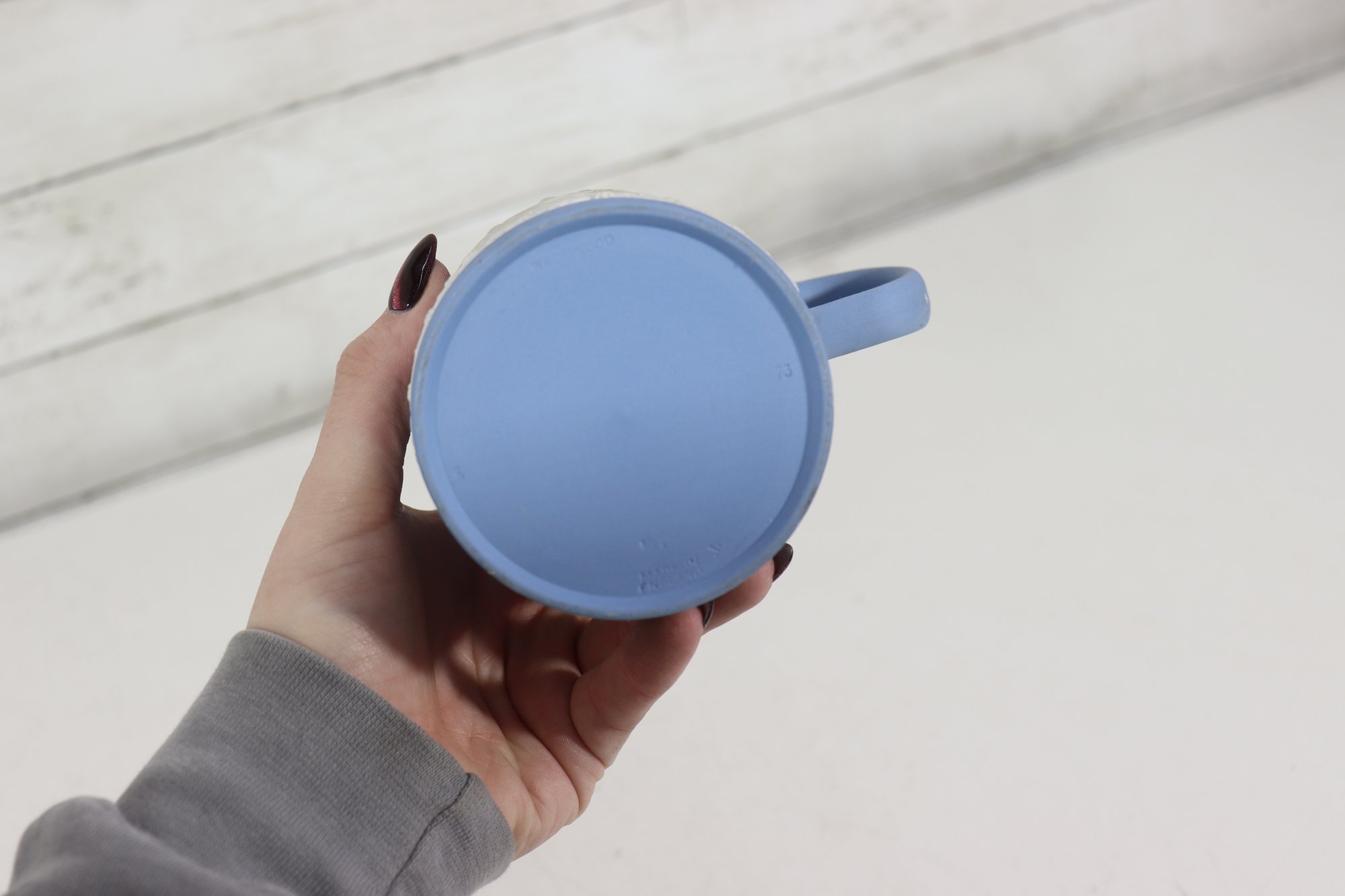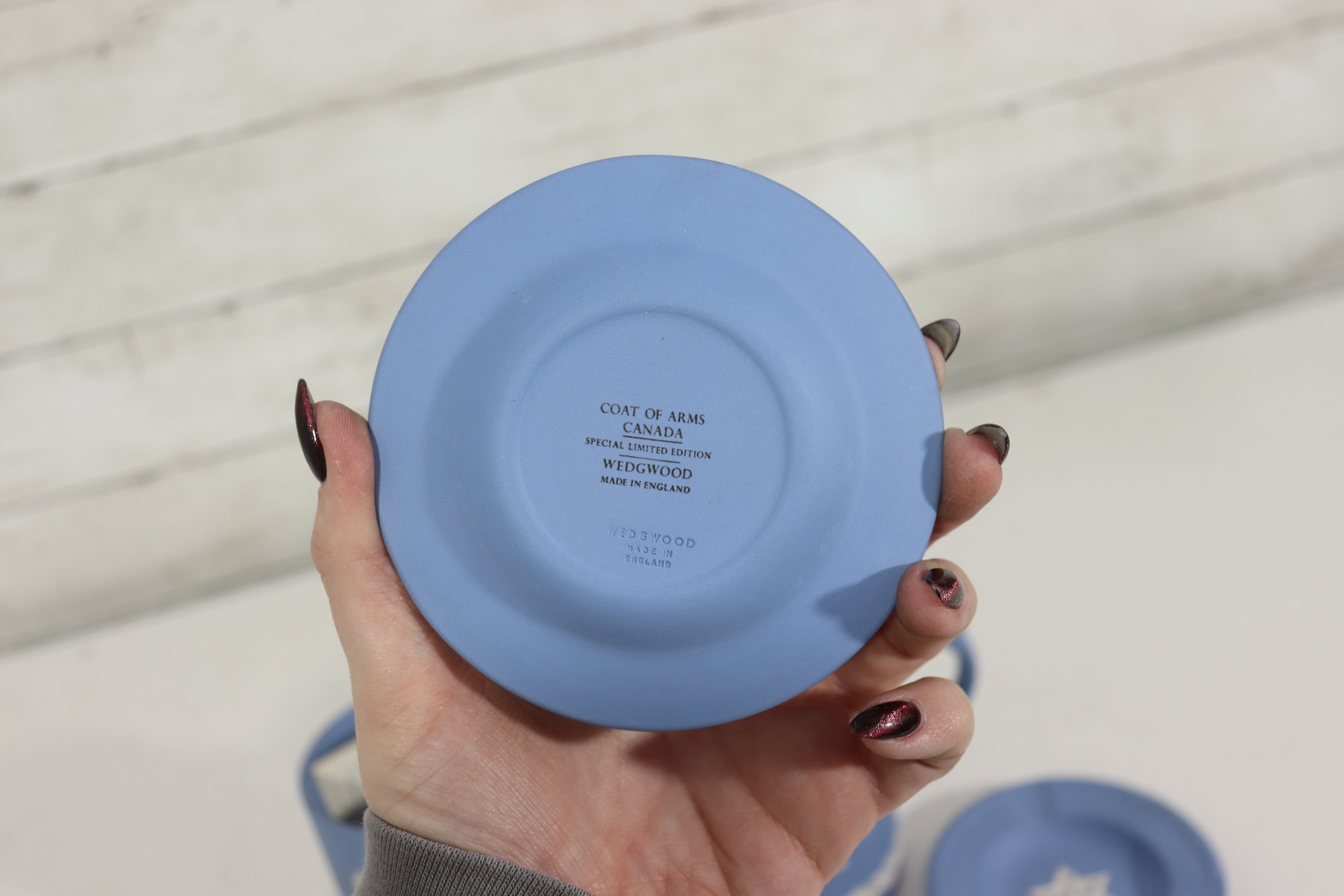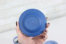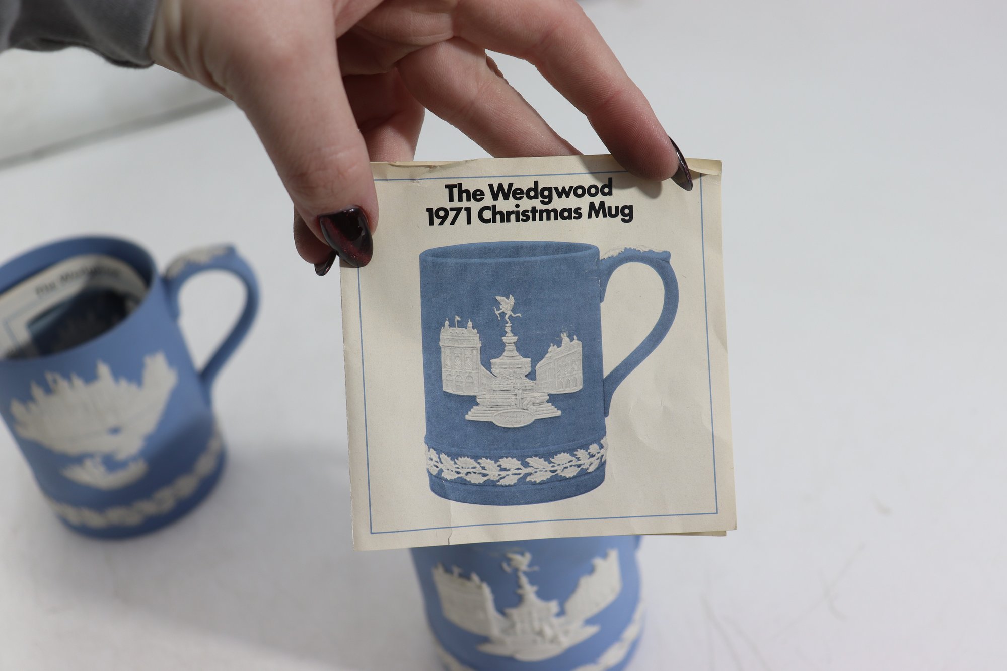 a collectible lot of blue Wedgwood Jasperware, including 1971 Christmas mugs and an assortment of commemorative pin dishes / small plates. Executed in classic Wedgwood blue with white relief decoration, these pieces feature a variety of historic and symbolic motifs.