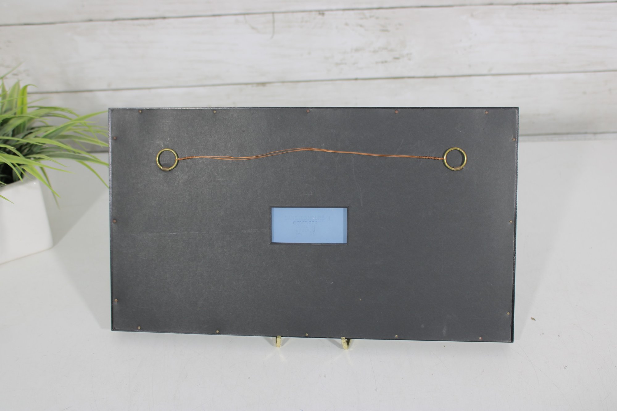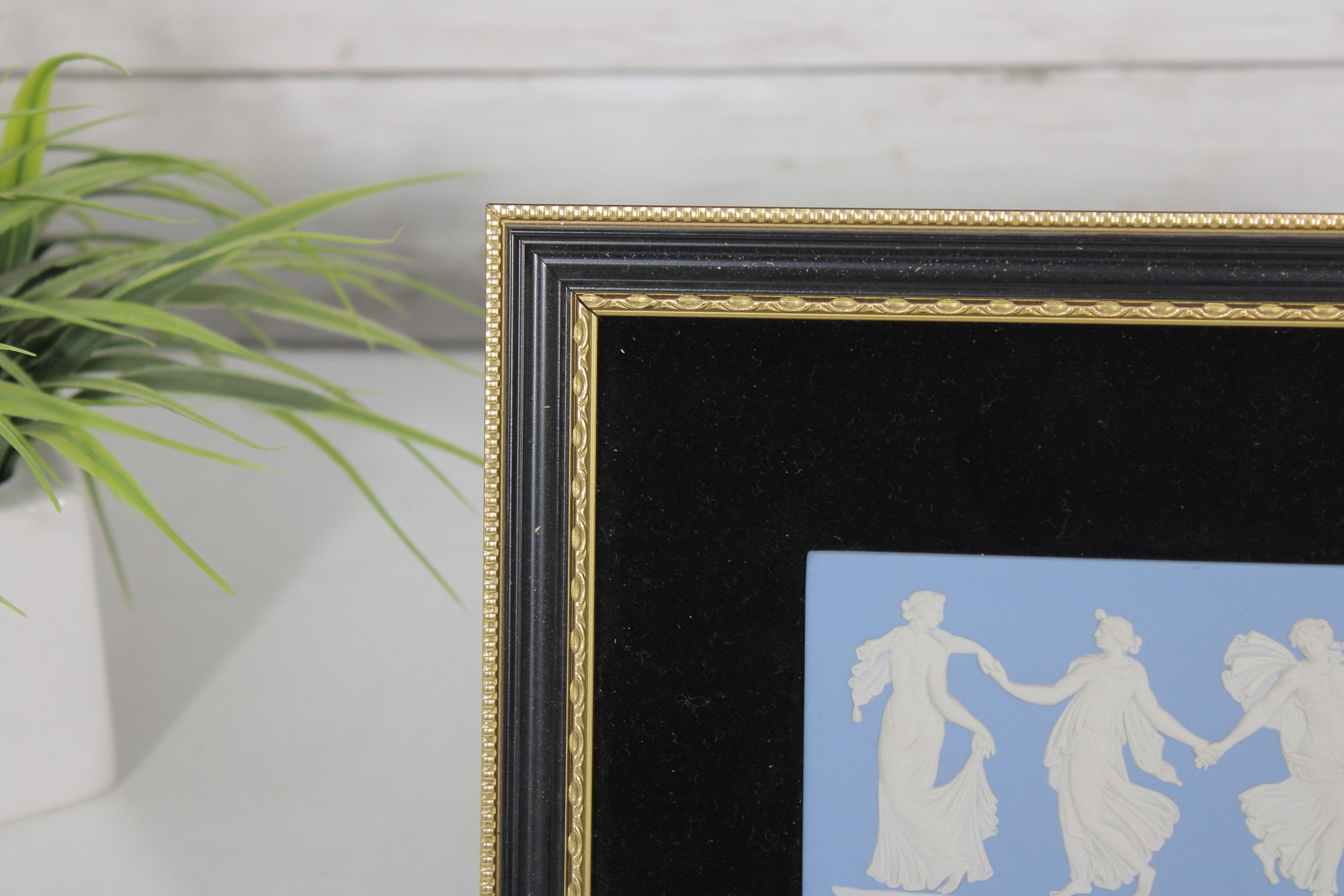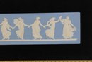 Wedgwood jasperware framed plaque featuring the classic white neoclassical dancing figures on a blue background. This timeless design is characteristic of Wedgwood’s iconic jasperware, inspired by classical Greek and Roman art.