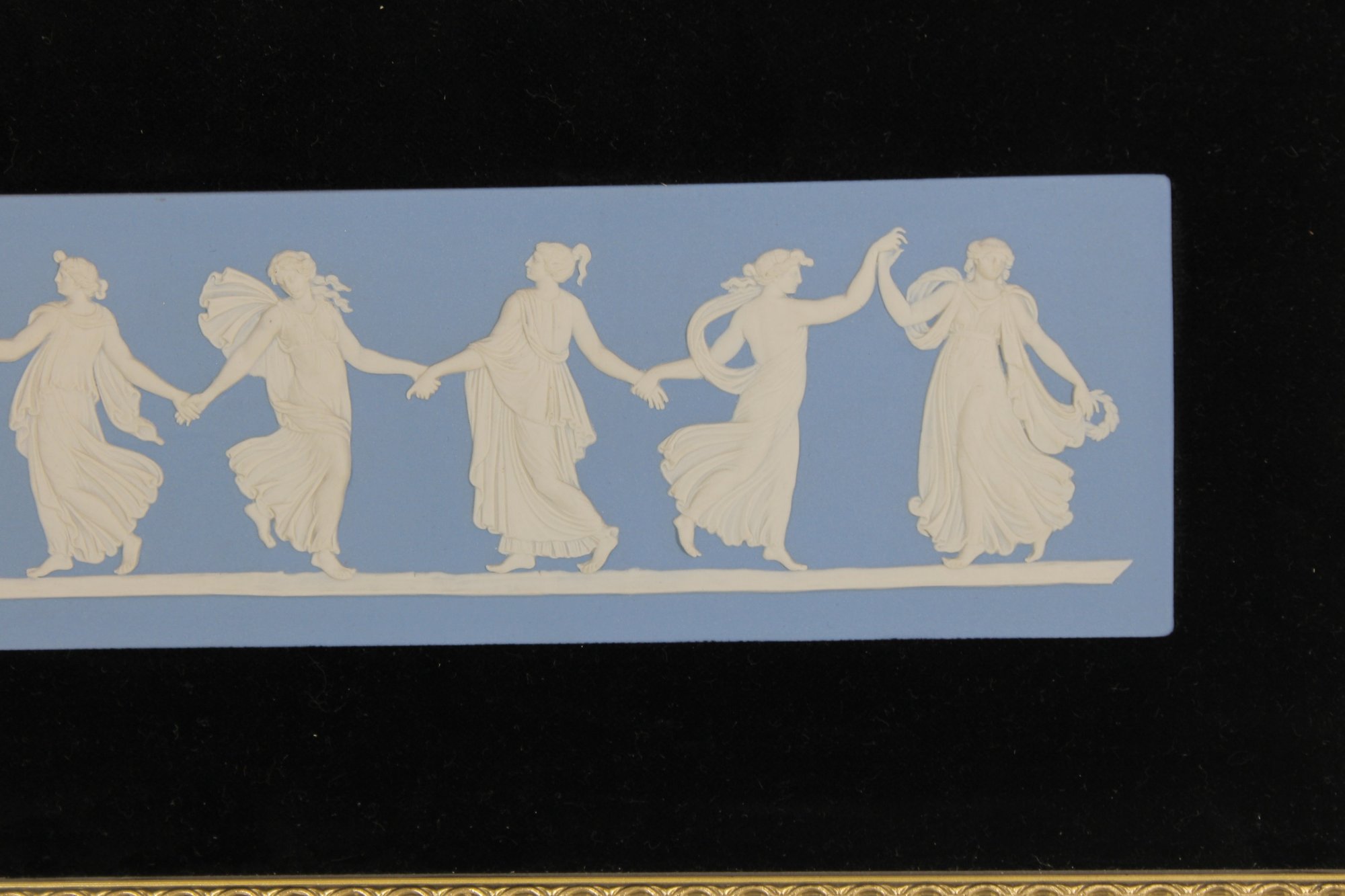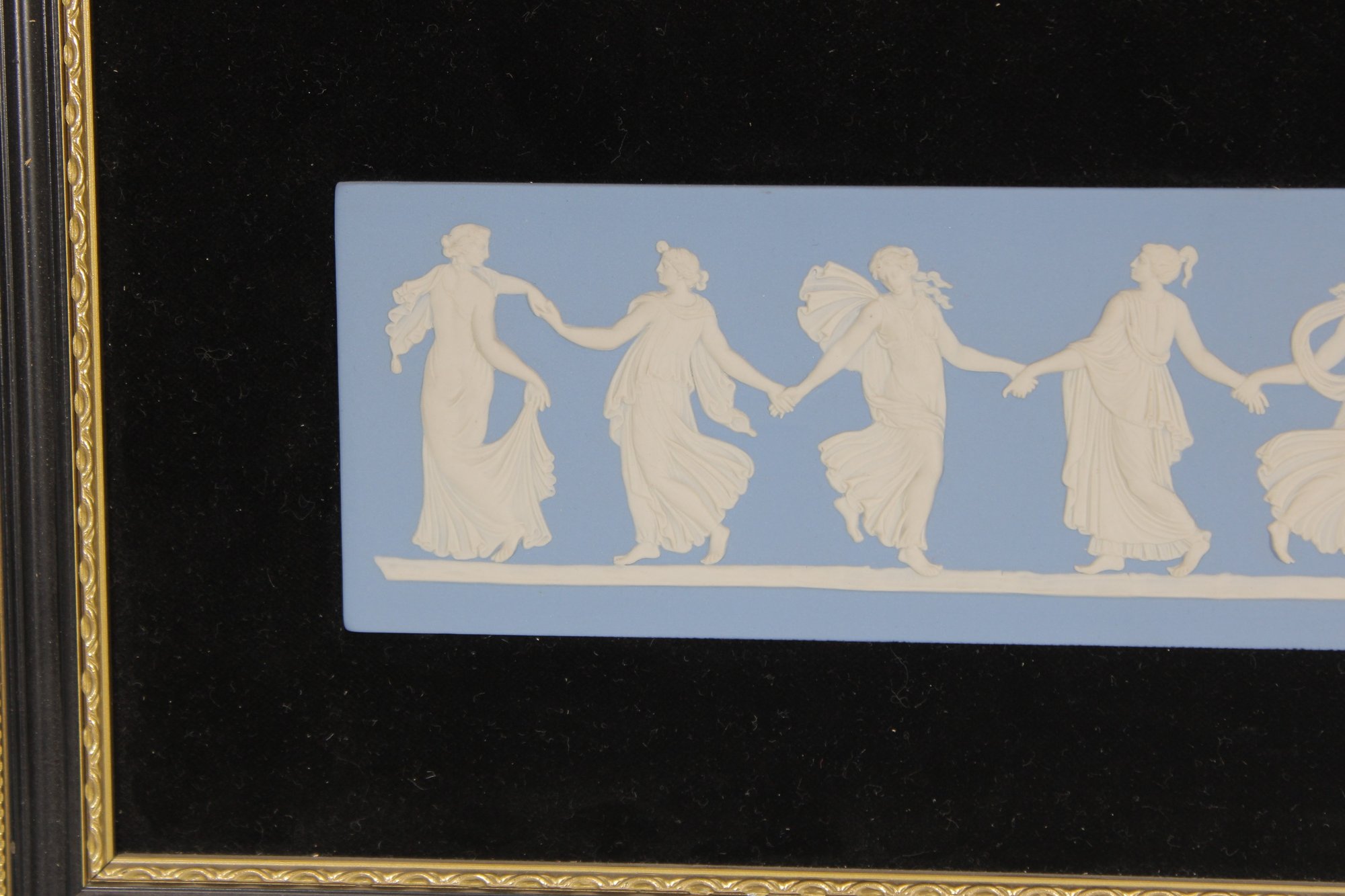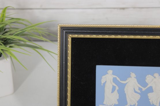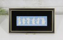 The plaque is beautifully mounted in a black velvet-style mat with a gold-tone frame, enhancing its refined presentation. The relief figures depict a graceful procession of dancers in flowing garments, a well-known Wedgwood motif.