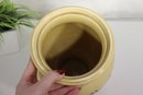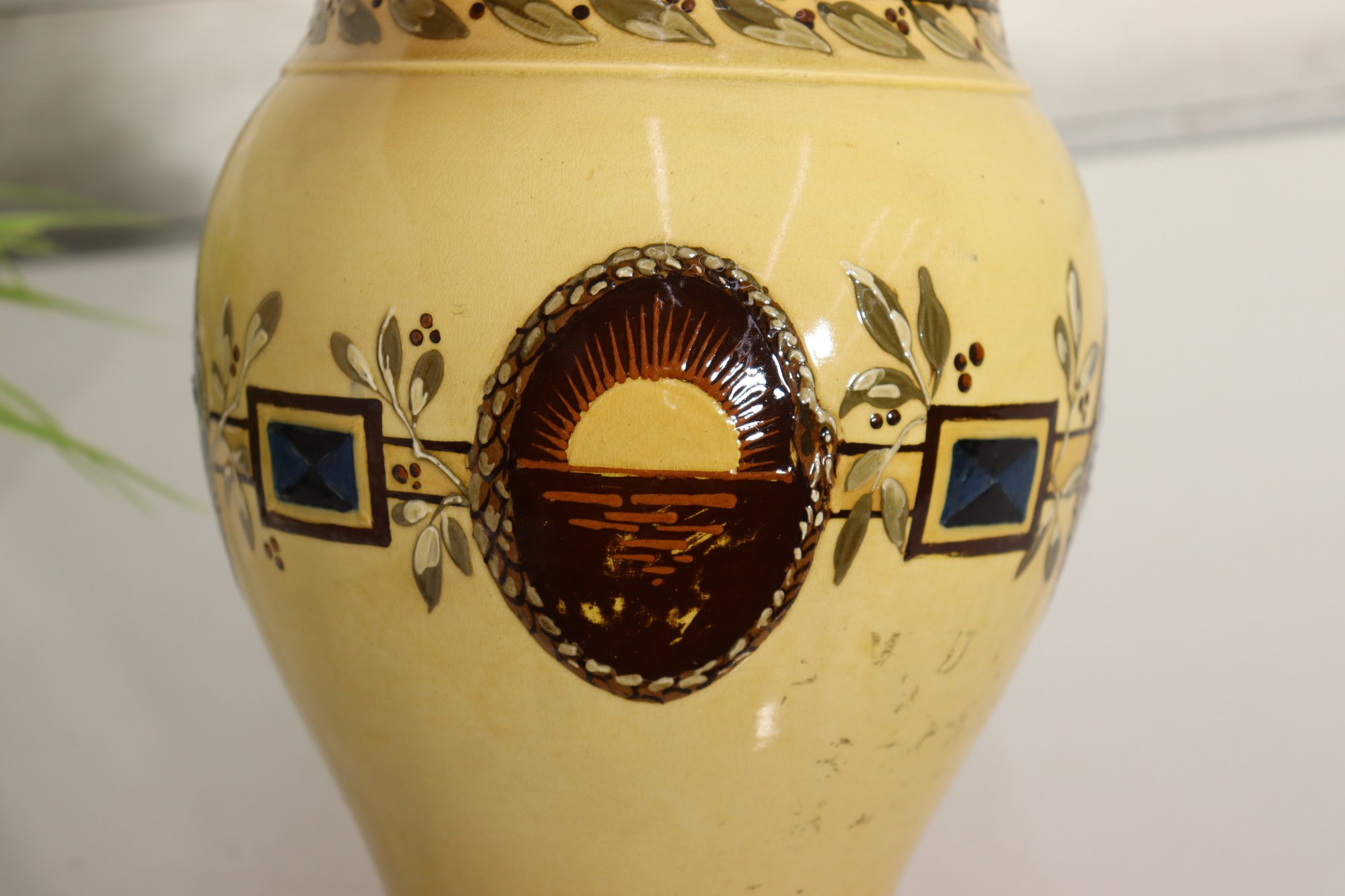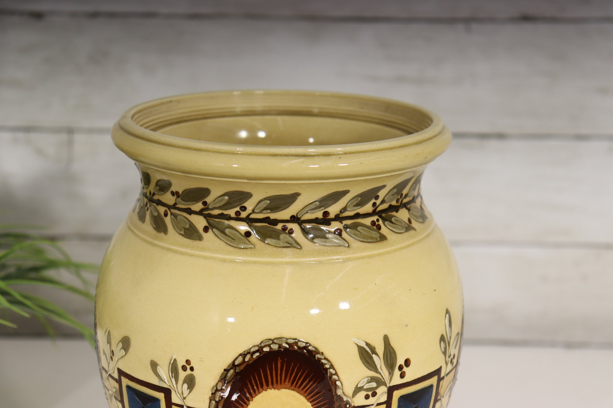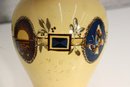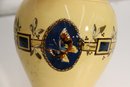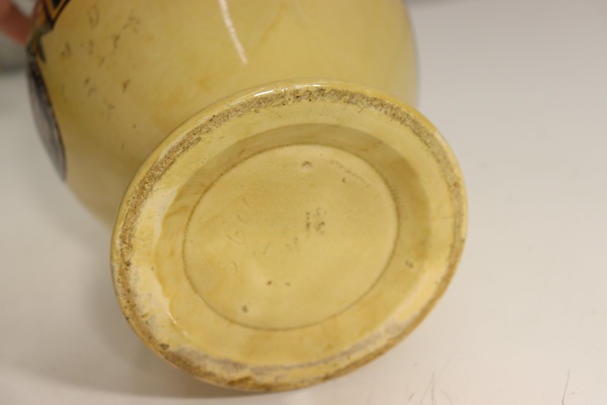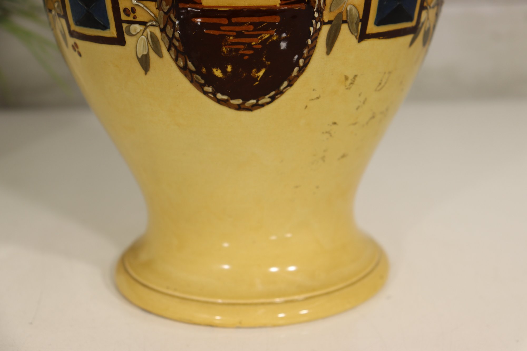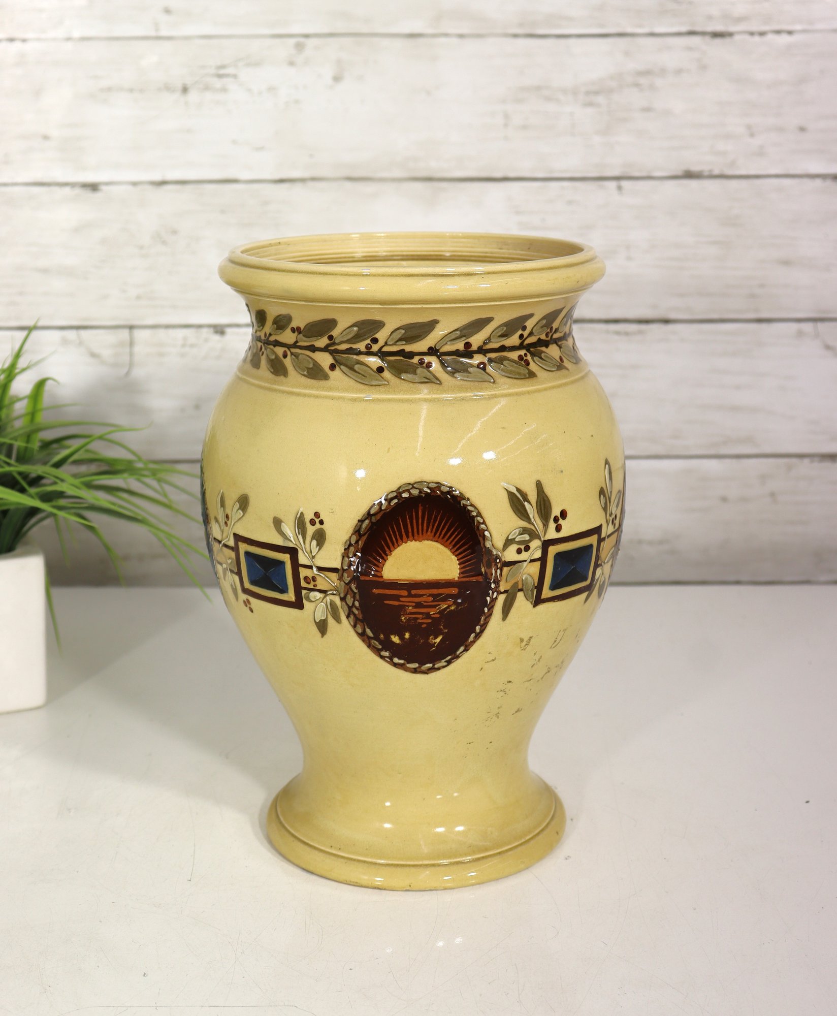 Wedgwood decorative ceramic vase featuring a warm yellow ground accented with hand-painted floral motifs, geometric panels, and oval medallions with figural decoration. The design is further enhanced with scrolling border details around the shoulder and a classic flared rim.