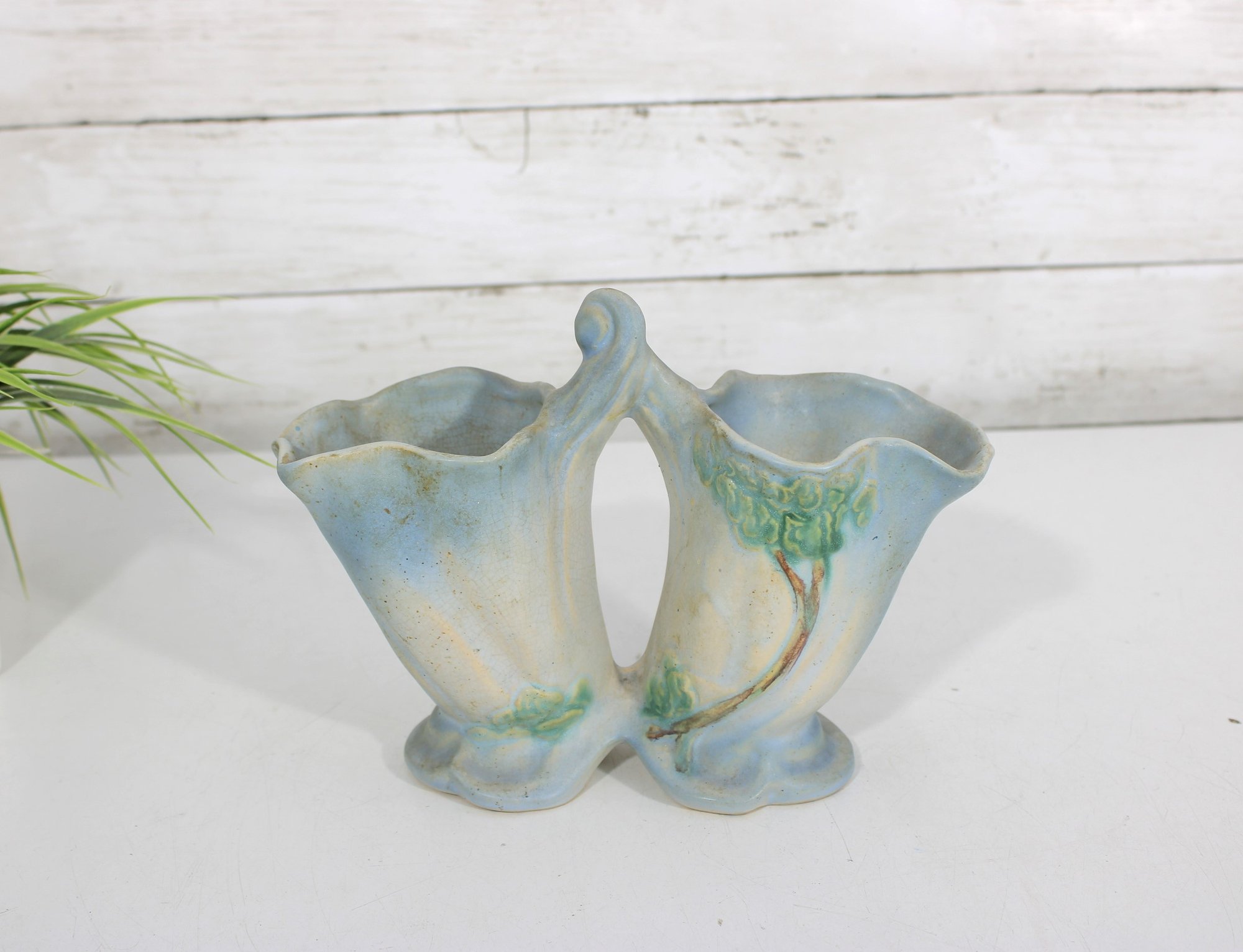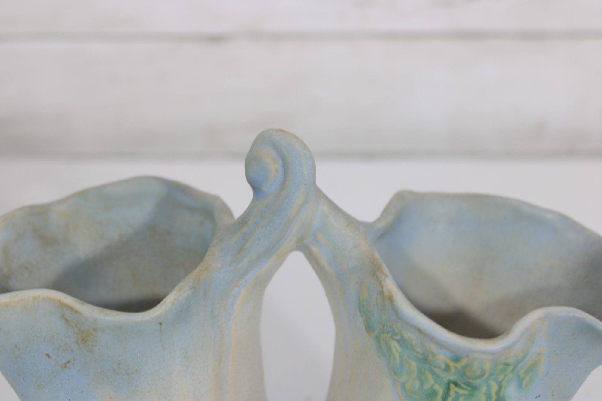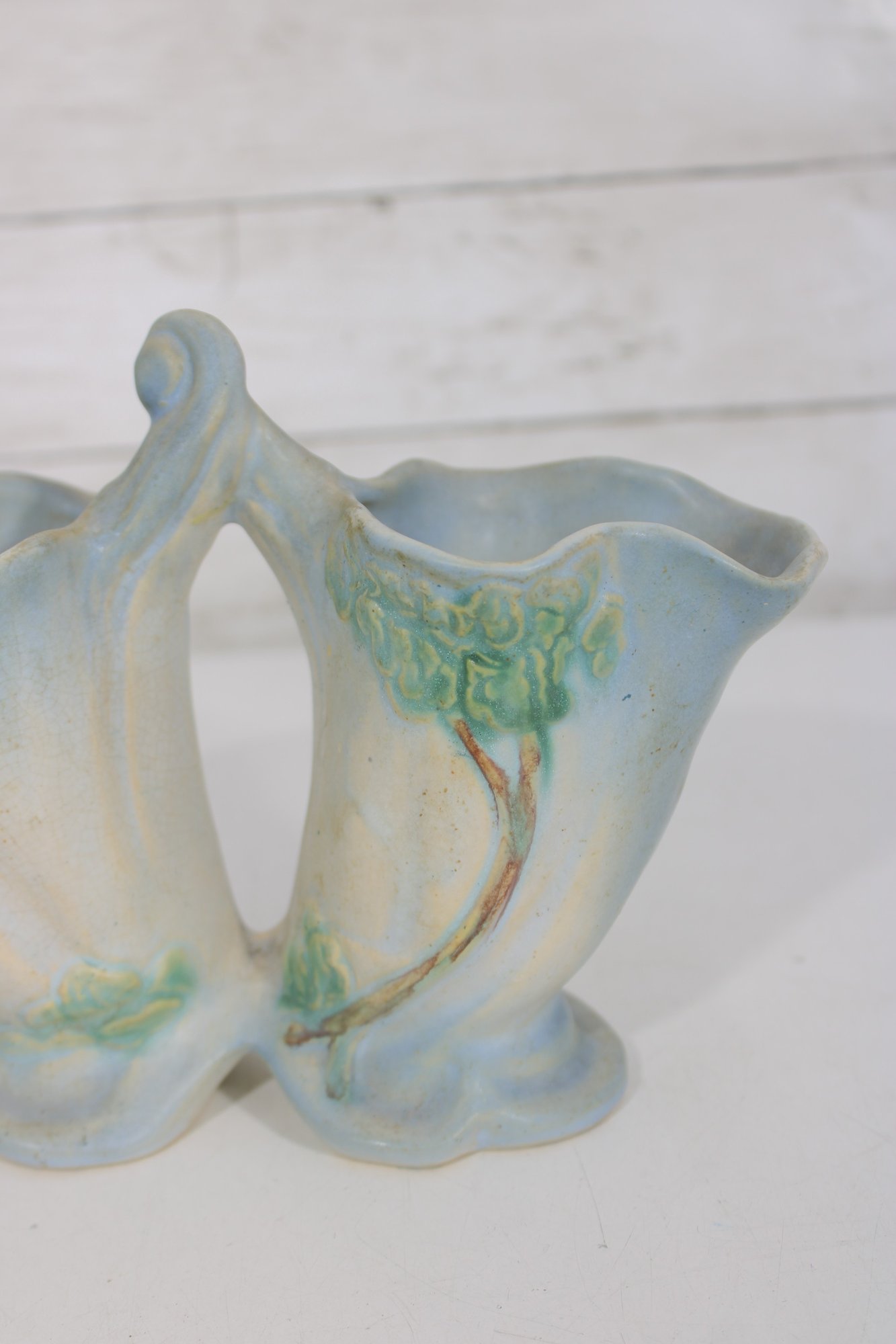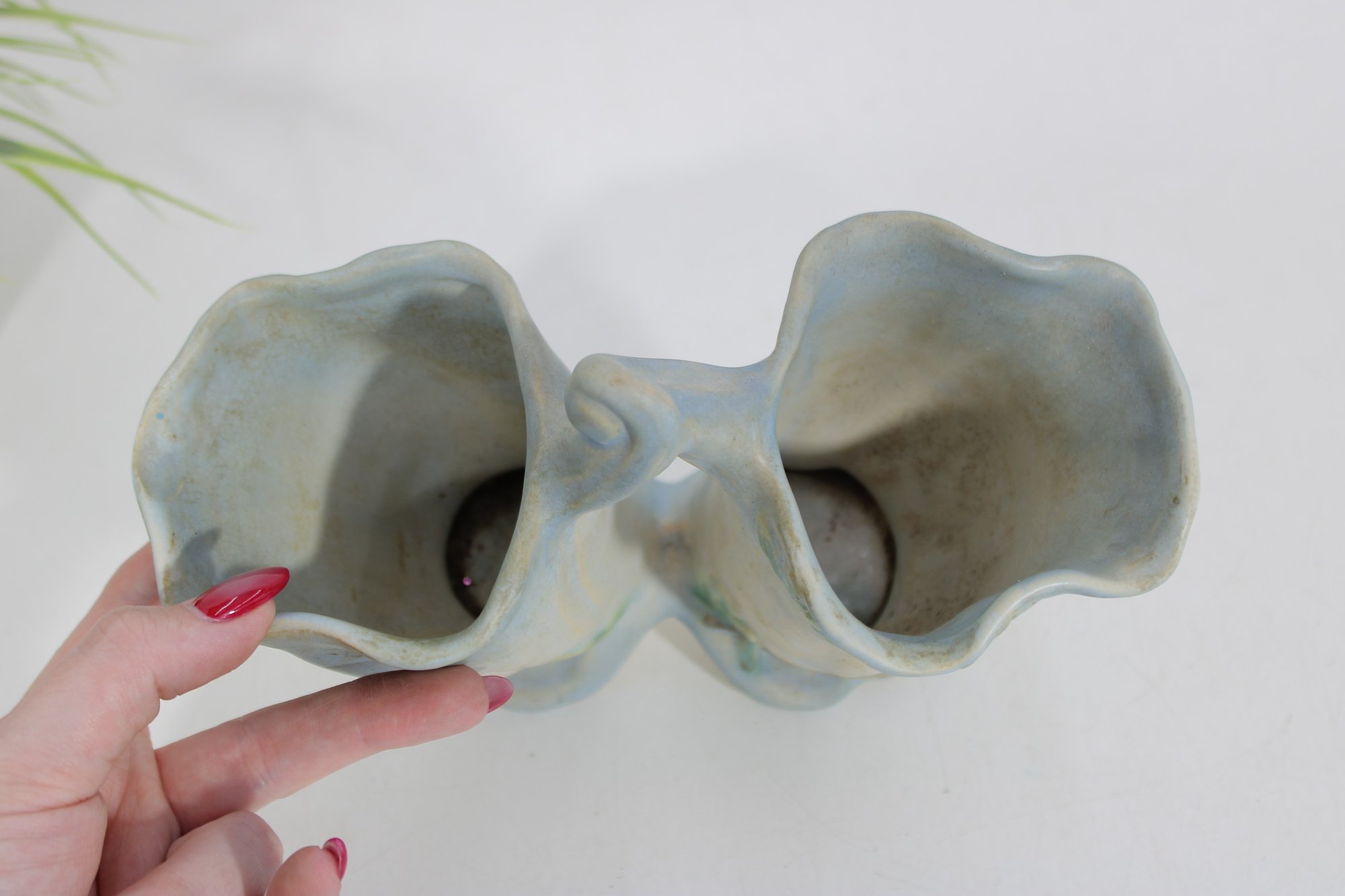 Beautiful vintage Weller pottery double bud vase featuring an elegant Art Nouveau-inspired design. The twin vase form is joined by a central handle, with softly scalloped rims and flowing lines that create a graceful, sculptural silhouette.